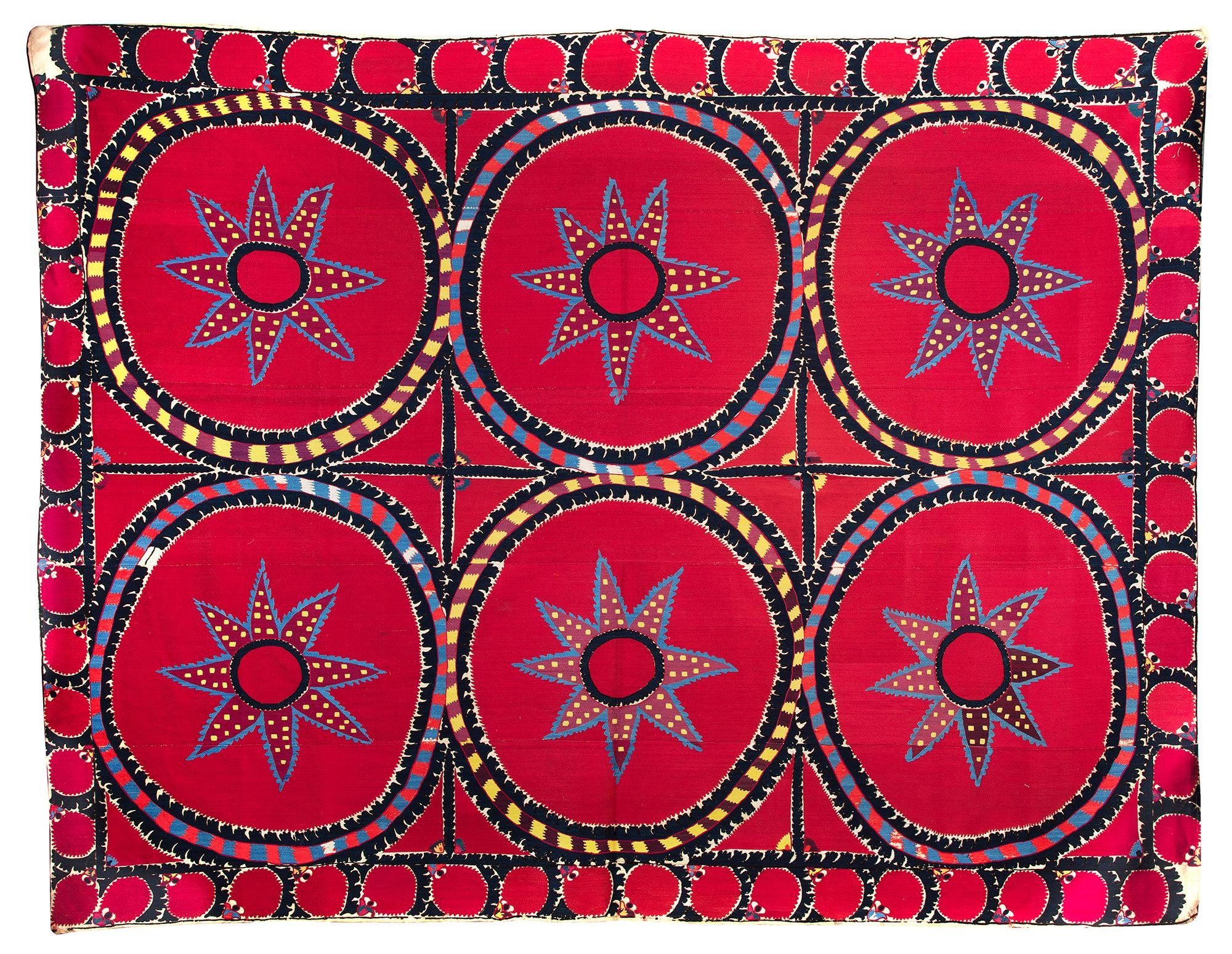 Entirely couched in silk with six large magenta roundels with blue yellow chevron star centers. Borders sewn down. 275 by 200 cm.
