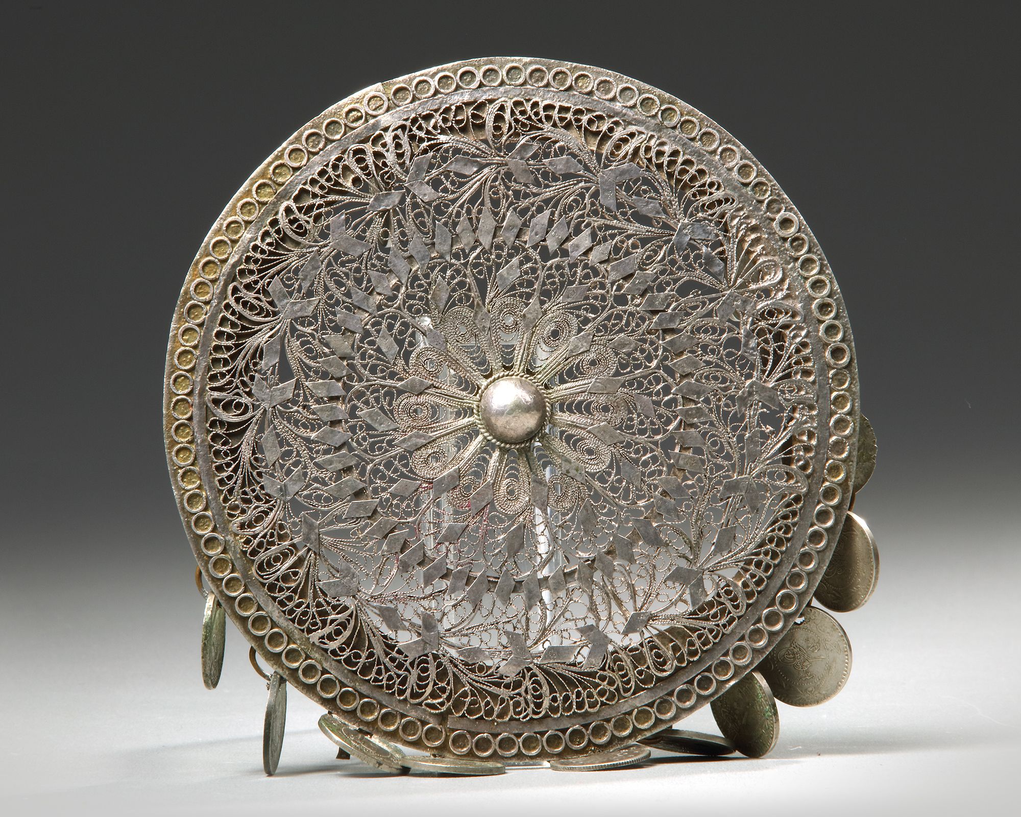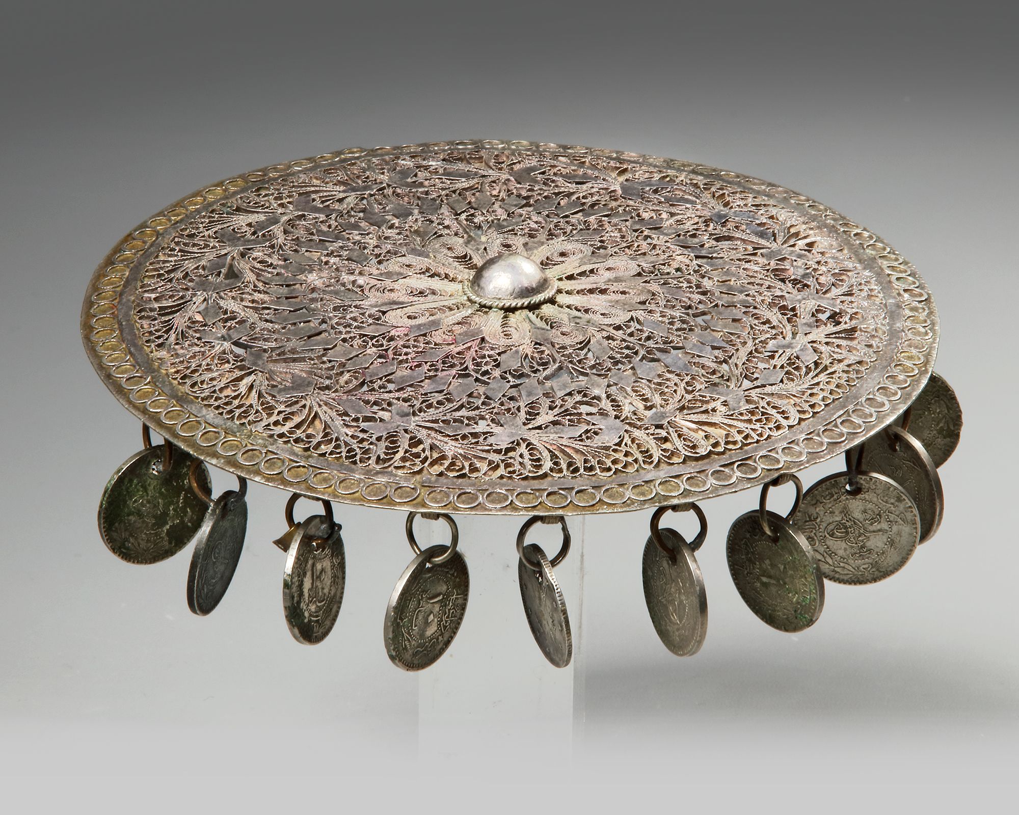 An ottoman silver female Tepelik (head decoration), with floral motifs and Ottoman coins. 13 cm diameter.