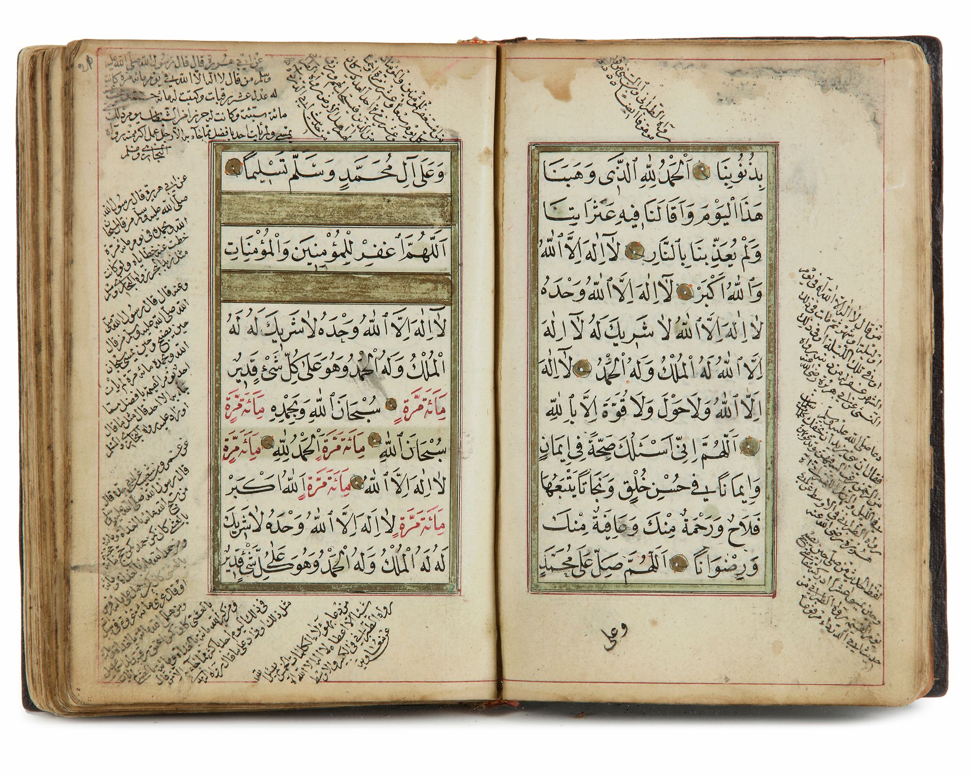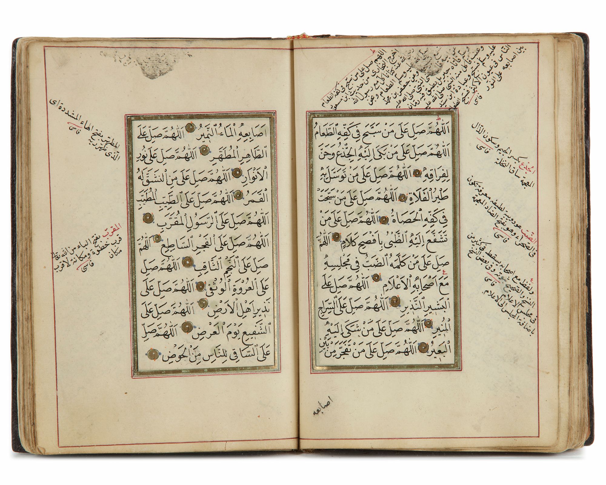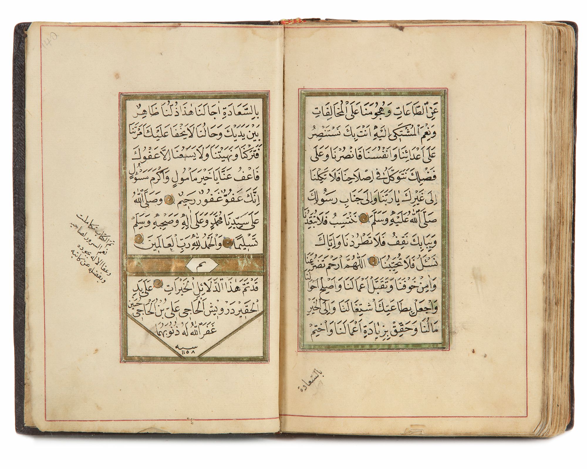 Three manuscripts in one volume: Kitâb al-azkâr bil 'Asha Wal-Abkâr and Dalâil al-Khayrat Arabic manuscript of 140 sheets of eleven lines per page in beautiful and regular naskh in black ink, starting with an illuminated banner preceding the title of the first manuscript 'Kitâb al-azkâr bil-'asha wal-abkâr' and preceding l illumination of the beginning of this manuscript (pages 1 to 30). The second manuscript 'Ta'lif bikitâb Dalâil al-Khayrât' (from 33B to 40B). The third and most important manuscript (from page 40B to the end) Jazuli. "Dalâil al-Khayrât, with the opening frontispiece at the beginning, the" Asmâ al-Hosna 'on seven pages preceding the illuminated double page representing the two sacred sites, then follow the many prayers until the end. 16 by 10.5 cm.