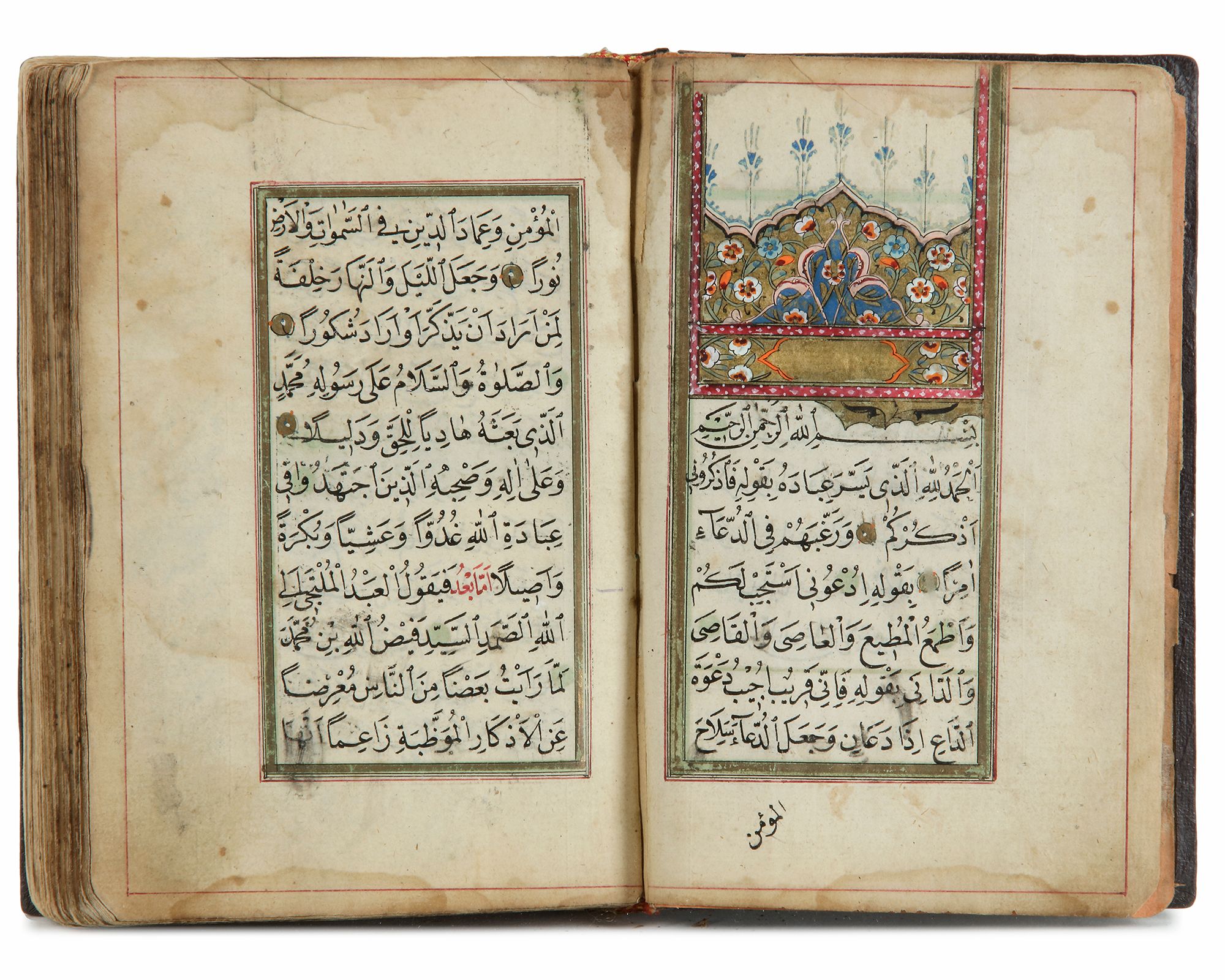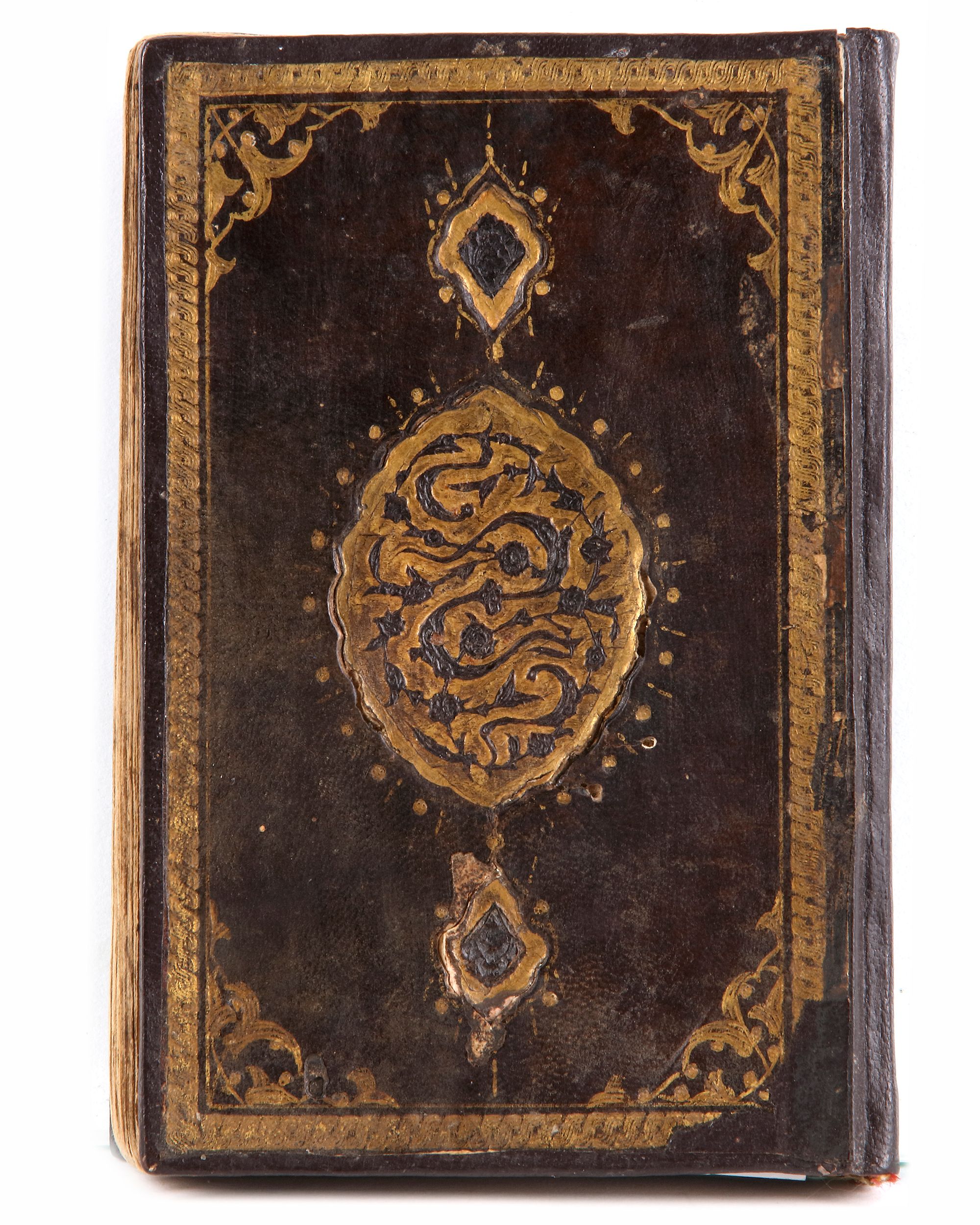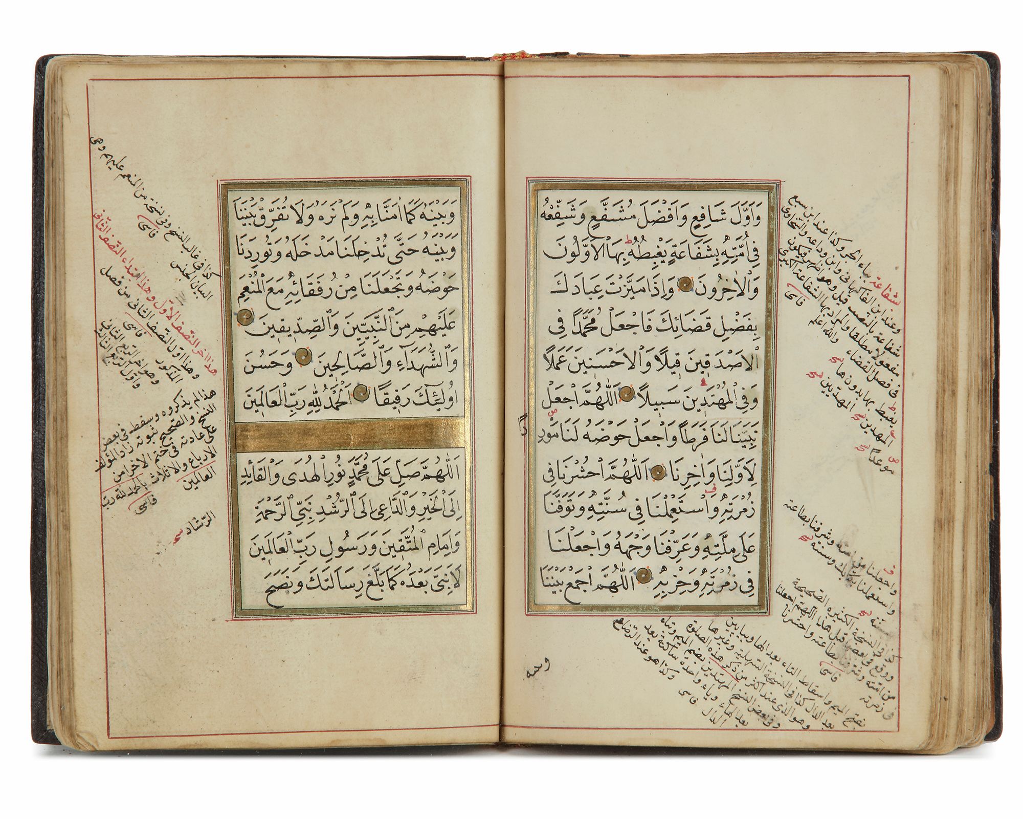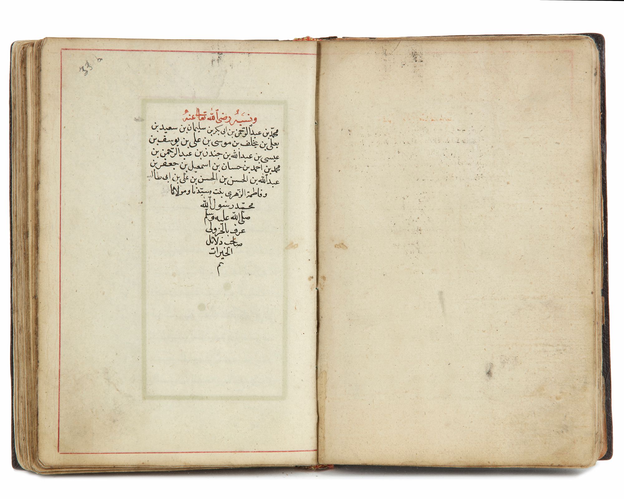 Three manuscripts in one volume: Kitâb al-azkâr bil 'Asha Wal-Abkâr and Dalâil al-Khayrat Arabic manuscript of 140 sheets of eleven lines per page in beautiful and regular naskh in black ink, starting with an illuminated banner preceding the title of the first manuscript 'Kitâb al-azkâr bil-'asha wal-abkâr' and preceding l illumination of the beginning of this manuscript (pages 1 to 30). The second manuscript 'Ta'lif bikitâb Dalâil al-Khayrât' (from 33B to 40B). The third and most important manuscript (from page 40B to the end) Jazuli. "Dalâil al-Khayrât, with the opening frontispiece at the beginning, the" Asmâ al-Hosna 'on seven pages preceding the illuminated double page representing the two sacred sites, then follow the many prayers until the end. 16 by 10.5 cm.