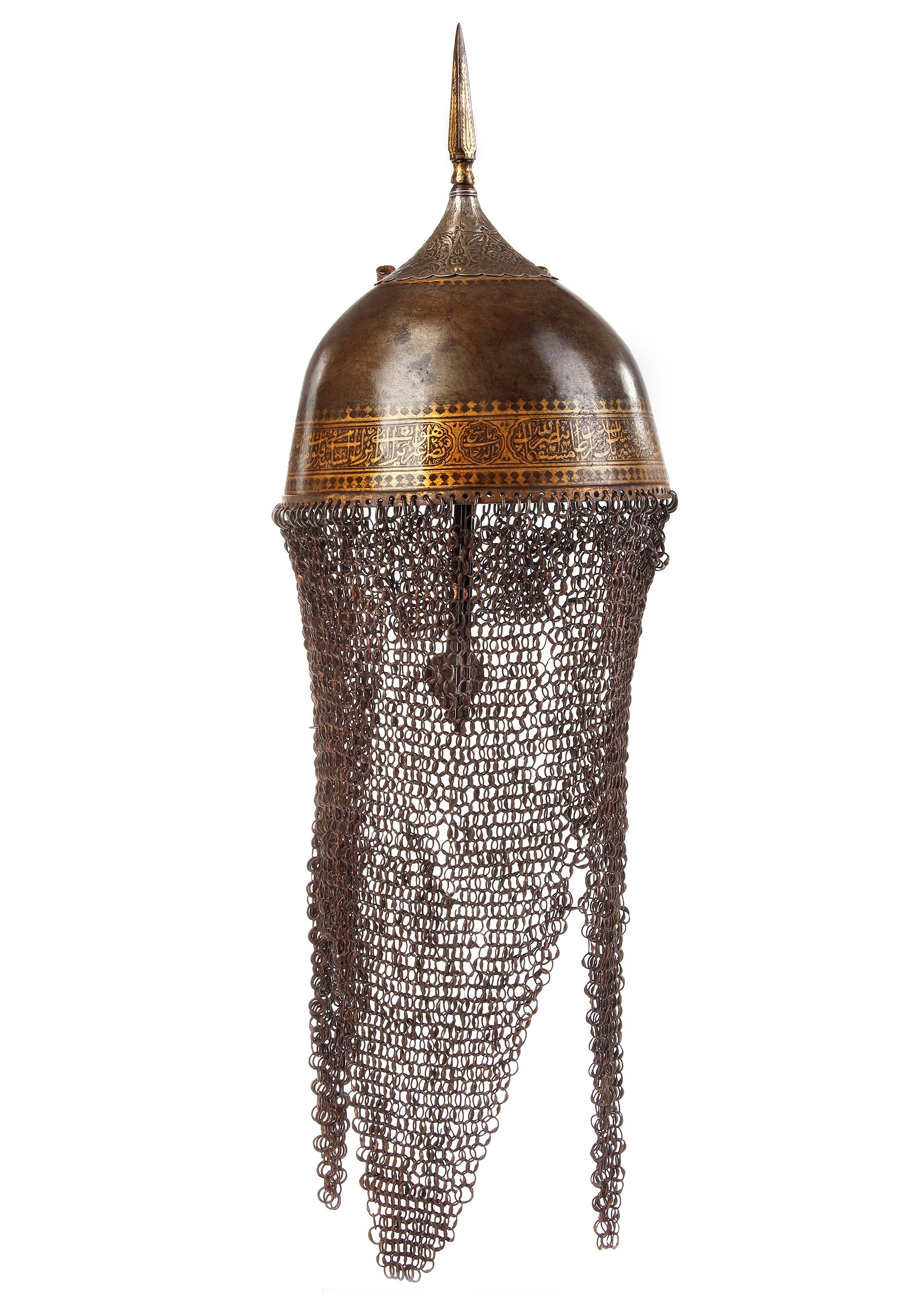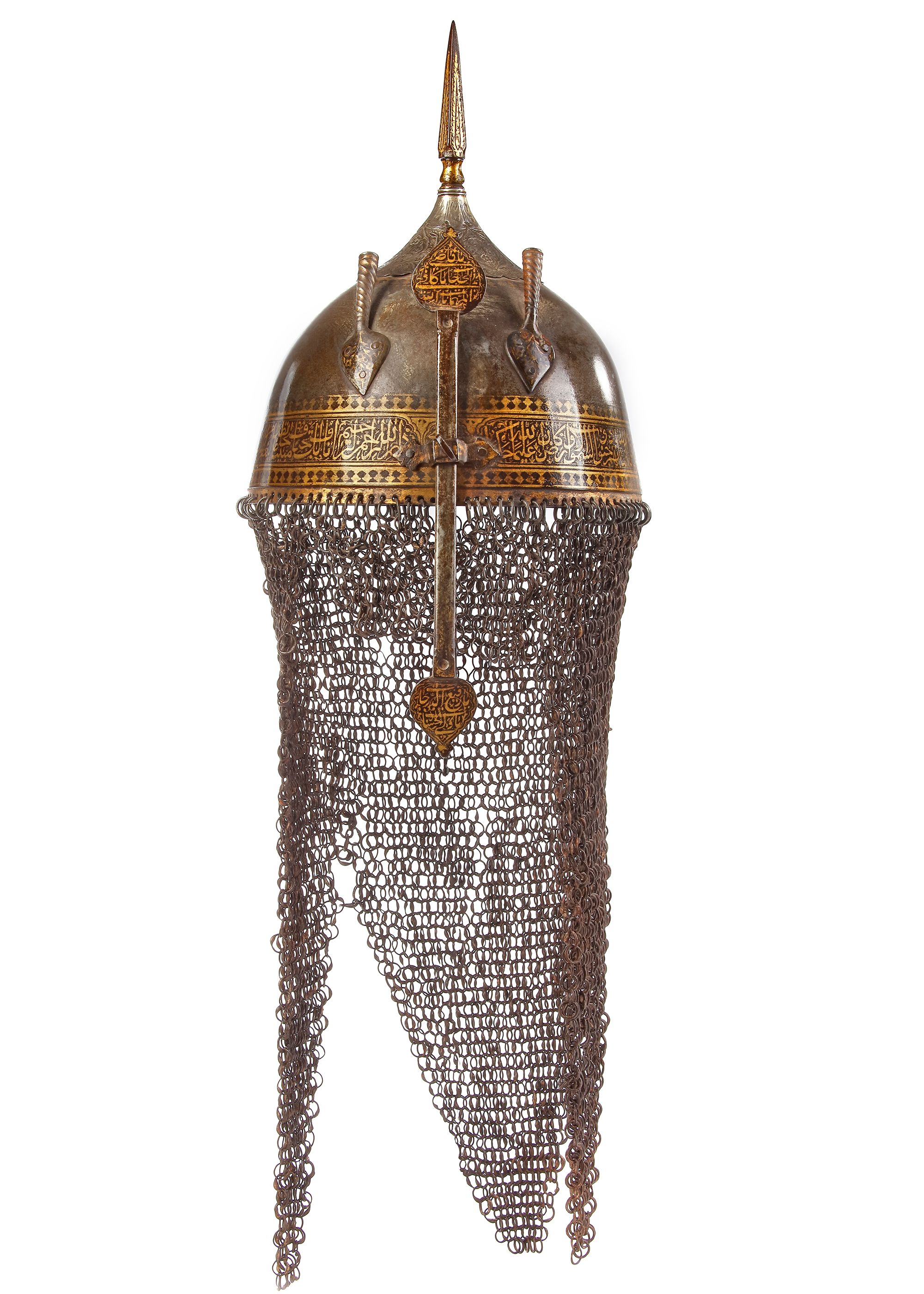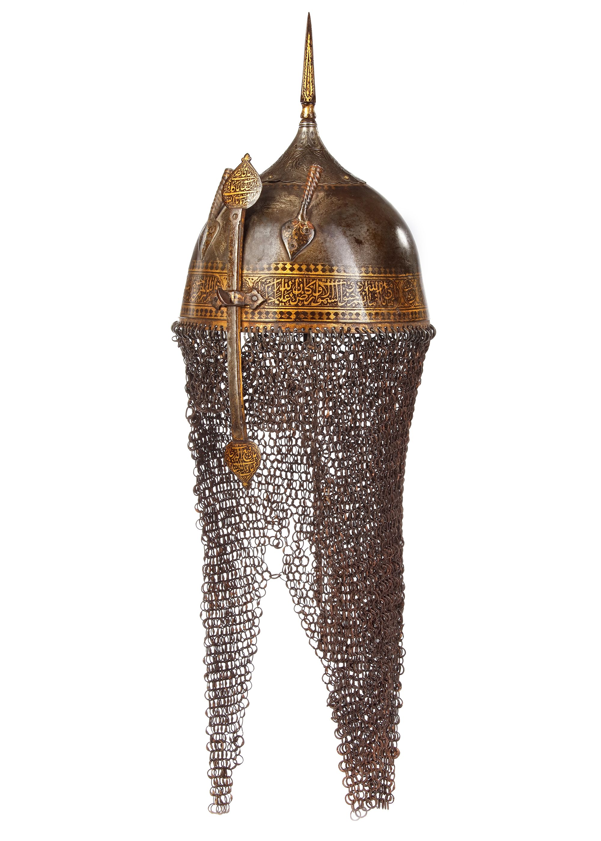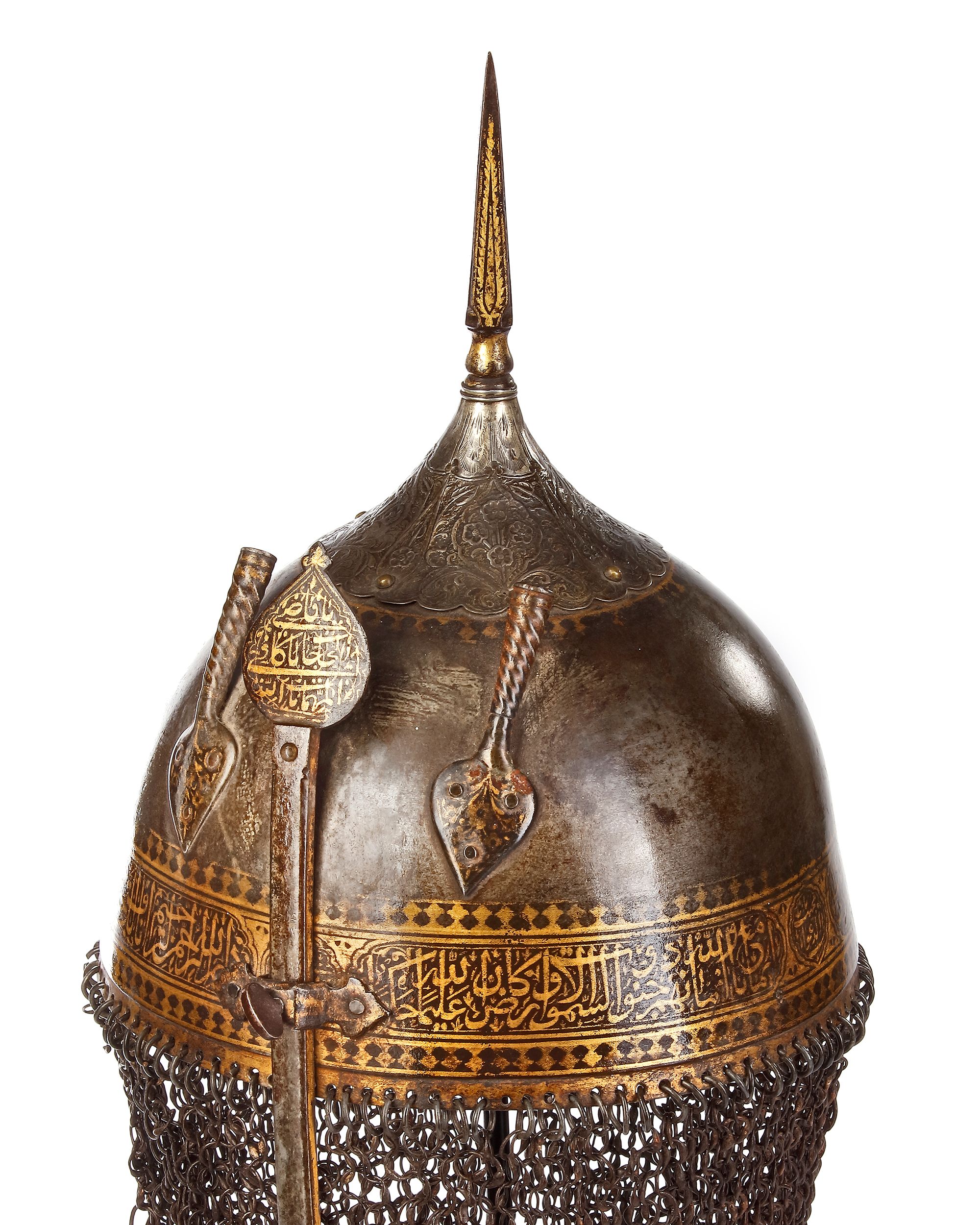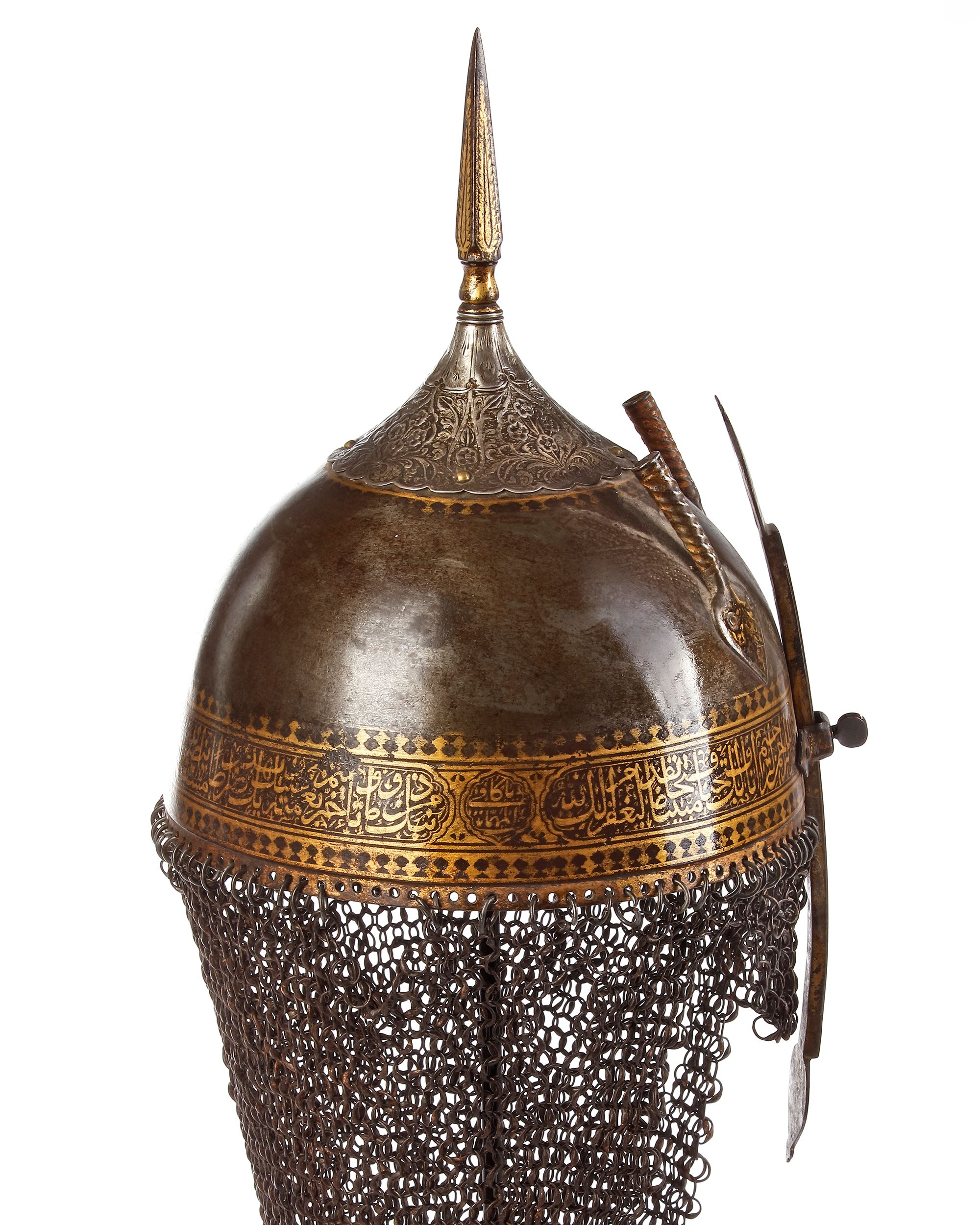 The steel helmet of tall domed form with movable nasal guard flanked by two plume holders, gold-overlaid calligraphic band with stylized borders along rim, the spike finial on chased foliate mount, camail of chain mail.