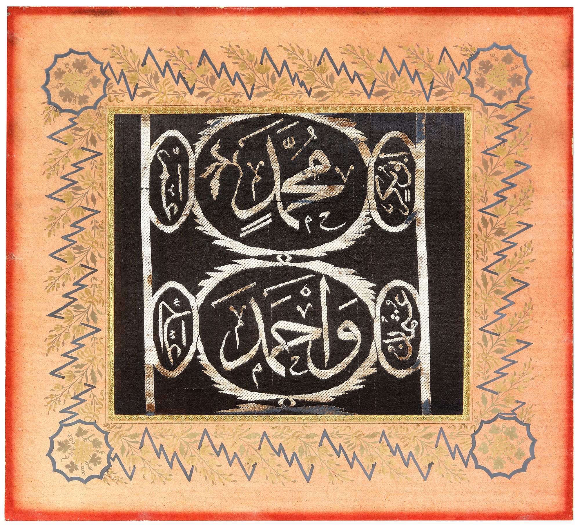 Of figured silk, probably from a tomb cover, the black satin ground woven with a column of two linked ovals each with a silver thread thuluth inscription flanked at each side by a similar smaller panel, a single band of inscription above. The two large roundels enclosing names of the prophet, flanked by smaller roundels containing the names of Four Caliphs: Abu Bakr, Omer, Ottoman and Ali. Mounted on album paper, gilt and decorated with grapes and floral scrolls. 32 by 30 cm. Textile: 18 by 20 cm.
