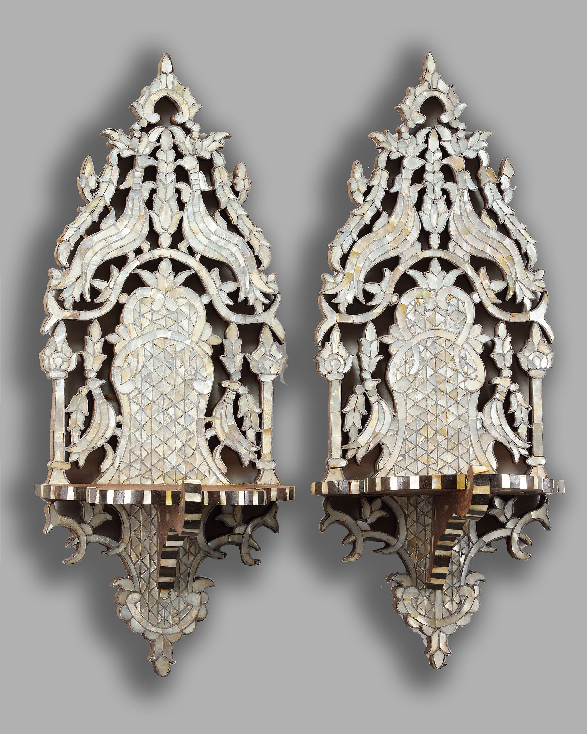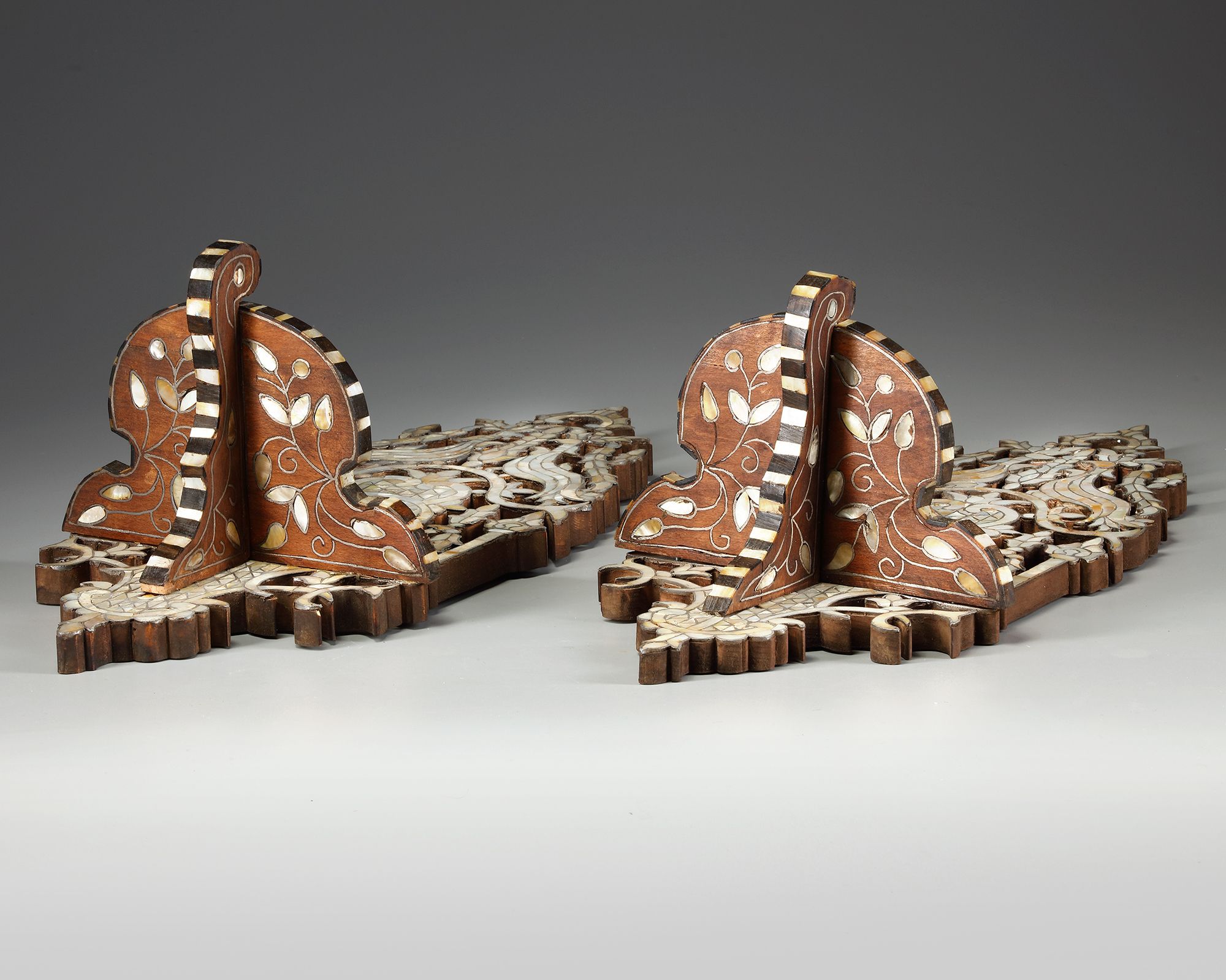 A pair of wooden mother-of-pearl inlaid turan holders, decorated in an openwork design.