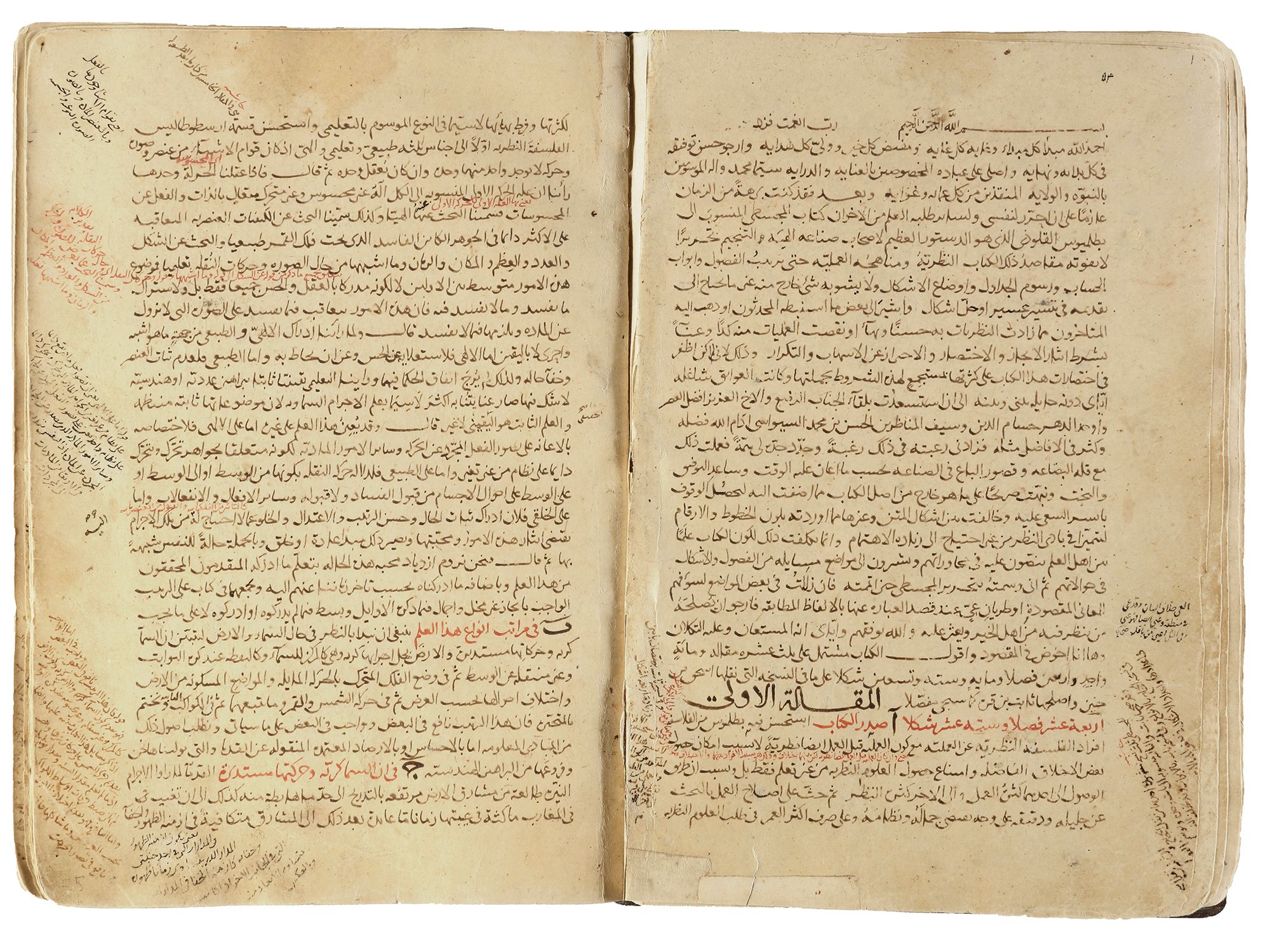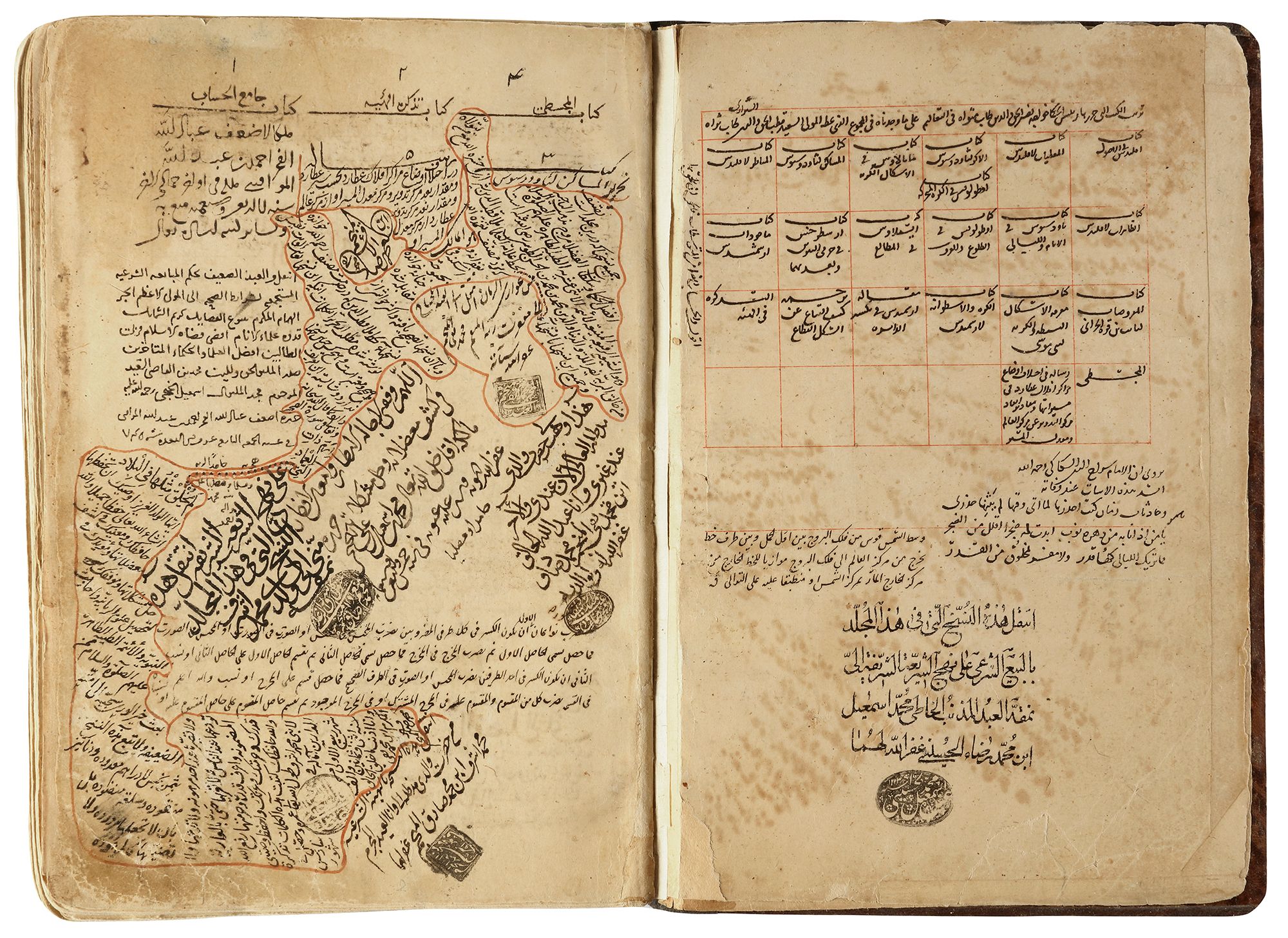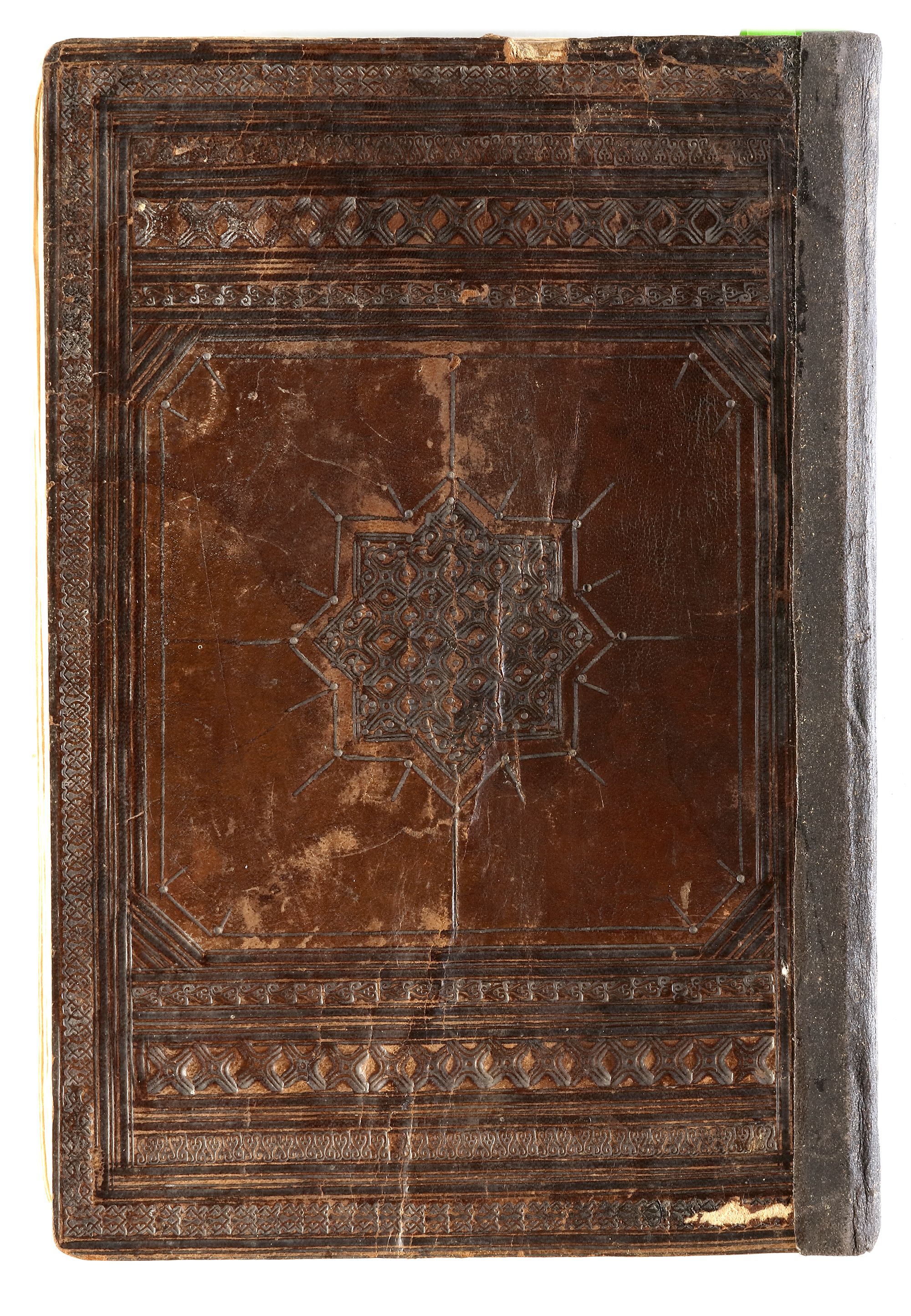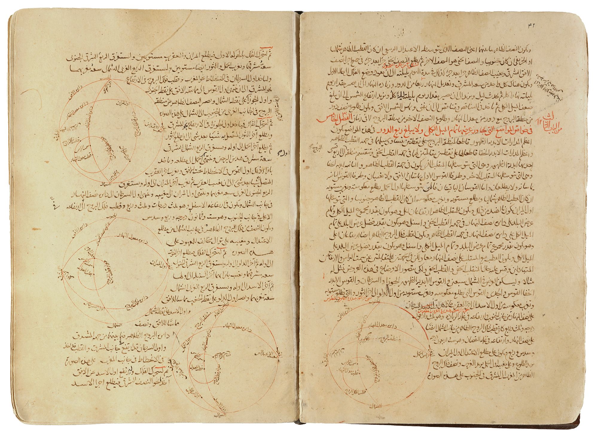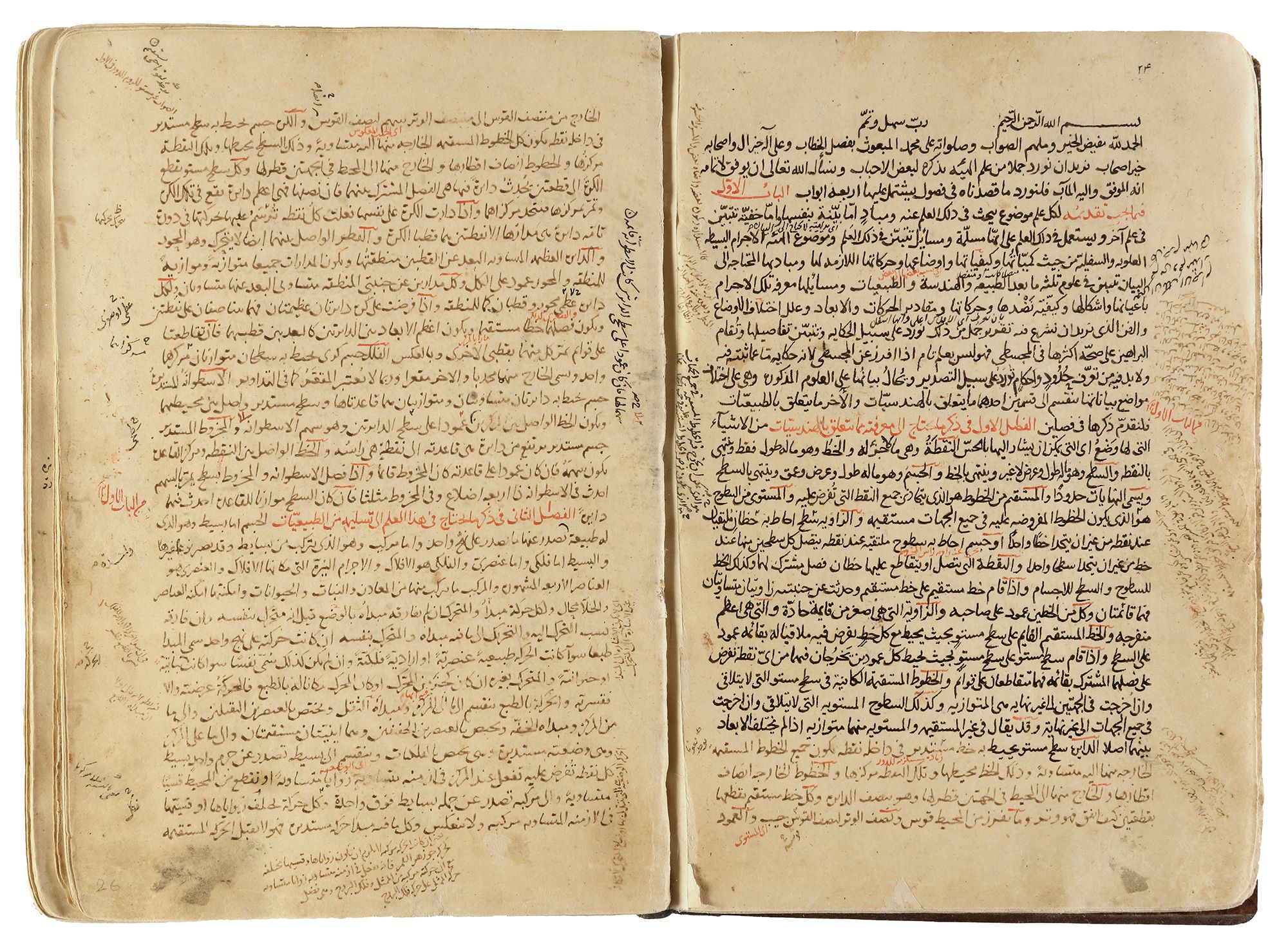 Five treatises on astronomy and mathematics. Arab manuscript on paper, 153 leaves plus two fly-leaves, each folio with 29 lines of flowing sepia naskh, important words and phrases picked out in red, numerous diagrams and tables throughout, some titles in strong larger naskh, copious marginal notes throughout in sepia and red. Later numbering in ink in the upper outer corners, small areas of staining and repair throughout. In 14th or 15th century Morocco binding with stamped geometric stellar motif and geometric borders, spine repaired, the doublures with scrolling arabesque. Folio: 24.4 by 16.6 cm.