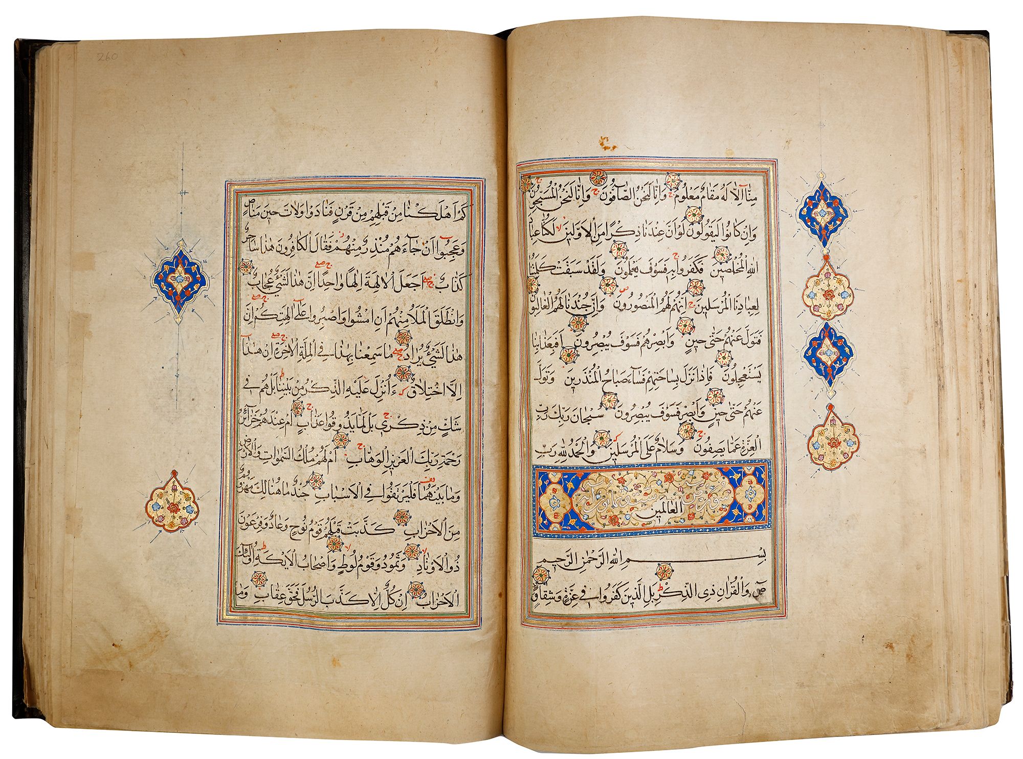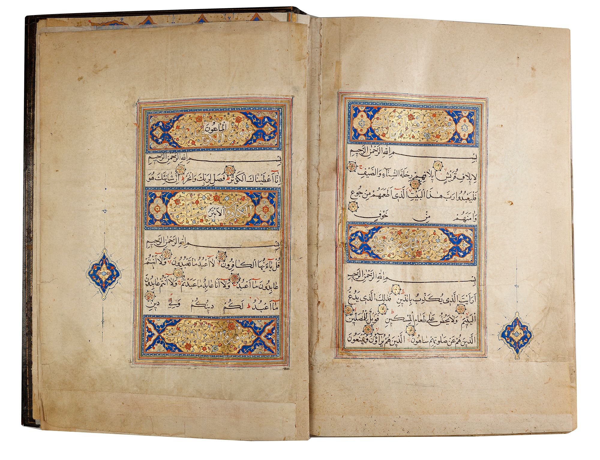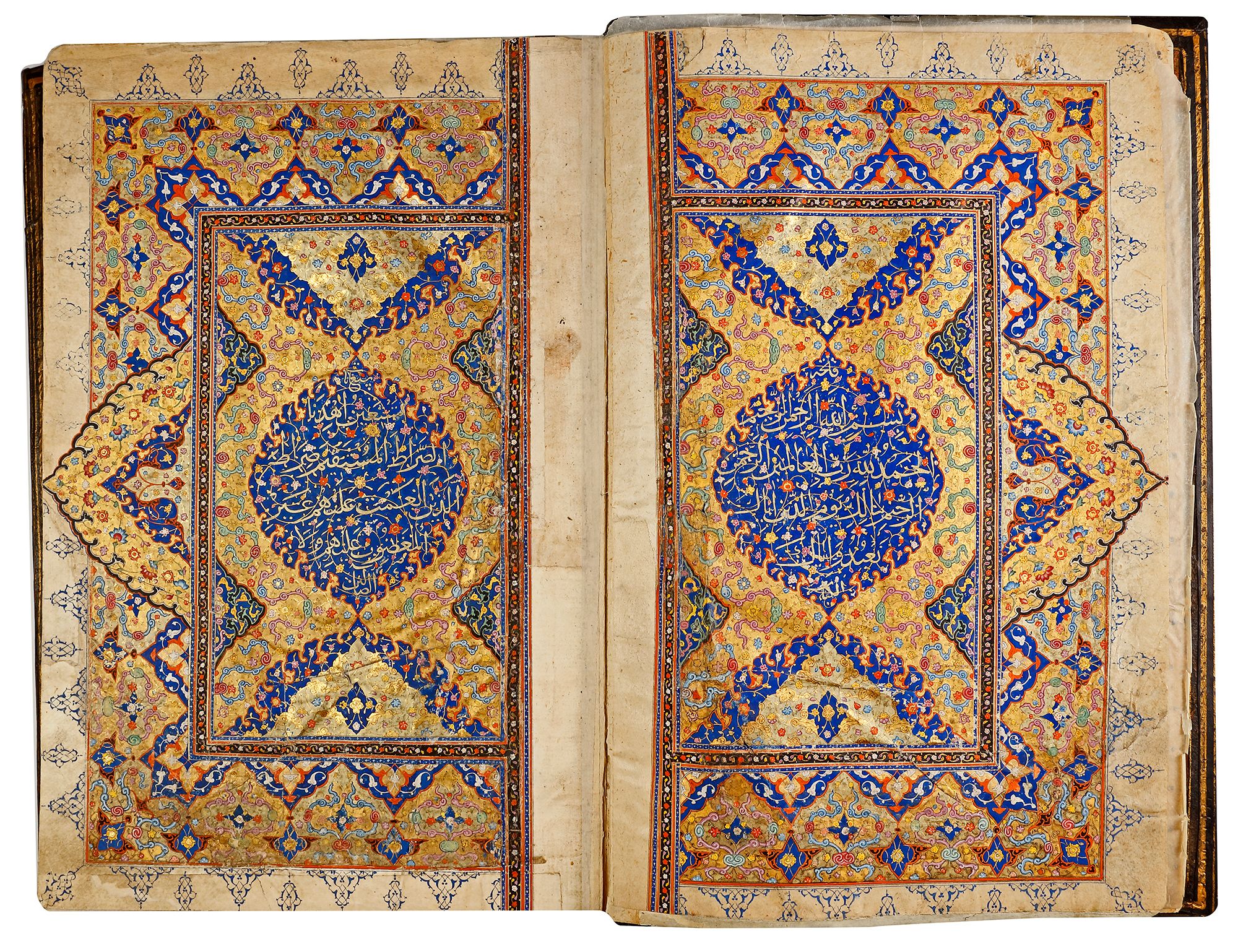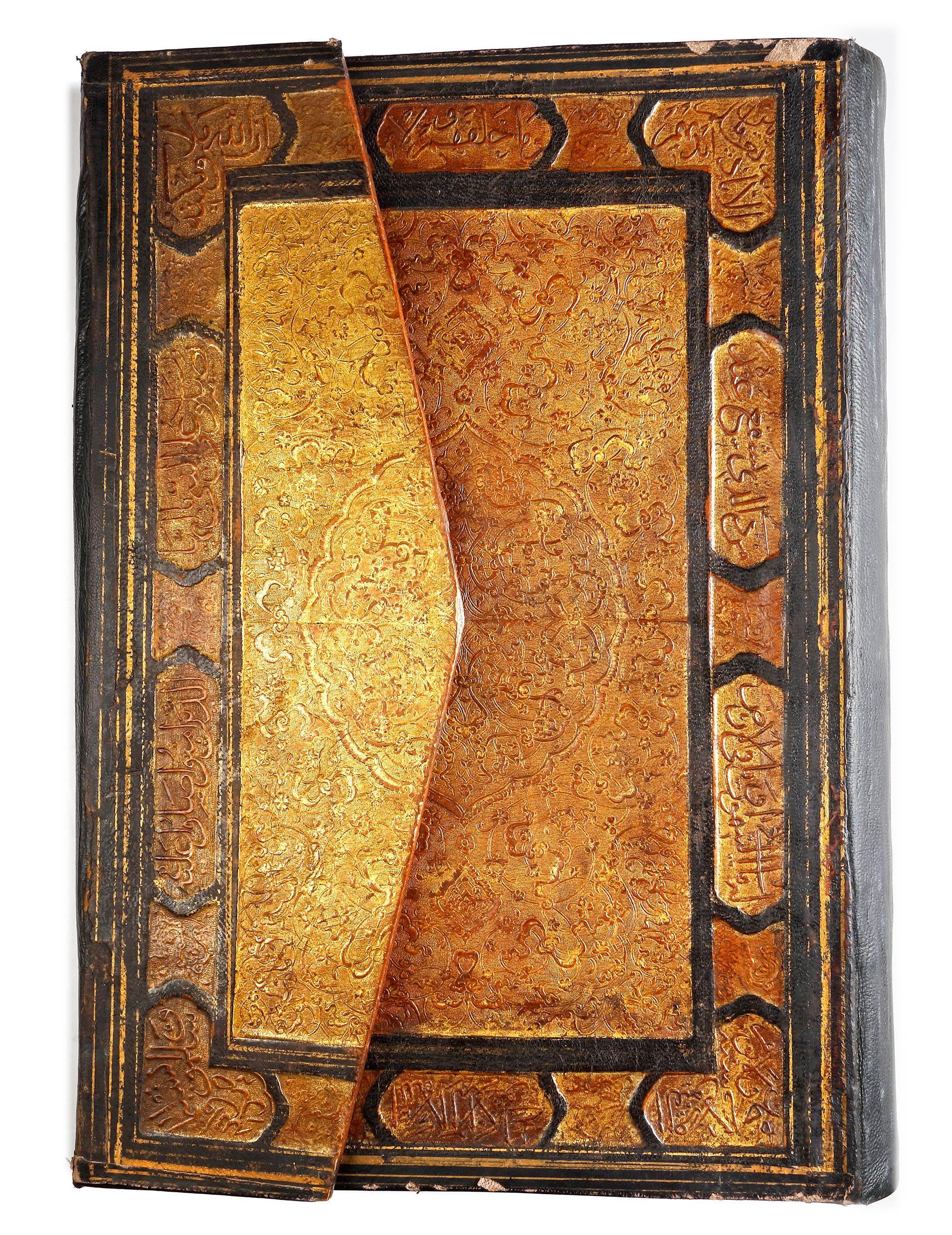 Arabic manuscript on buff paper, 356 pages plus 2 flyleaves, 12 lines to the page, written in black naskh, verses separated by gold and polychrome pointed floral roundels, sura headings in white cursive script against gold ground within cusped cartouches on illuminated panels, some including words in naskh within clouds on reserved ground, margins ruled in colours and gold, catchwords, occasional marginal notes, marginal verse markers in the form of quatrefoil and drop-shaped illuminated medallions, two frontispiece bifolios with fine, full-page illumination in polychrome and gold, the following folio with an illuminated headpiece, two finispiece bifolios with similar full-page illumination, and three further illuminated double pages at the end with prayers and Falnama,with fine original gold-stamped brown morocco binding with central field and border cartouches of floral motifs and cloud scrolls, fine gold-stamped doublures with central field of tightly intertwined cloud scrolls, central medallion and cornerpieces of gilt filigree over polychrome grounds, border cartouches of gilt-stamped calligraphy consisting of pious phrases and an outer border band with further cartouches of gilt filigree, with flap.