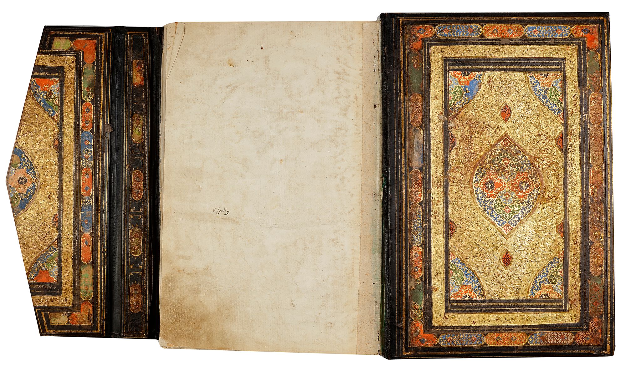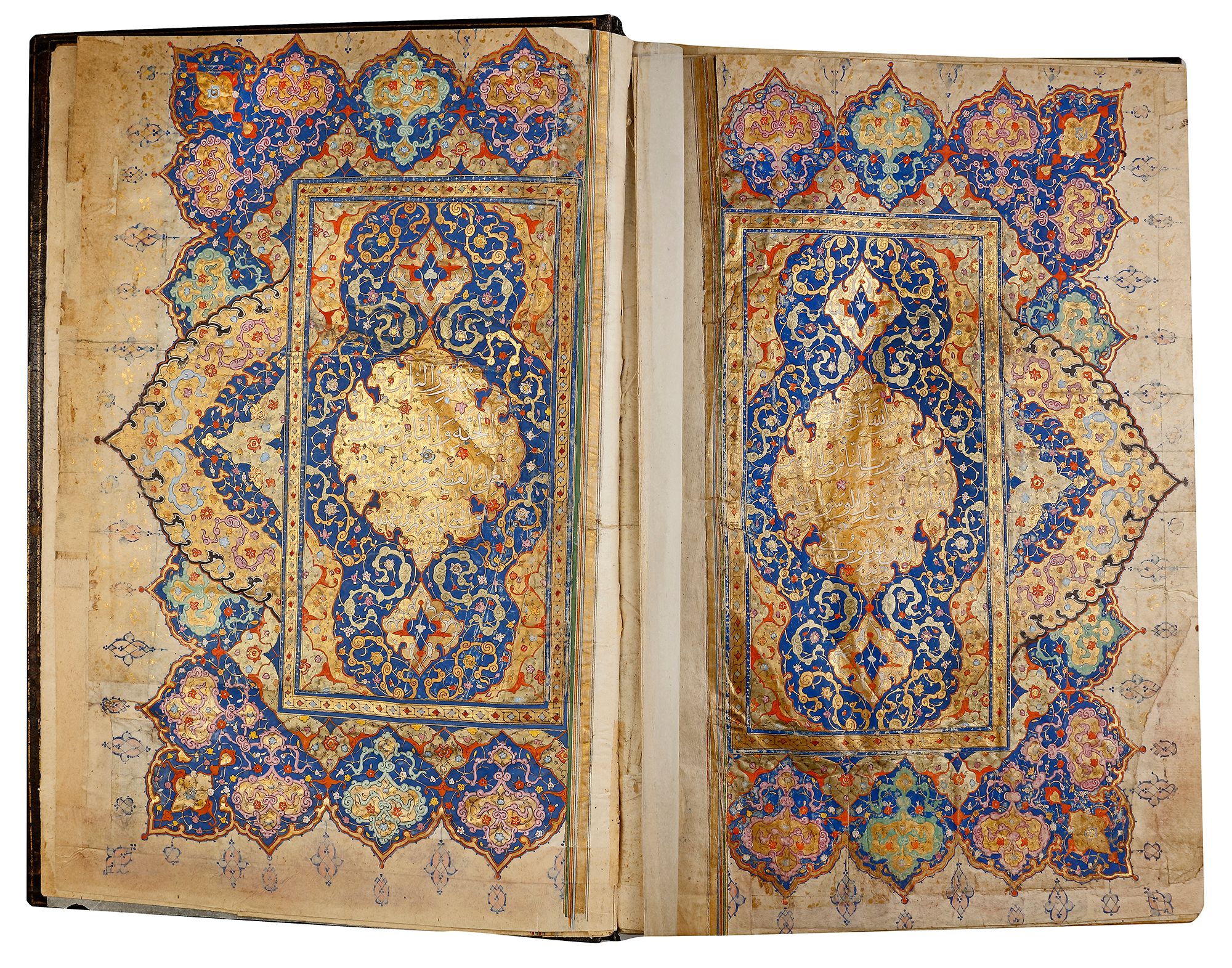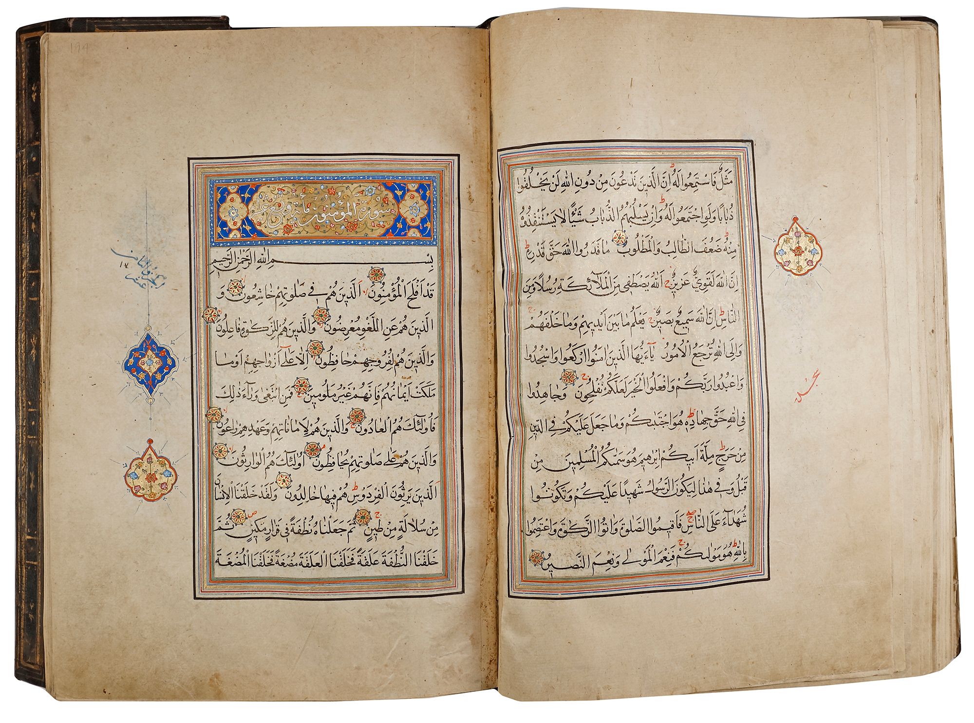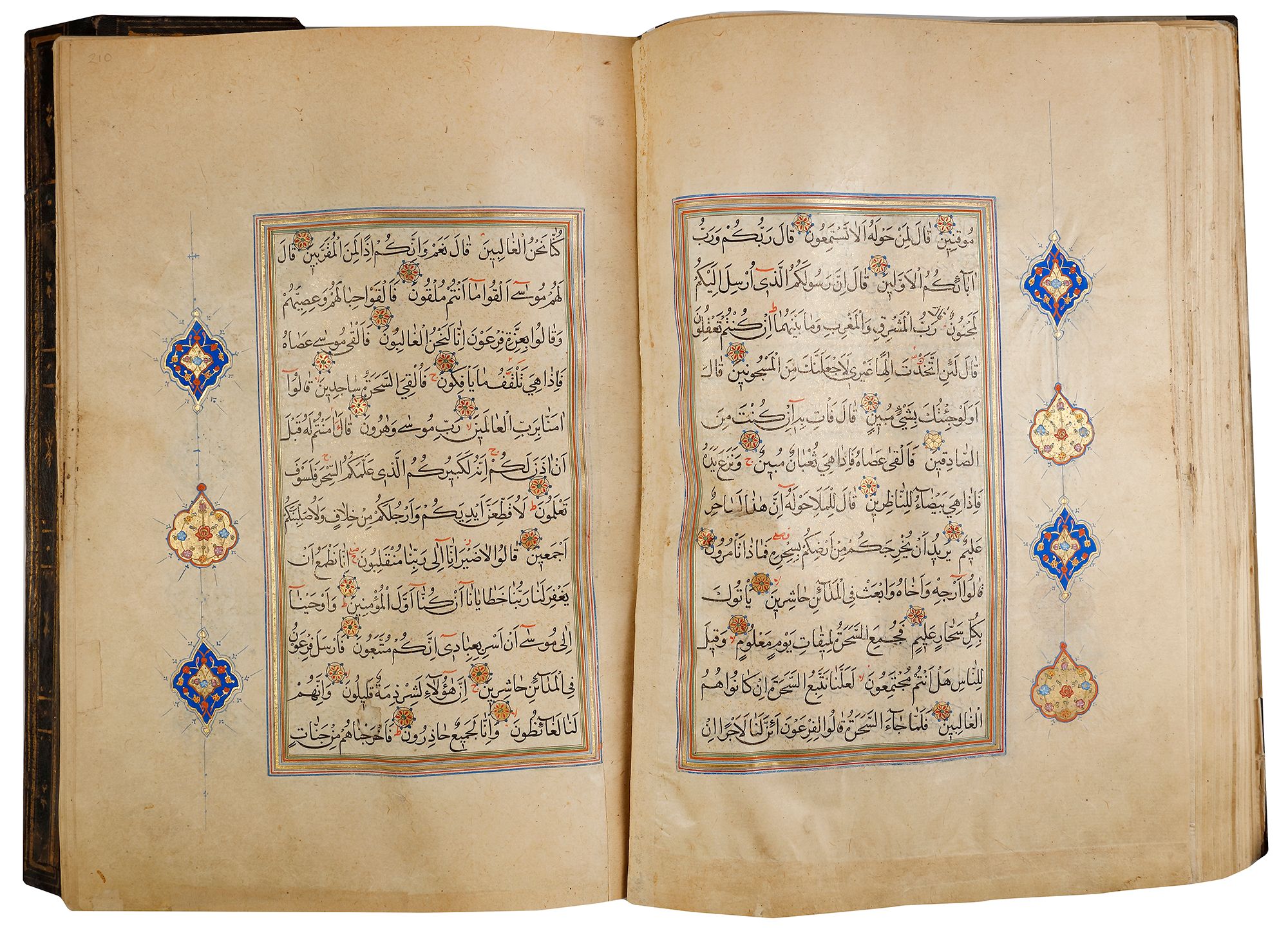 Arabic manuscript on buff paper, 356 pages plus 2 flyleaves, 12 lines to the page, written in black naskh, verses separated by gold and polychrome pointed floral roundels, sura headings in white cursive script against gold ground within cusped cartouches on illuminated panels, some including words in naskh within clouds on reserved ground, margins ruled in colours and gold, catchwords, occasional marginal notes, marginal verse markers in the form of quatrefoil and drop-shaped illuminated medallions, two frontispiece bifolios with fine, full-page illumination in polychrome and gold, the following folio with an illuminated headpiece, two finispiece bifolios with similar full-page illumination, and three further illuminated double pages at the end with prayers and Falnama,with fine original gold-stamped brown morocco binding with central field and border cartouches of floral motifs and cloud scrolls, fine gold-stamped doublures with central field of tightly intertwined cloud scrolls, central medallion and cornerpieces of gilt filigree over polychrome grounds, border cartouches of gilt-stamped calligraphy consisting of pious phrases and an outer border band with further cartouches of gilt filigree, with flap.