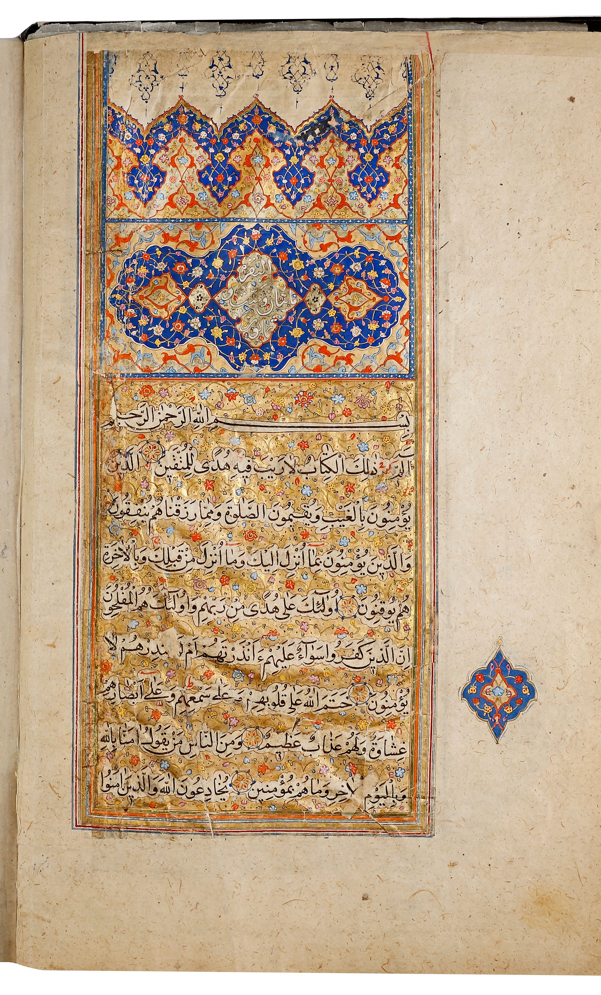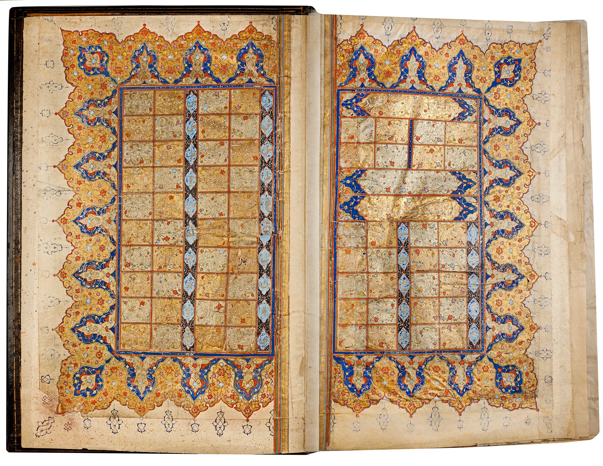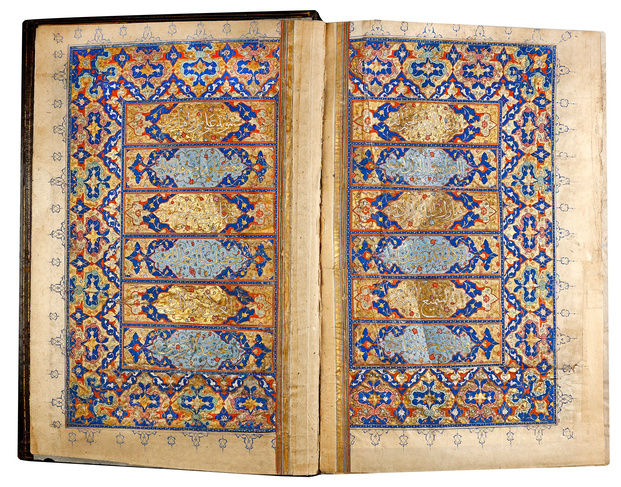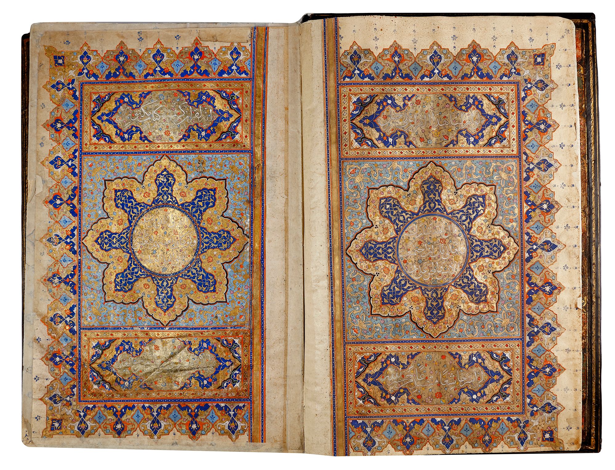 Arabic manuscript on buff paper, 356 pages plus 2 flyleaves, 12 lines to the page, written in black naskh, verses separated by gold and polychrome pointed floral roundels, sura headings in white cursive script against gold ground within cusped cartouches on illuminated panels, some including words in naskh within clouds on reserved ground, margins ruled in colours and gold, catchwords, occasional marginal notes, marginal verse markers in the form of quatrefoil and drop-shaped illuminated medallions, two frontispiece bifolios with fine, full-page illumination in polychrome and gold, the following folio with an illuminated headpiece, two finispiece bifolios with similar full-page illumination, and three further illuminated double pages at the end with prayers and Falnama,with fine original gold-stamped brown morocco binding with central field and border cartouches of floral motifs and cloud scrolls, fine gold-stamped doublures with central field of tightly intertwined cloud scrolls, central medallion and cornerpieces of gilt filigree over polychrome grounds, border cartouches of gilt-stamped calligraphy consisting of pious phrases and an outer border band with further cartouches of gilt filigree, with flap.