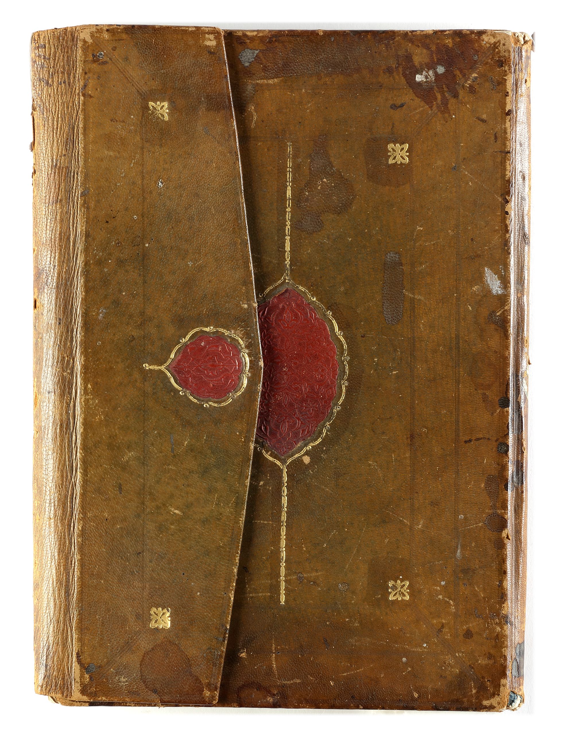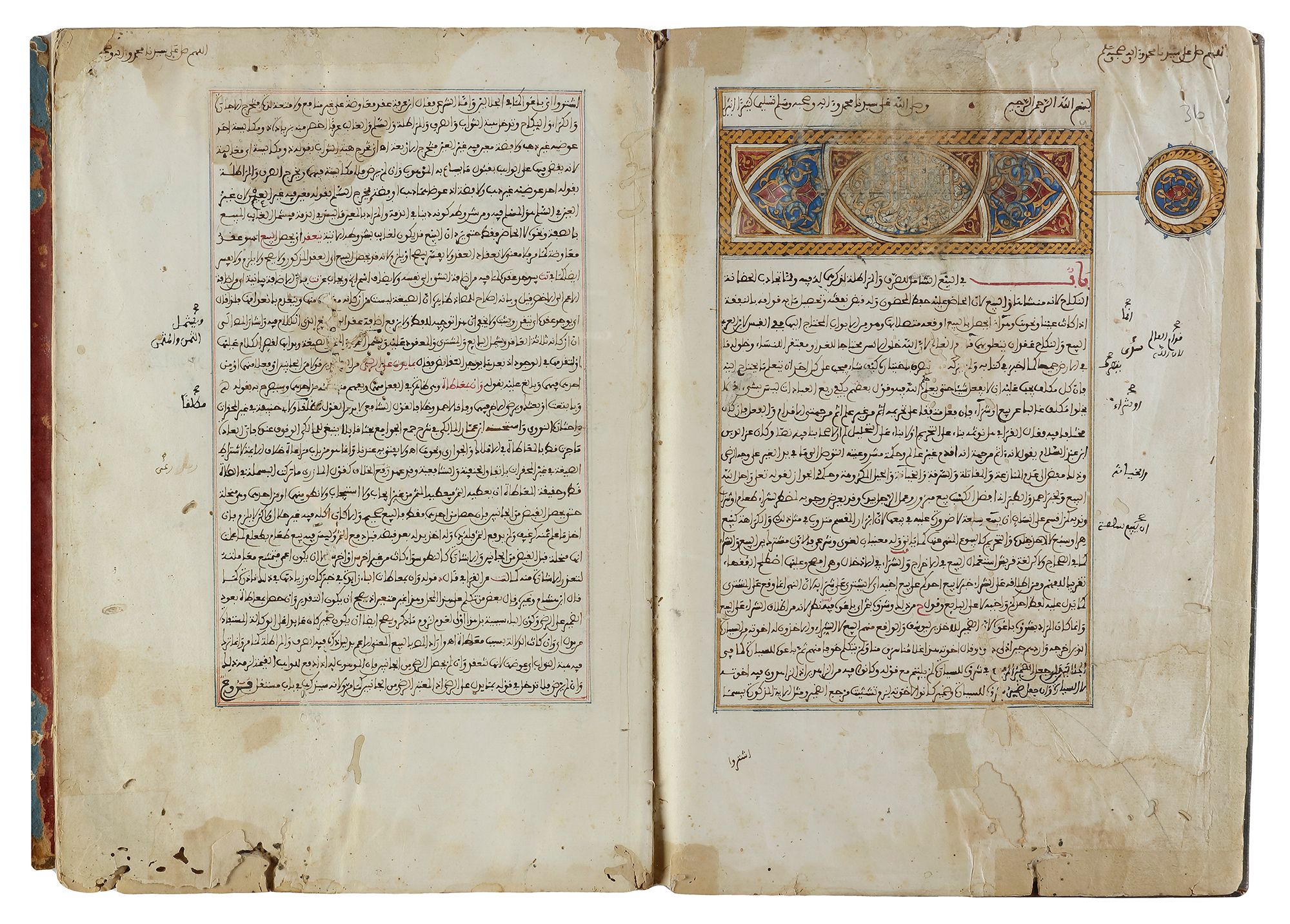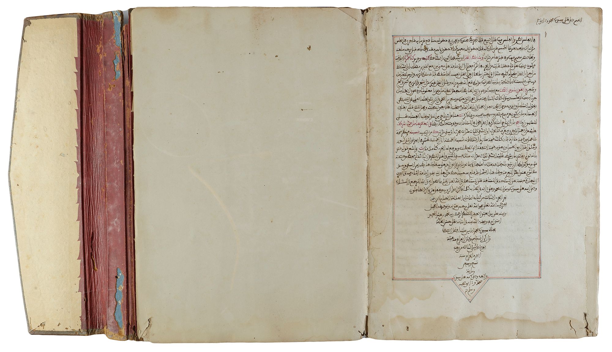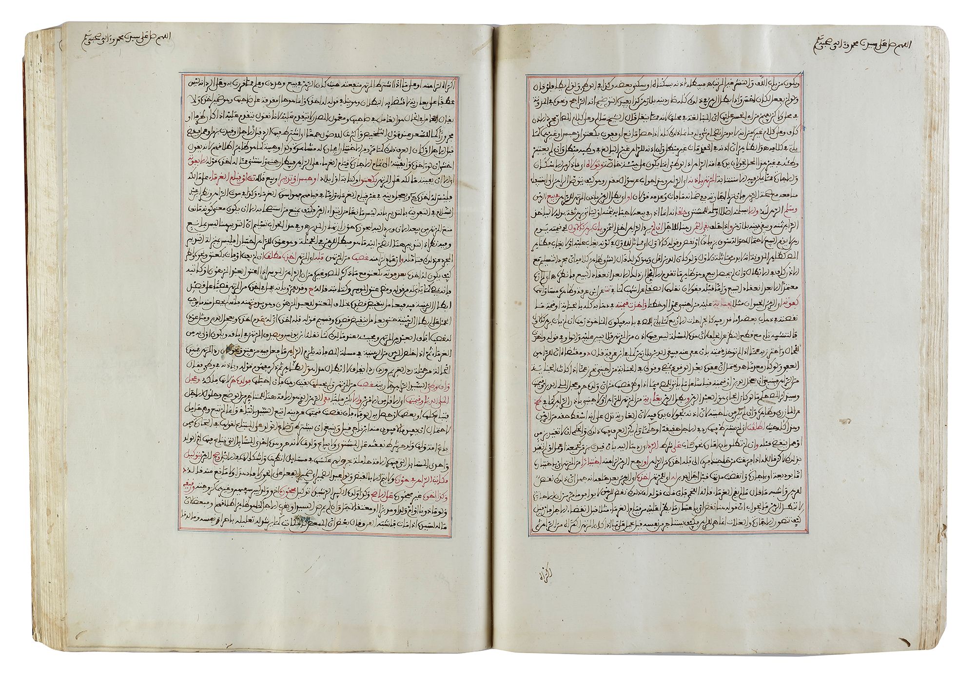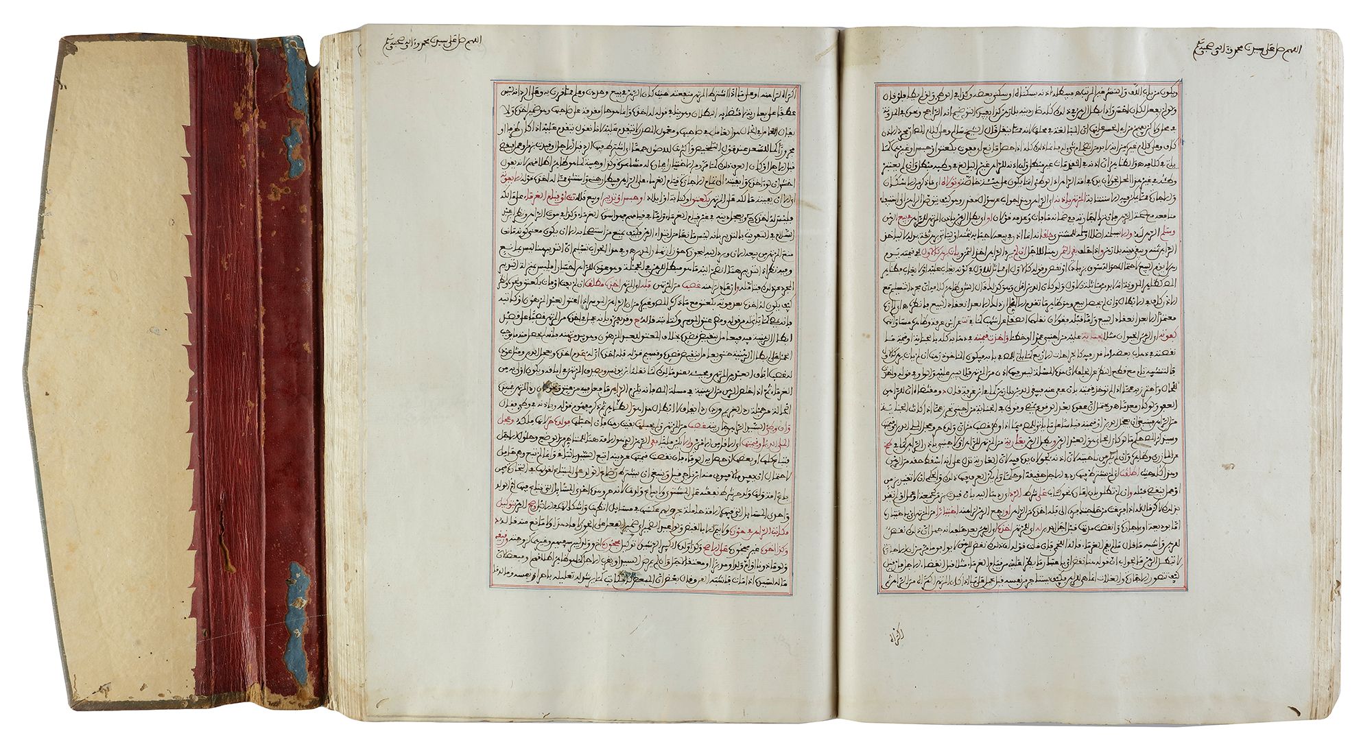 Arabic manuscript op paper, 29 lines to each page, written in black ink with red and blue borders.