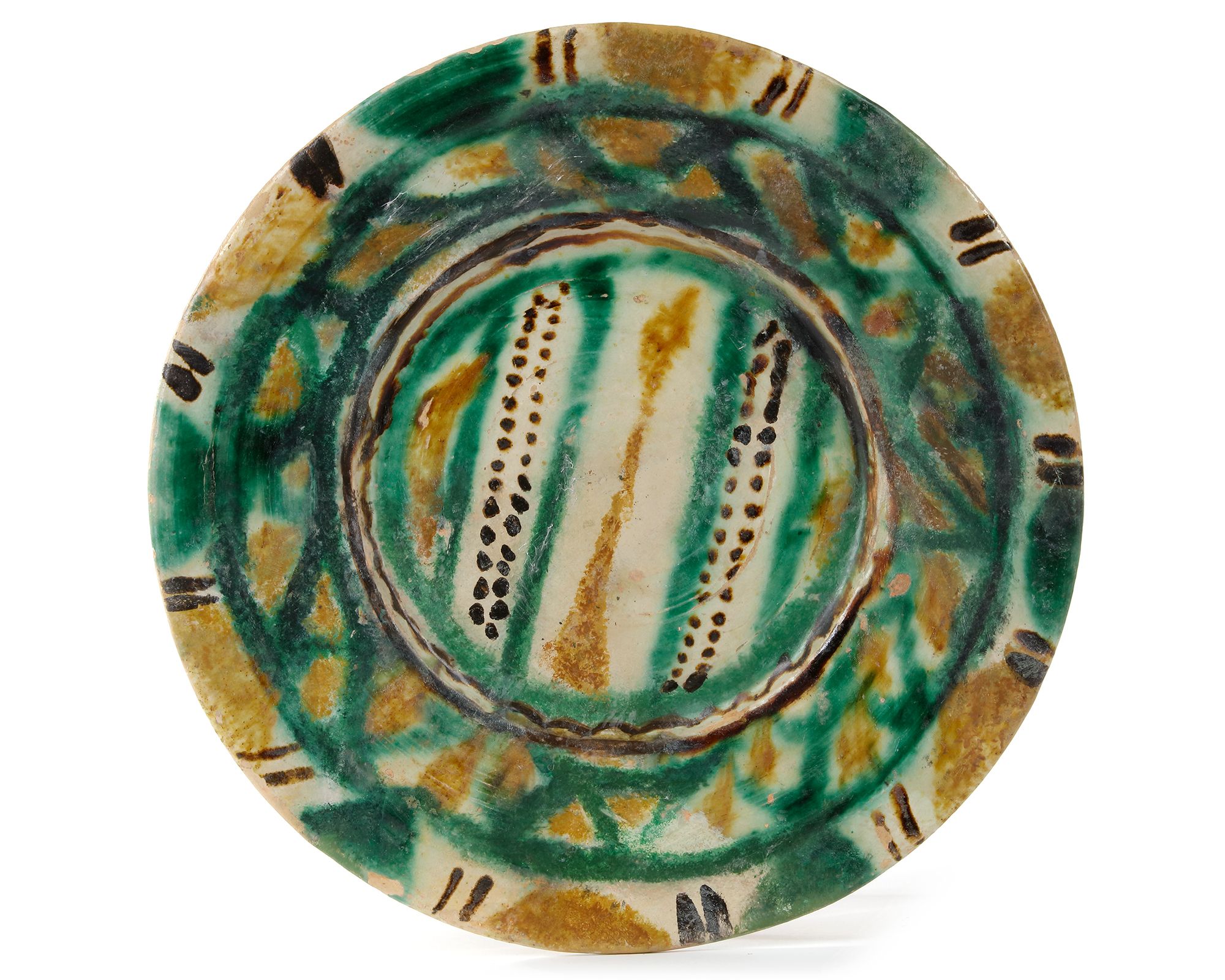 Red earthenware with a white slip, splashes of green, yellow and brown in a transparent glaze. 29 cm. diam.