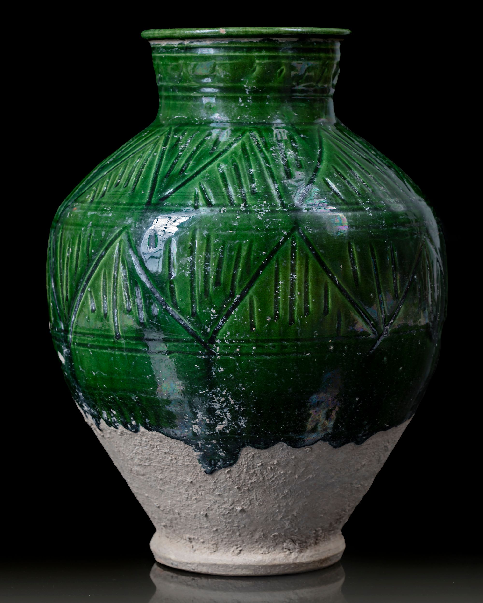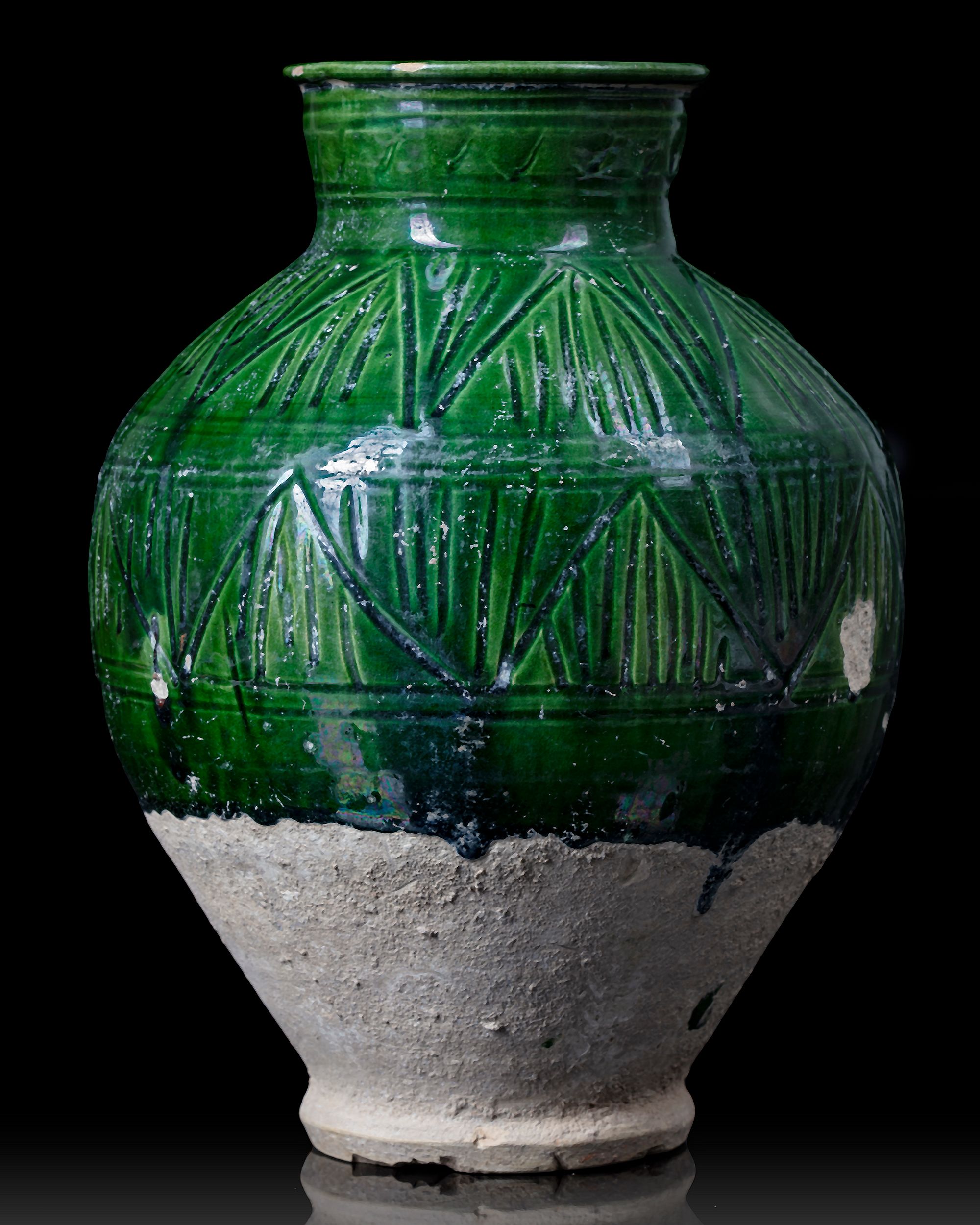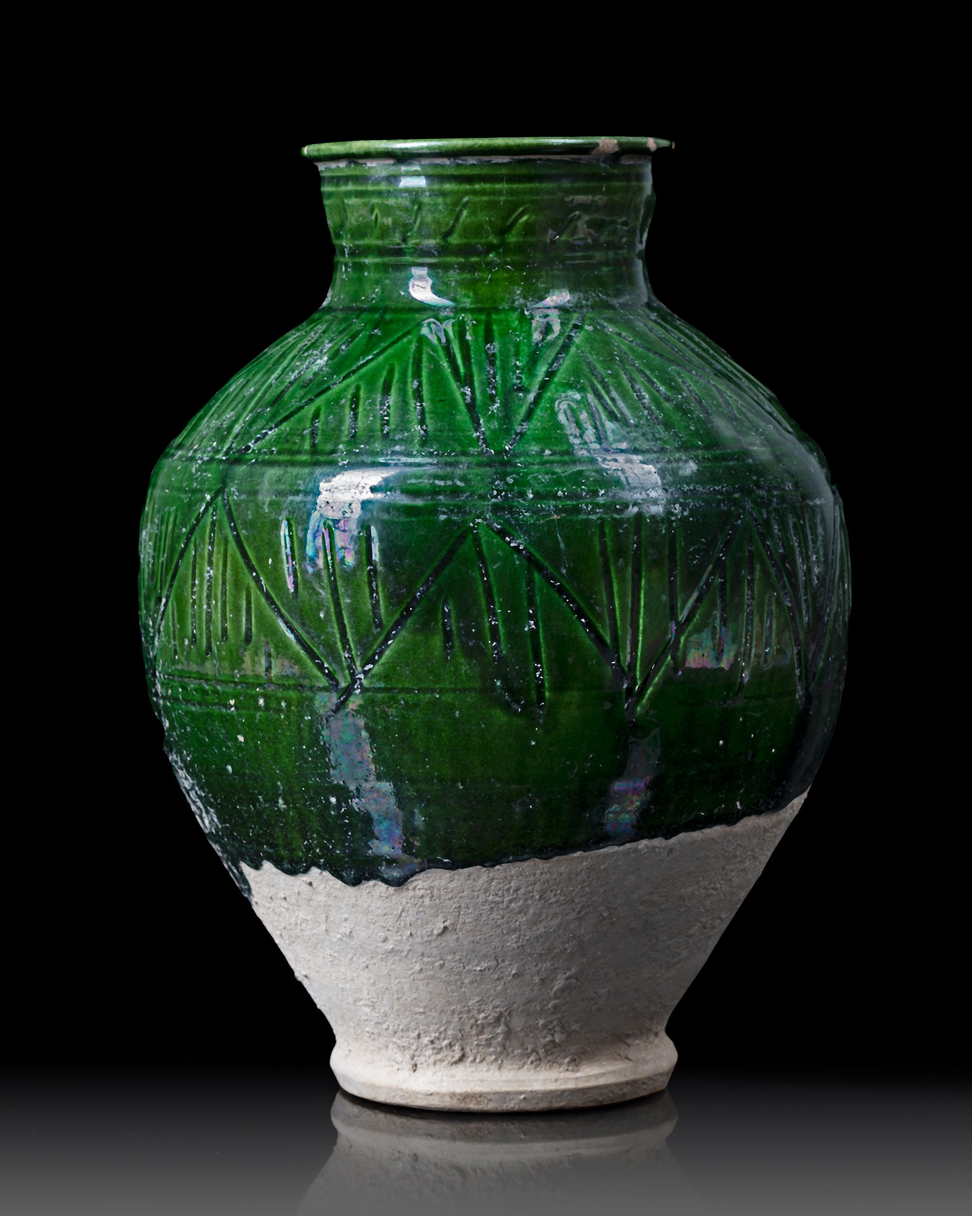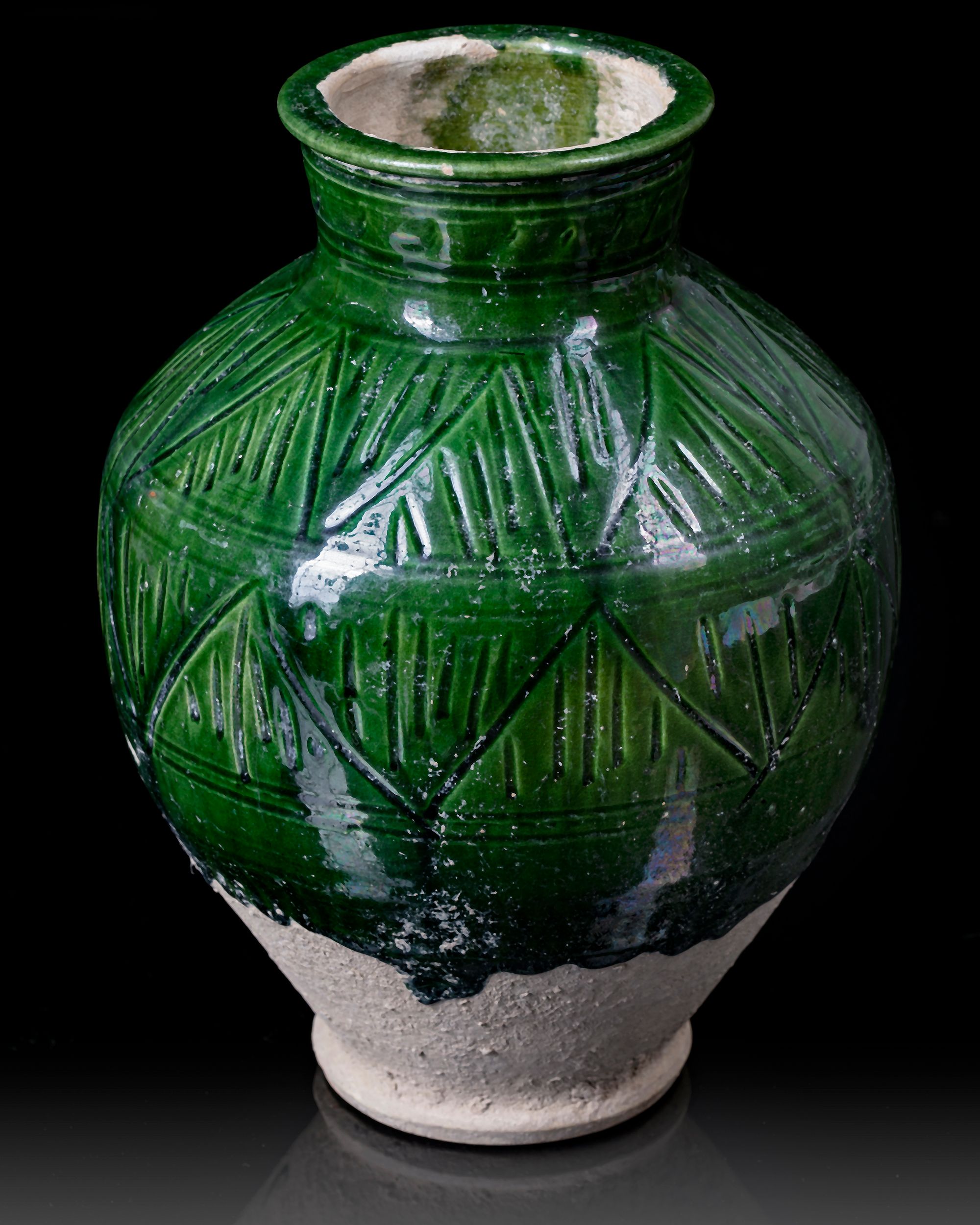 CATALOGUE NOTE Green-glazed incised ware from Fatimid Egypt has been described by Oliver Watson as "one of the 'hidden treasures' of Islamic pottery" (Watson 2004, p.285). Surprisingly little is known about this category of wares, for although it is well-attested in the Fustat sherd material, intact examples are extremely rare. This type was first properly documented by Helen Philon (Philon 1980, pp.263ff) who noted the characteristic soft pinkish buff to pale-yellow body and the lead-fluxed copper glaze which typically stops short of the foot. The finest extant example is in the al-Sabah Collection in Kuwait, attributed by Watson to the twelfth century (Watson 2004, pp.284-5). The present example is closer in shape to the lustre jars of the Fatimid period and is likely to be an earlier form dating to the tenth or eleventh century. An eleventh- or twelfth-century green-glazed vase in the Los Angeles County Museum of Art displays the same proportion of incised and glazed decoration as our jar (LACMA inv.no.M.2002.1.171) and a similar cut foot. A turquoise-glazed jar from the same period has comparable incised hatched decoration (LACMA inv.no.M.2002.1.201).