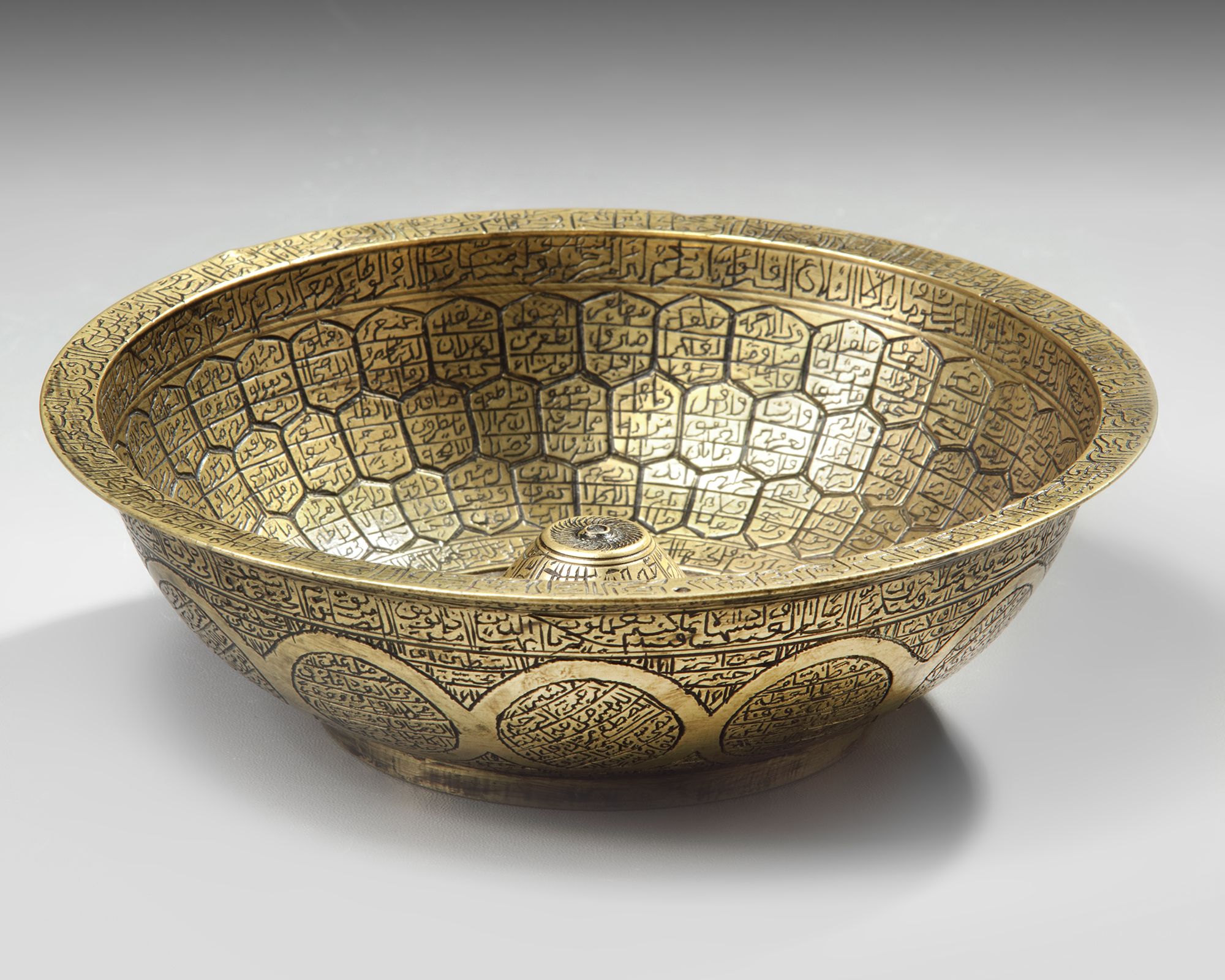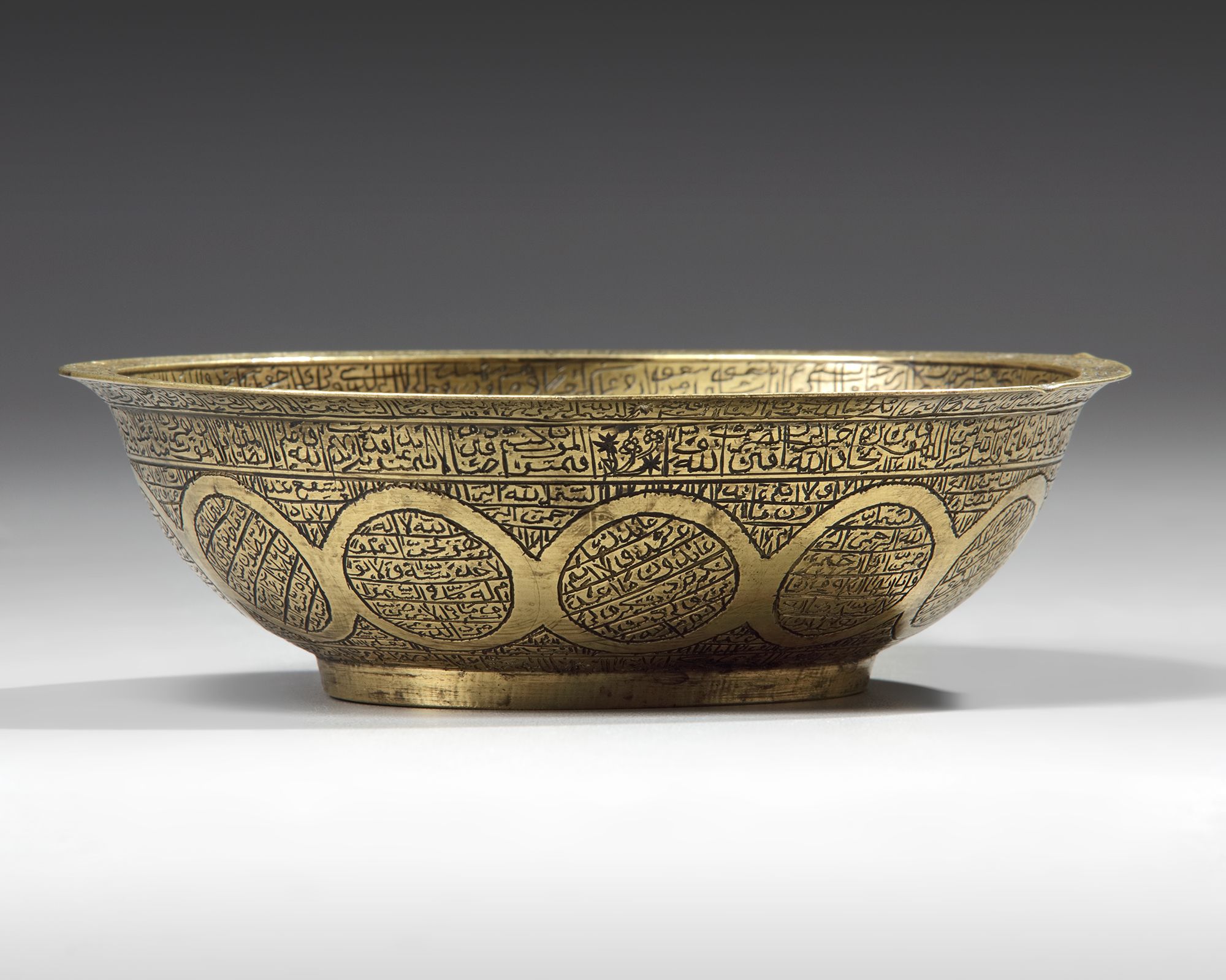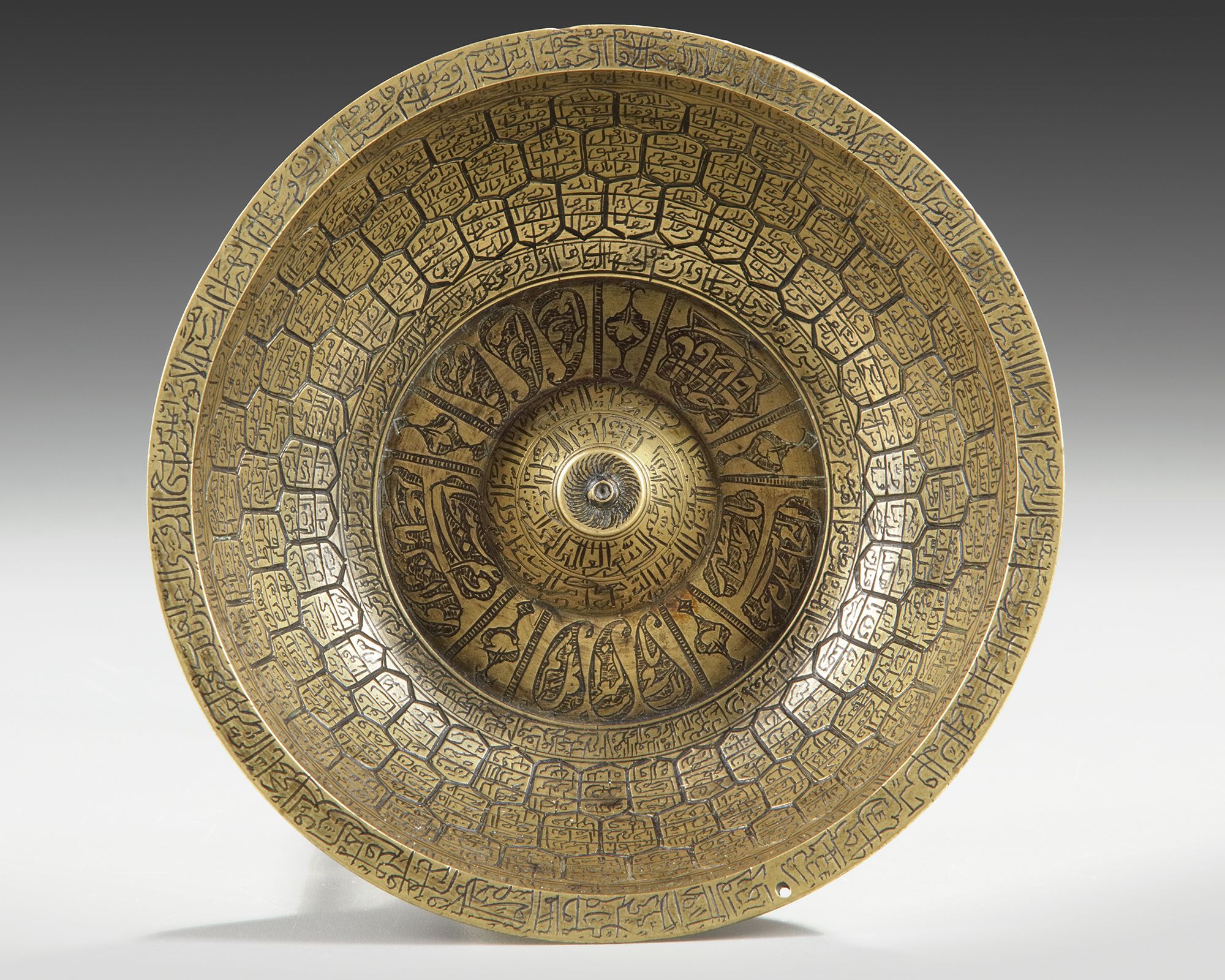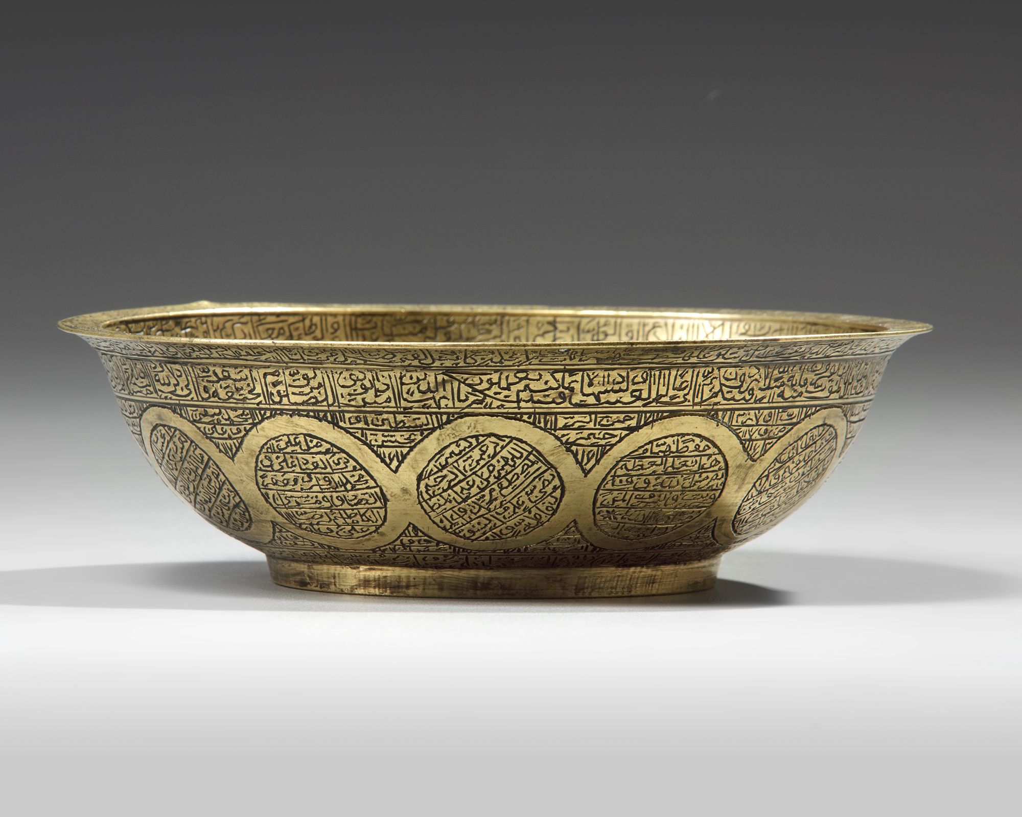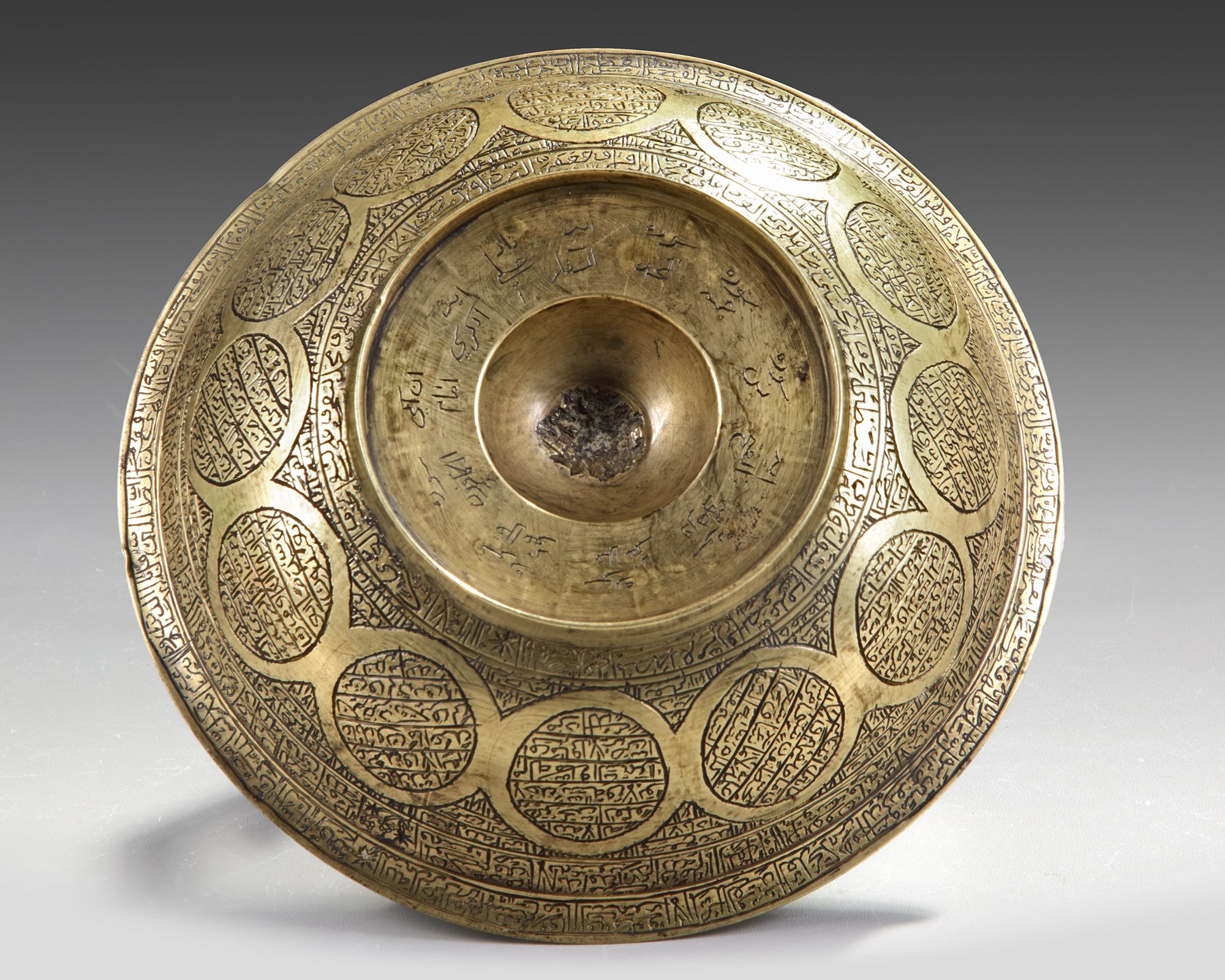 Of typical rounded form on short tapering base, the center marked with a boss, the finely engraved decoration with talismanic inscriptions on the exterior and the interior.