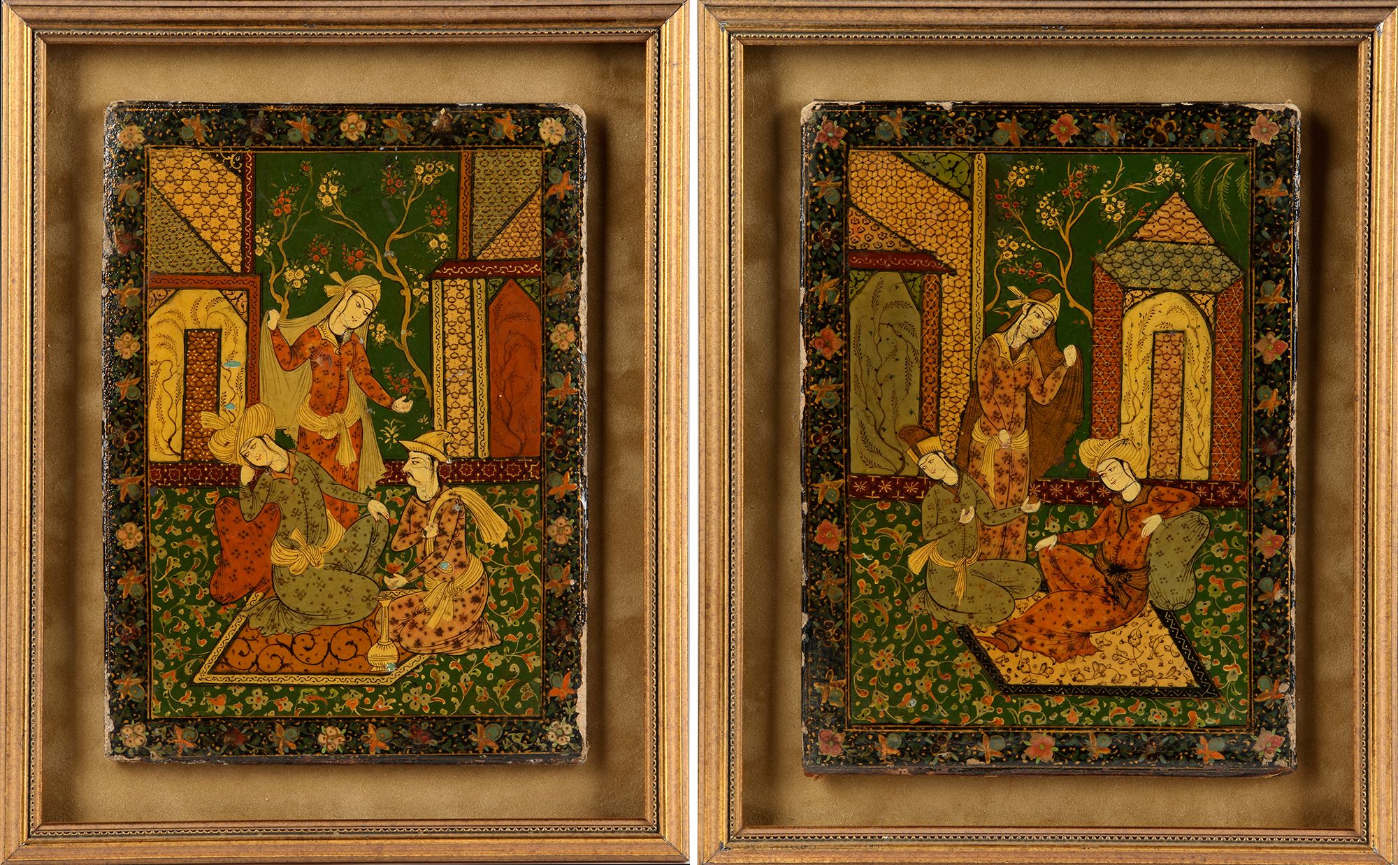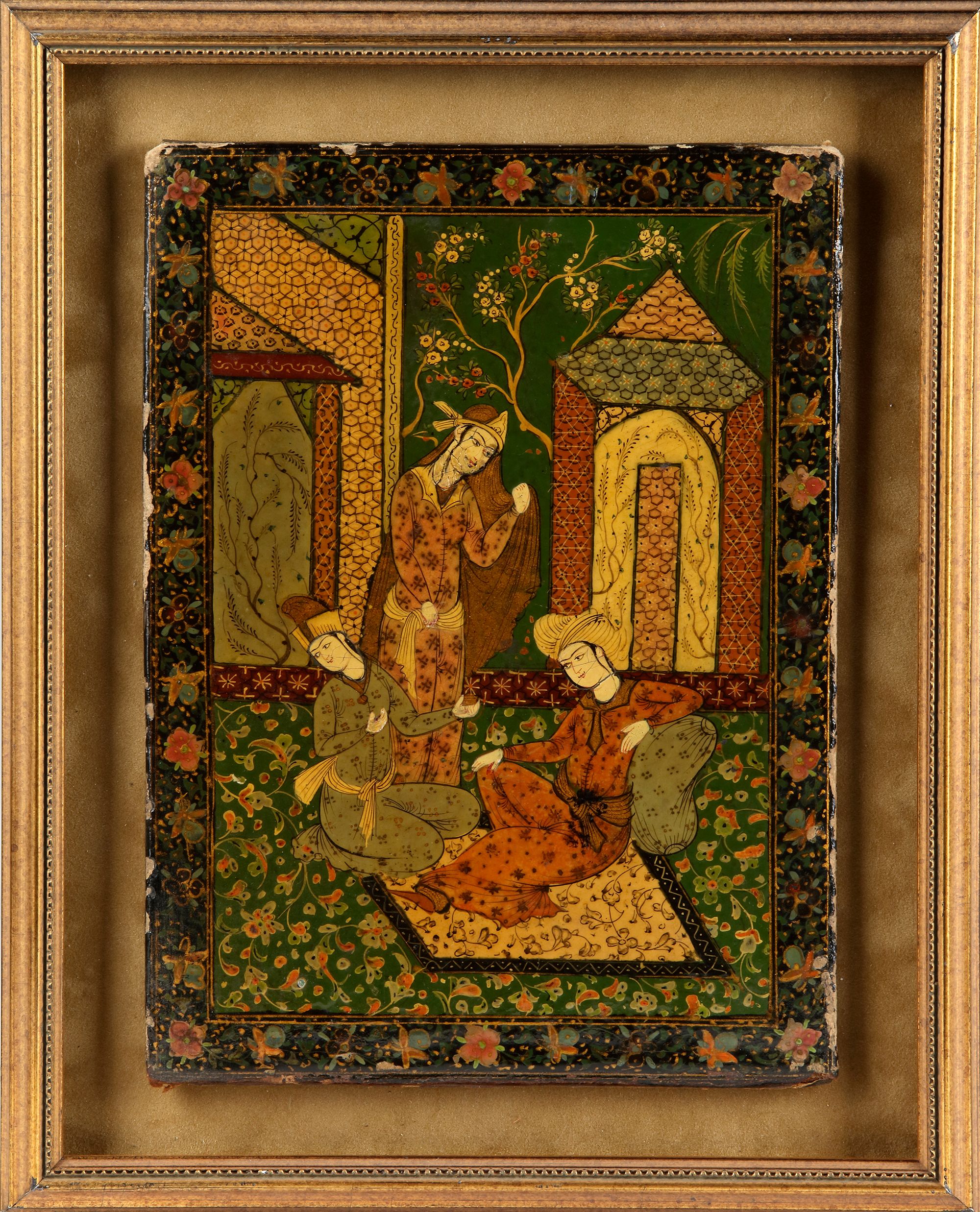 Showing an interior with three figures with floral frames. 24.5 by 18 cm.