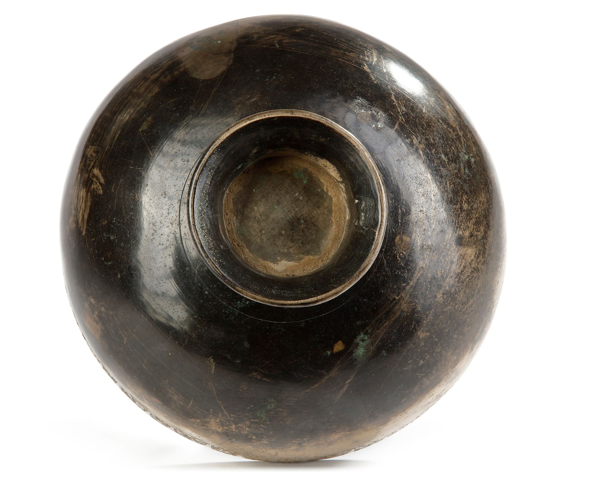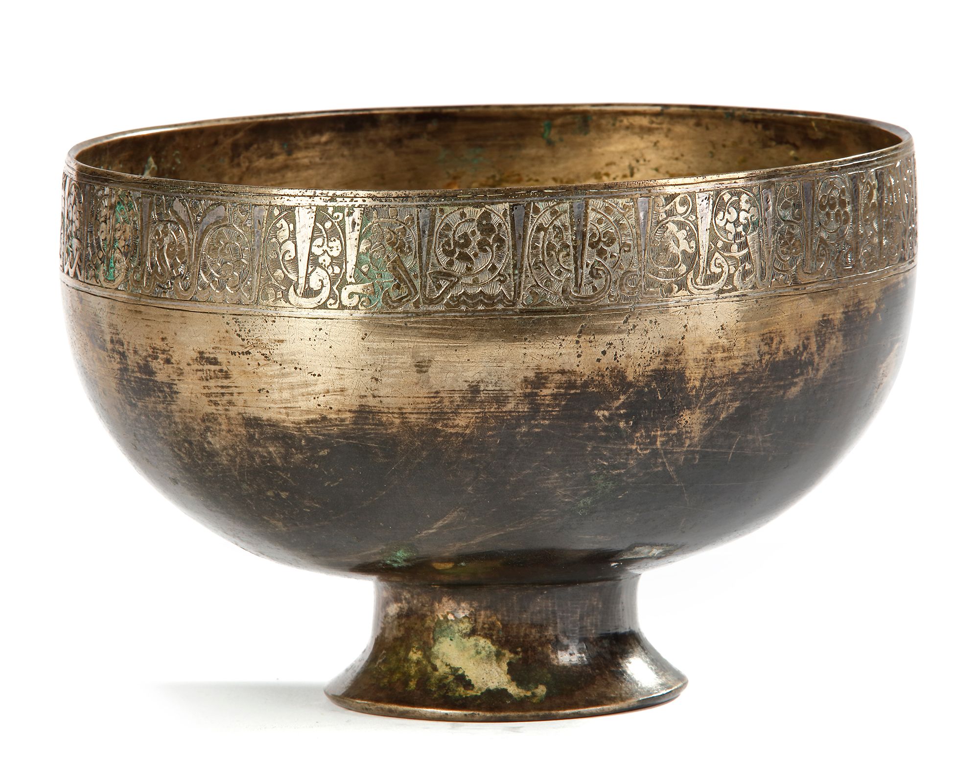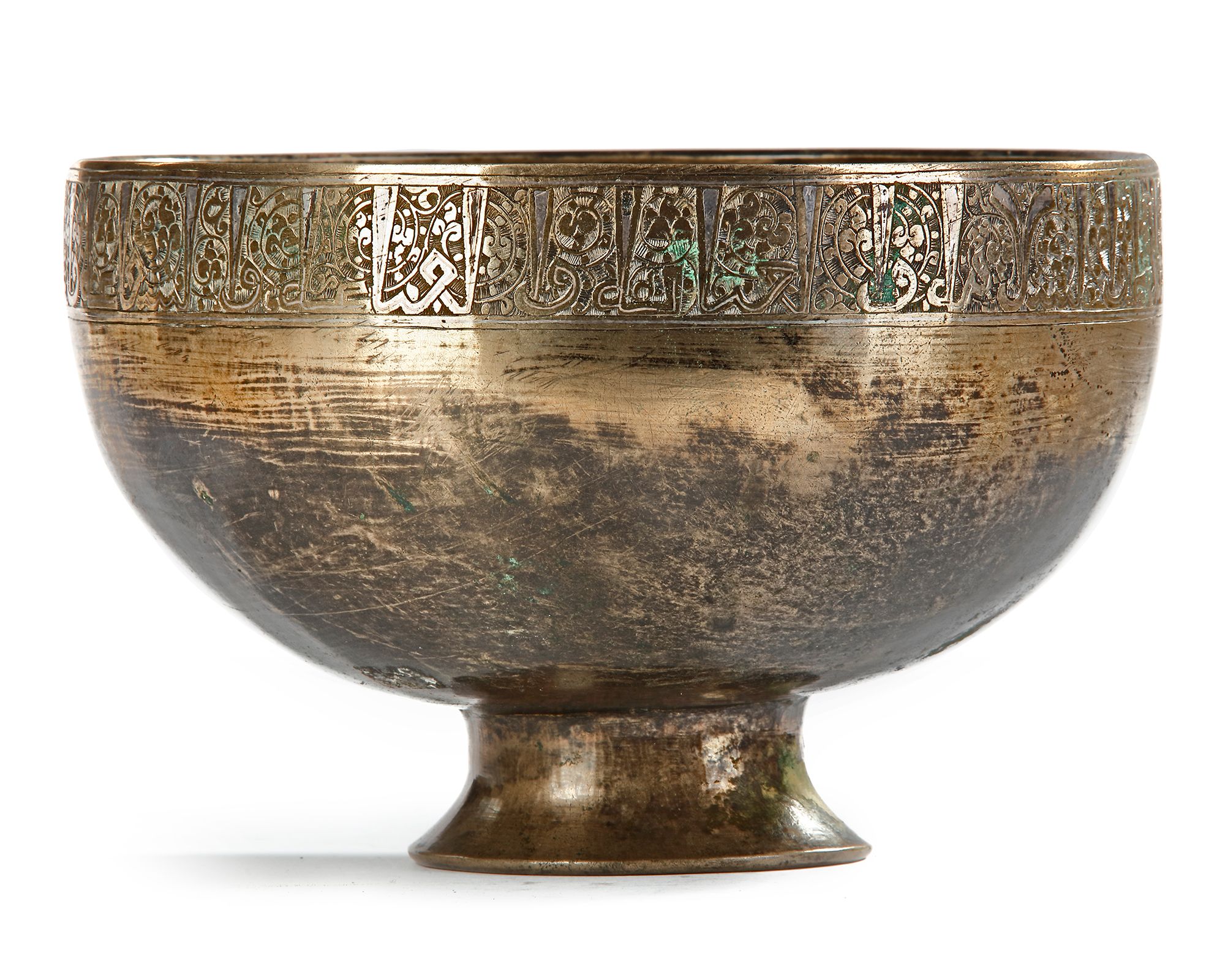 Of deep rounded form on a splayed foot, the rim engraved and decorated in silver inlay with a frieze of inscription in Kufic on a ground of scrolling foliate vines.