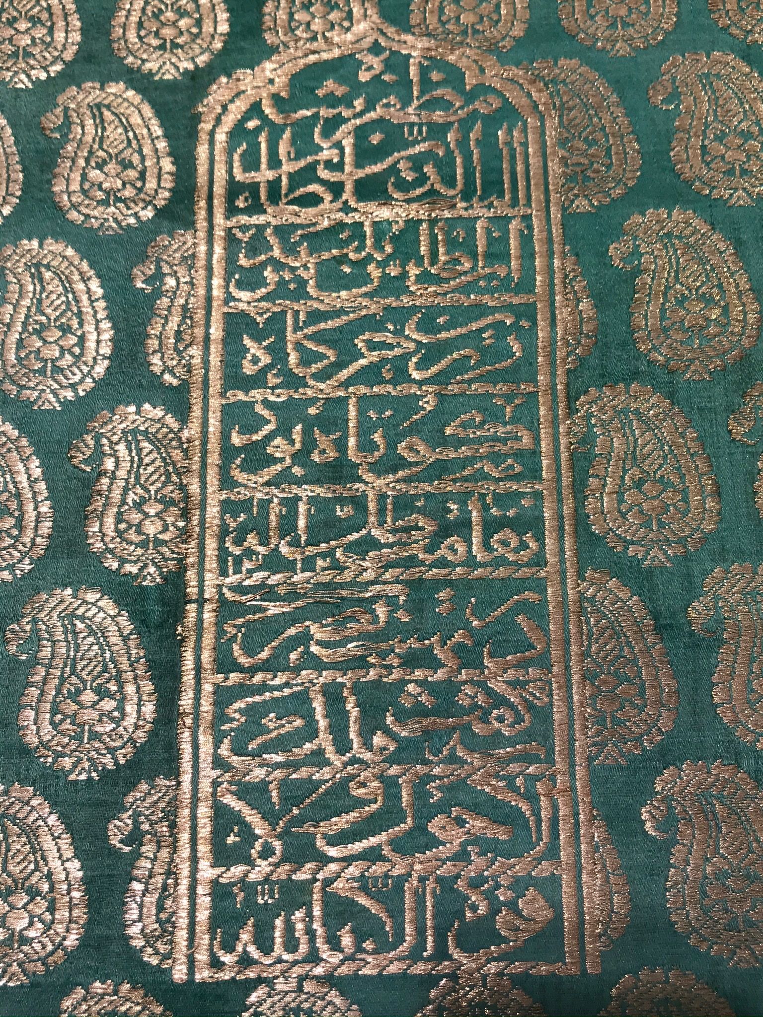 A silk metal-thread panel in the name of Muzaffar al-Din Shah Qajar, Iran, 1896-1907. The turquoise ground woven with small botehs, with calligraphic medallions one in the name of Al-Sultan Muzaffar al-Din, the other with the name of the maker "Amal Hussein"