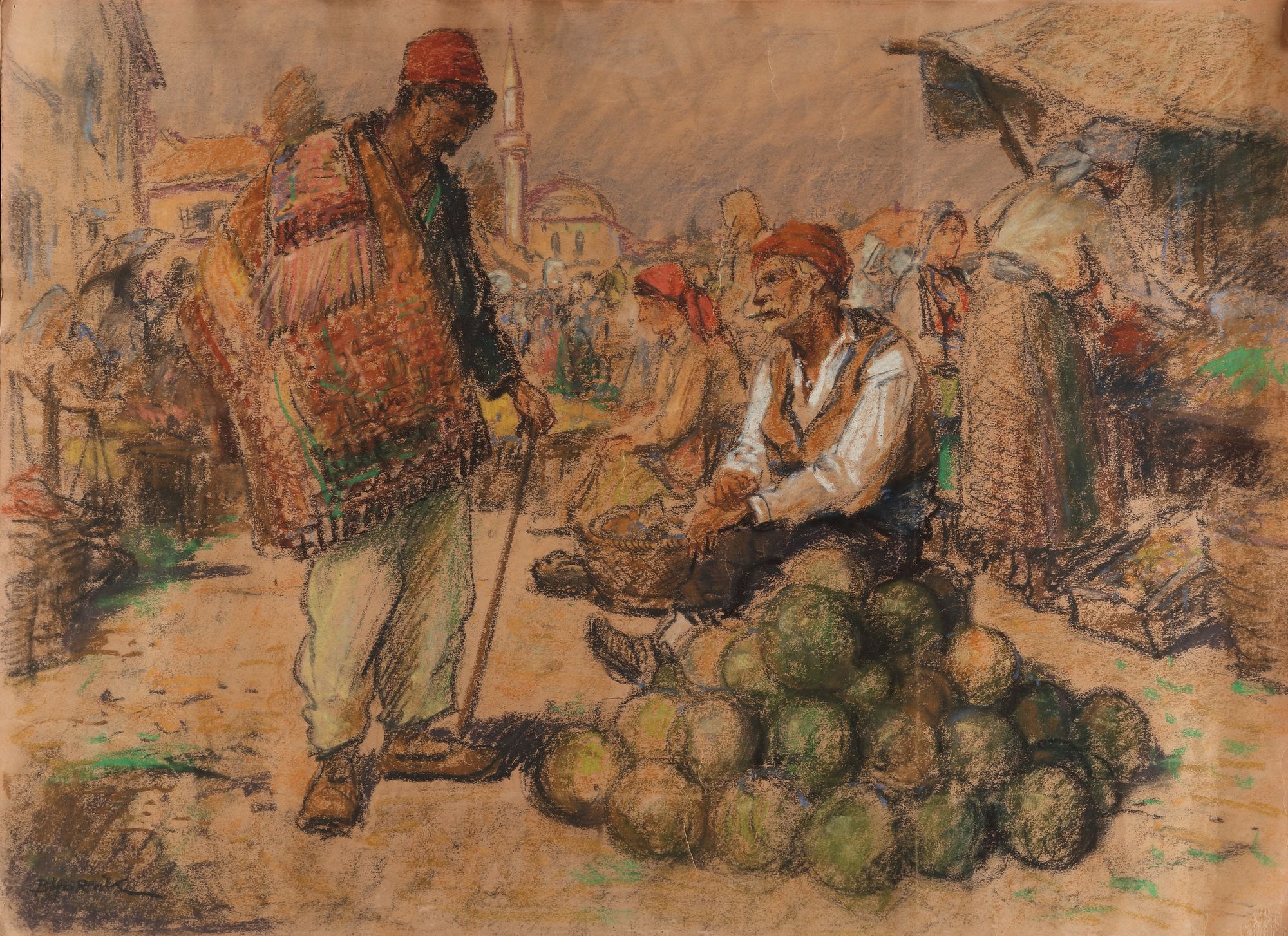 LEONID(A) SOLOGLAUB (Dutch/Russian 1884-1956). The melon seller. Signed, annotated and dated Constantinopel 1920 lower left. Black and coloured chalk.