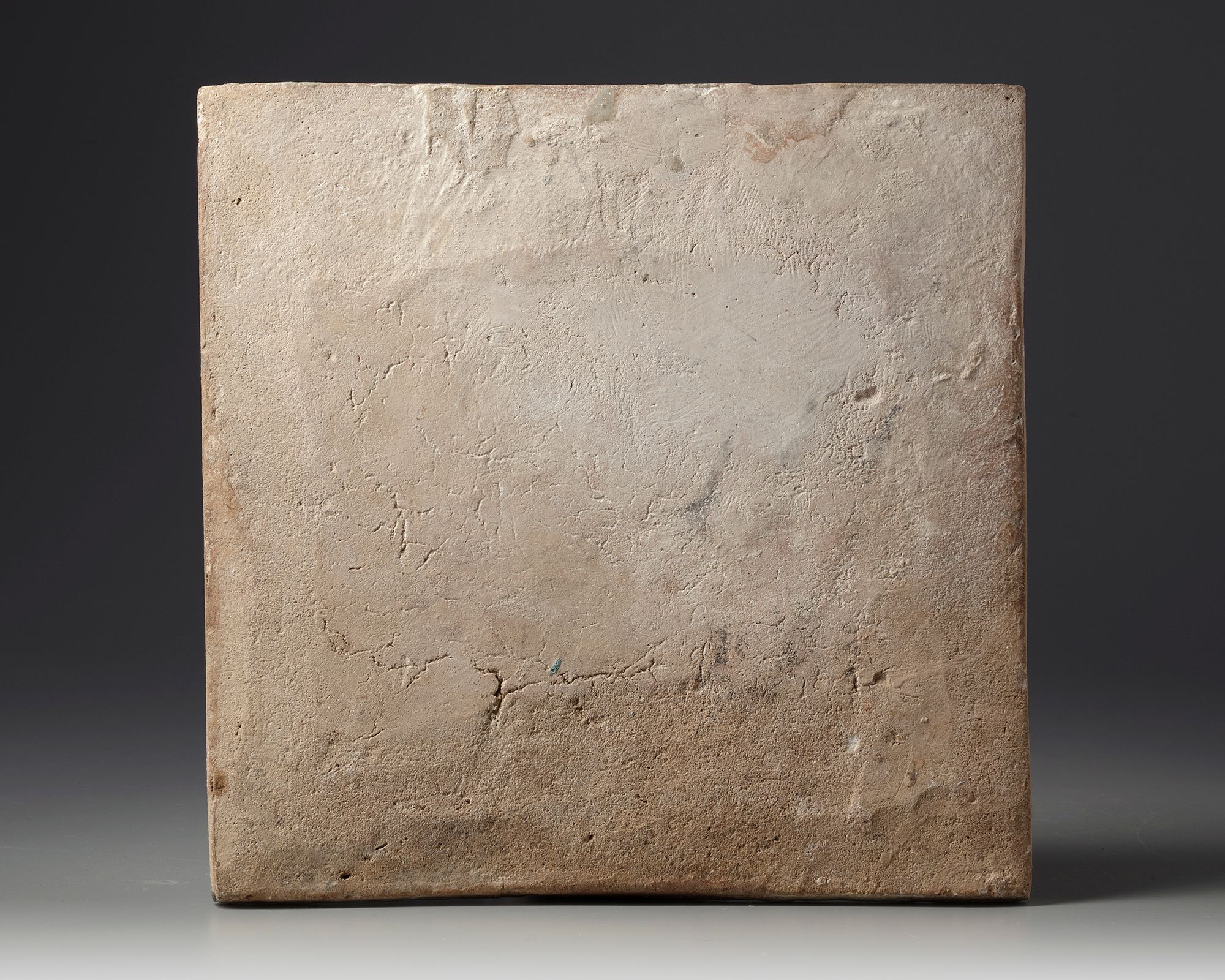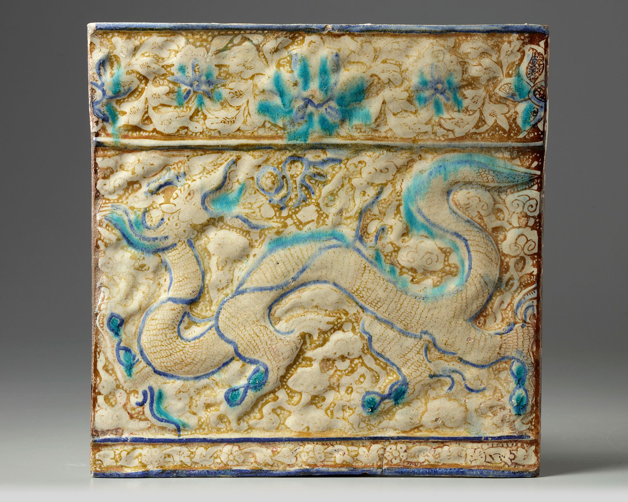Of rectangular form, consists of three registers, decorated in blue and turquoise with a dragon chasing a pearl on a lustre ground under a register of flowers and scrollwork on a glazed ground.