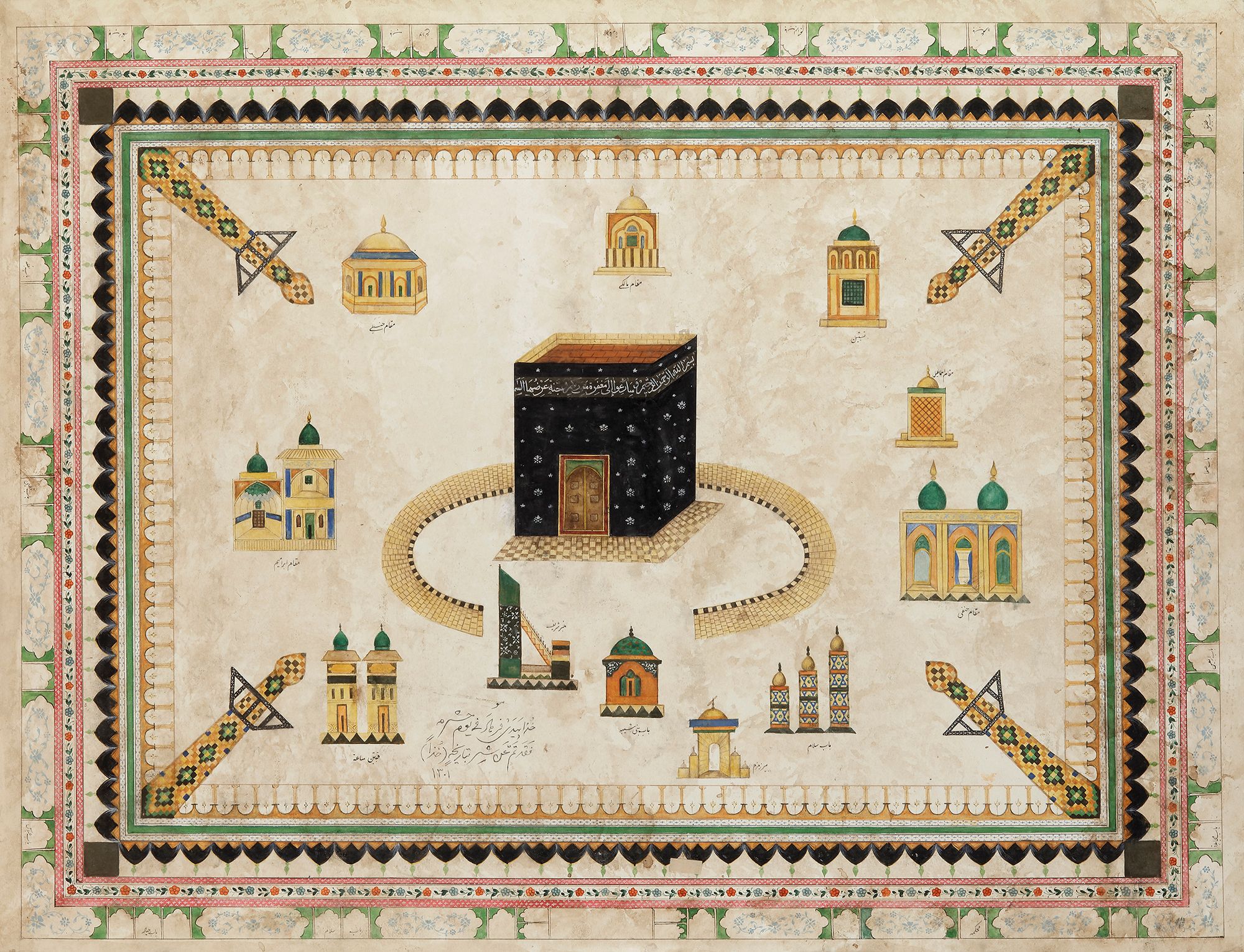 Opaque pigments heightened with gold, depicting a detailed view of the holy mosque in Mecca. The Kabaa is located in the centre with Maqam Ibrahim, surrounded by four Maqams, maqam Al-Hanafi, Al-Maliki, Al-Shafi' and Al-Hanbli, with Bab or door of 'Bni Shiba and zamzam well. The outer walls with four minaretes and black painted domes. 62 by 47.5 cm.