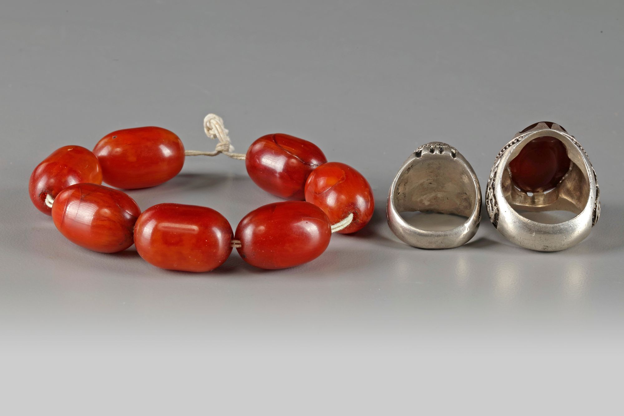 Two silver and stone inlay rings with an Arabic carving, an amber bracelet of seven beads.
