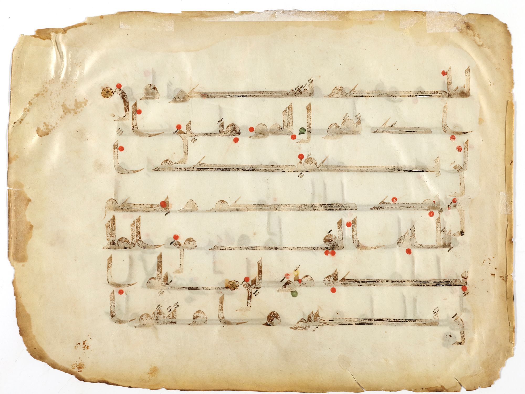This folio from a Quran Manuscript, like many early Quran folios, is written on paper in black ink with a broad-nibbed reed pen, with 6 lines. The horizontally elongated letters seen here are characteristic of early Kufic Qurans on paper and are thought to be a response to the rectangular page format. The angular script is moderated by the roundness of several letters that look like large black dots. Vocalization in red and some in green dots, gold verses between surahs. surah Aal-i-Imraan (Family of Imraan), verses from 124 - 126. One side fainter than the other with some loses edges. 41.5 by 30 cm