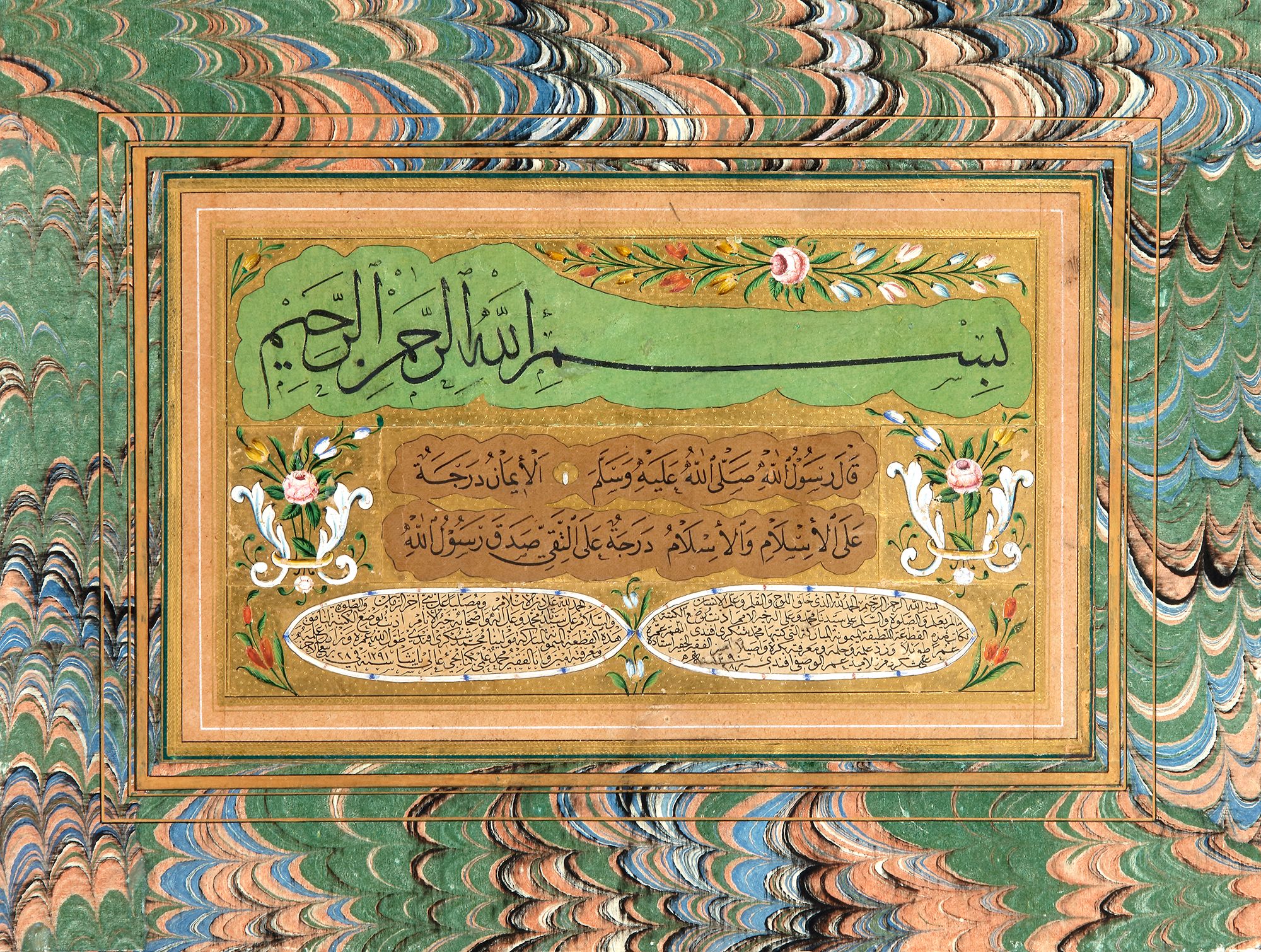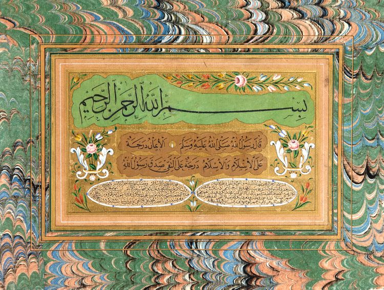 An Arabic manuscript on paper, upper line in bold black bold thuluth script, 2 lines beneath in neat naskh script, 2 lower cartouches giving the details of the of the ijazeh, interstices filled with rococo floral decoration against a gold ground, laid down on marbled paper. Calligraphic panel:14.3 by 23.1cm. Leaf: 25.2 by 33.5 cm.