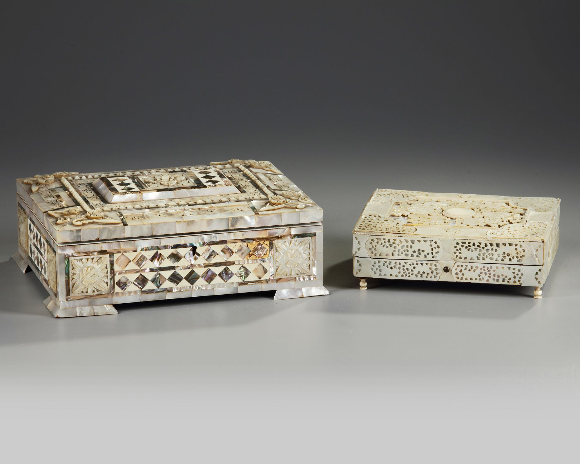 Of rectangular form, on four feet, with coffered top. The cover is densely set with mother of pearl fragments, decorated to the centre with a raised panel of flowers and foliage in low relief with panels of pierced foliage work.