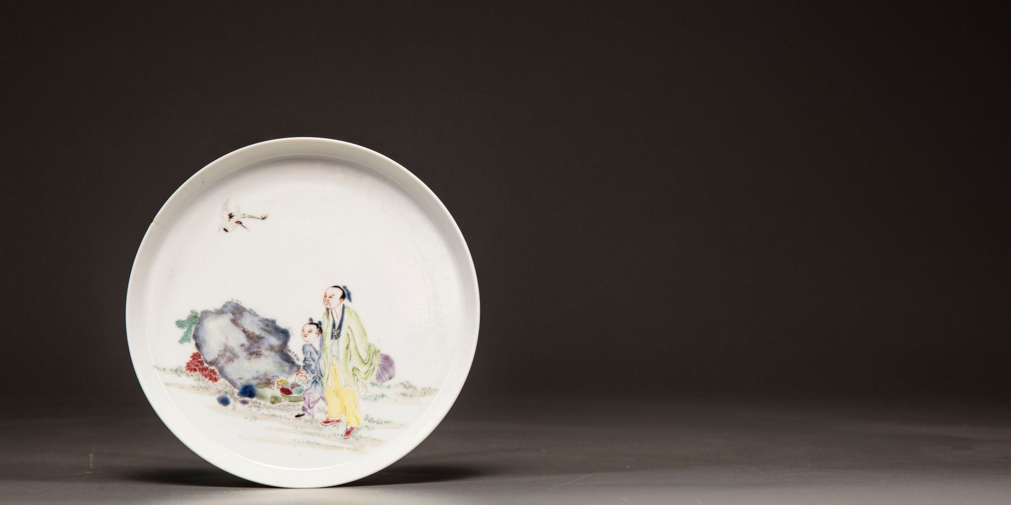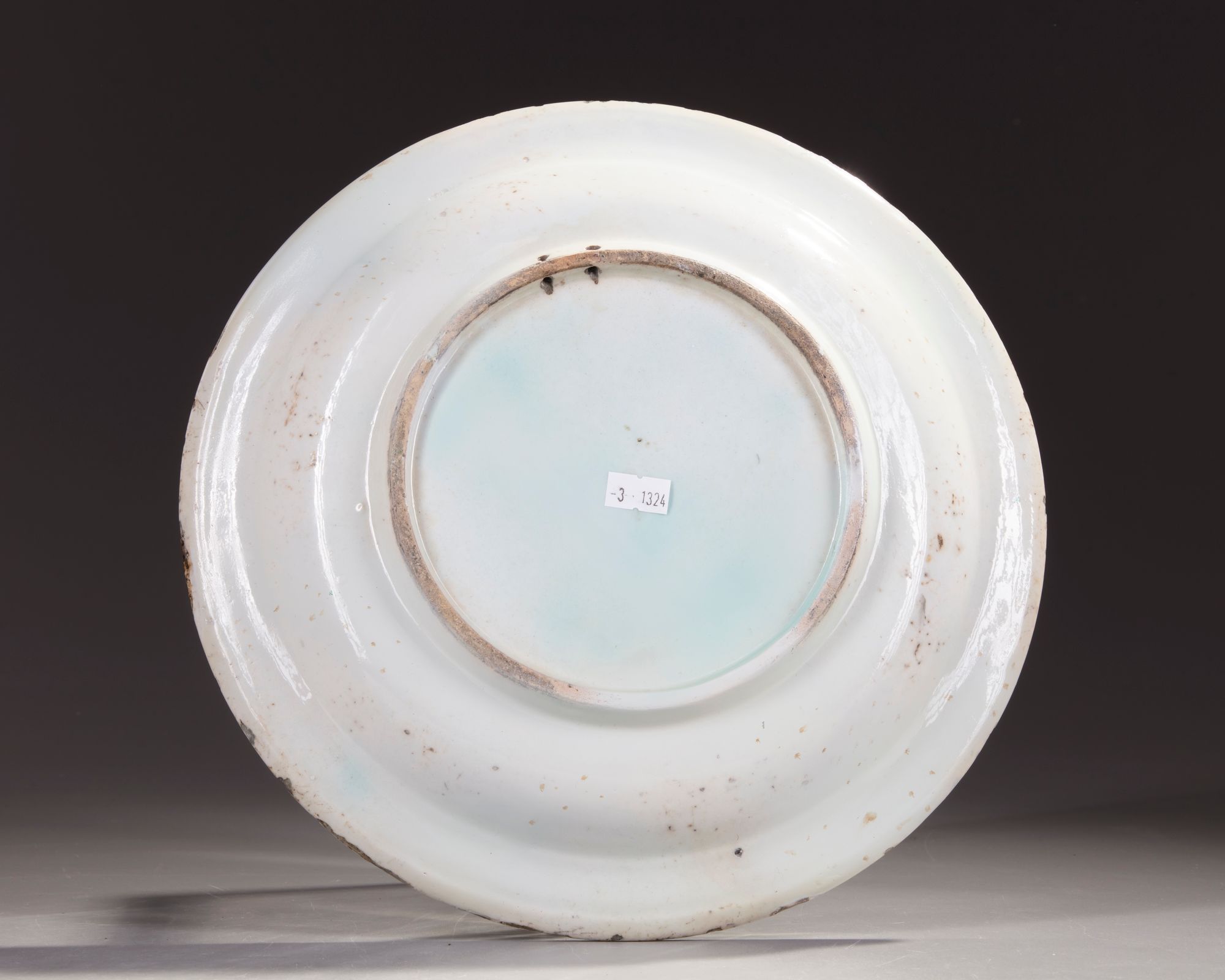 Typical form, a green and blue swaying saz leaf amidst a red tulip and blue carnation spray rising from a tuft of grass, the rim with 'wave-and-rock' pattern.