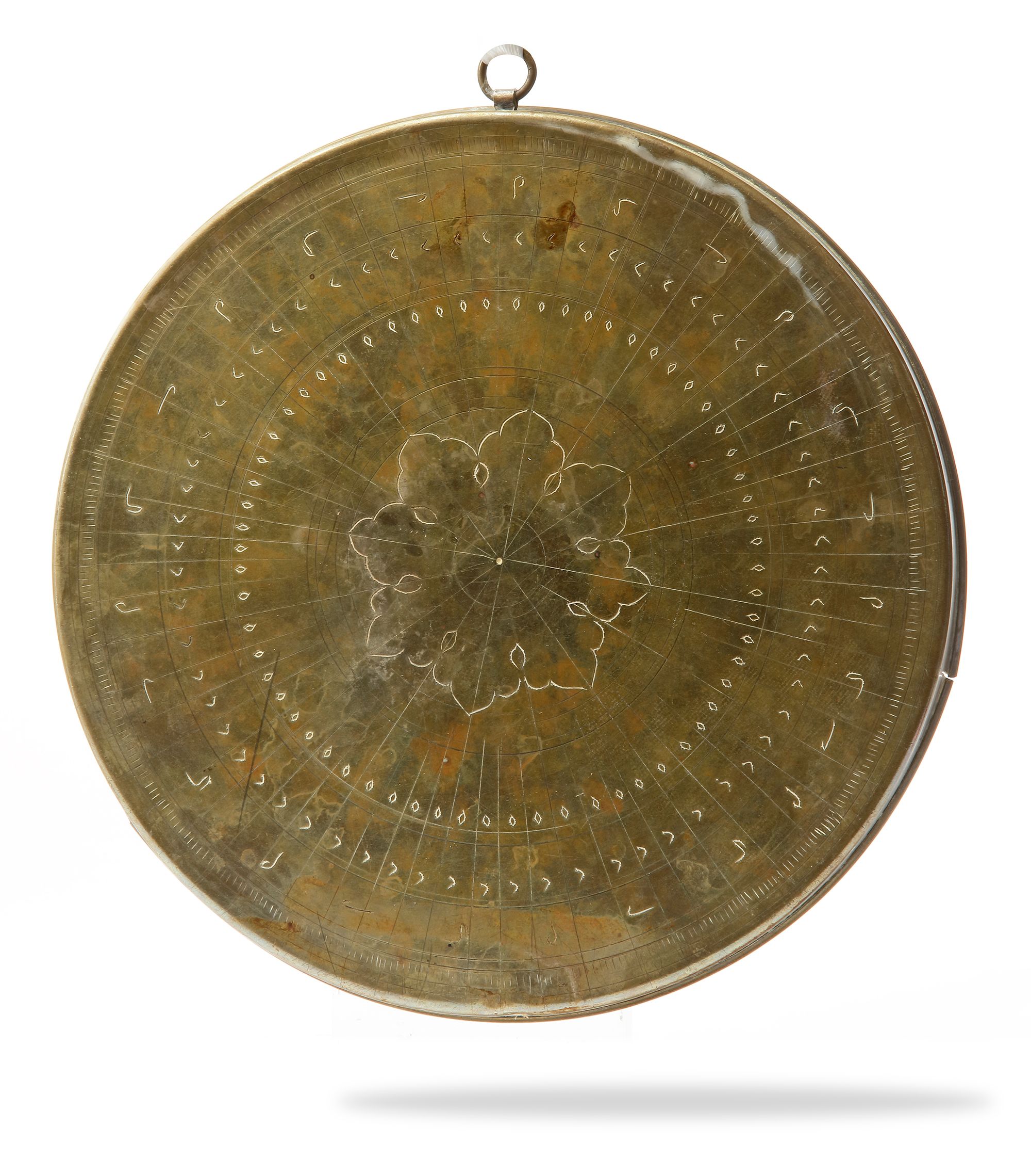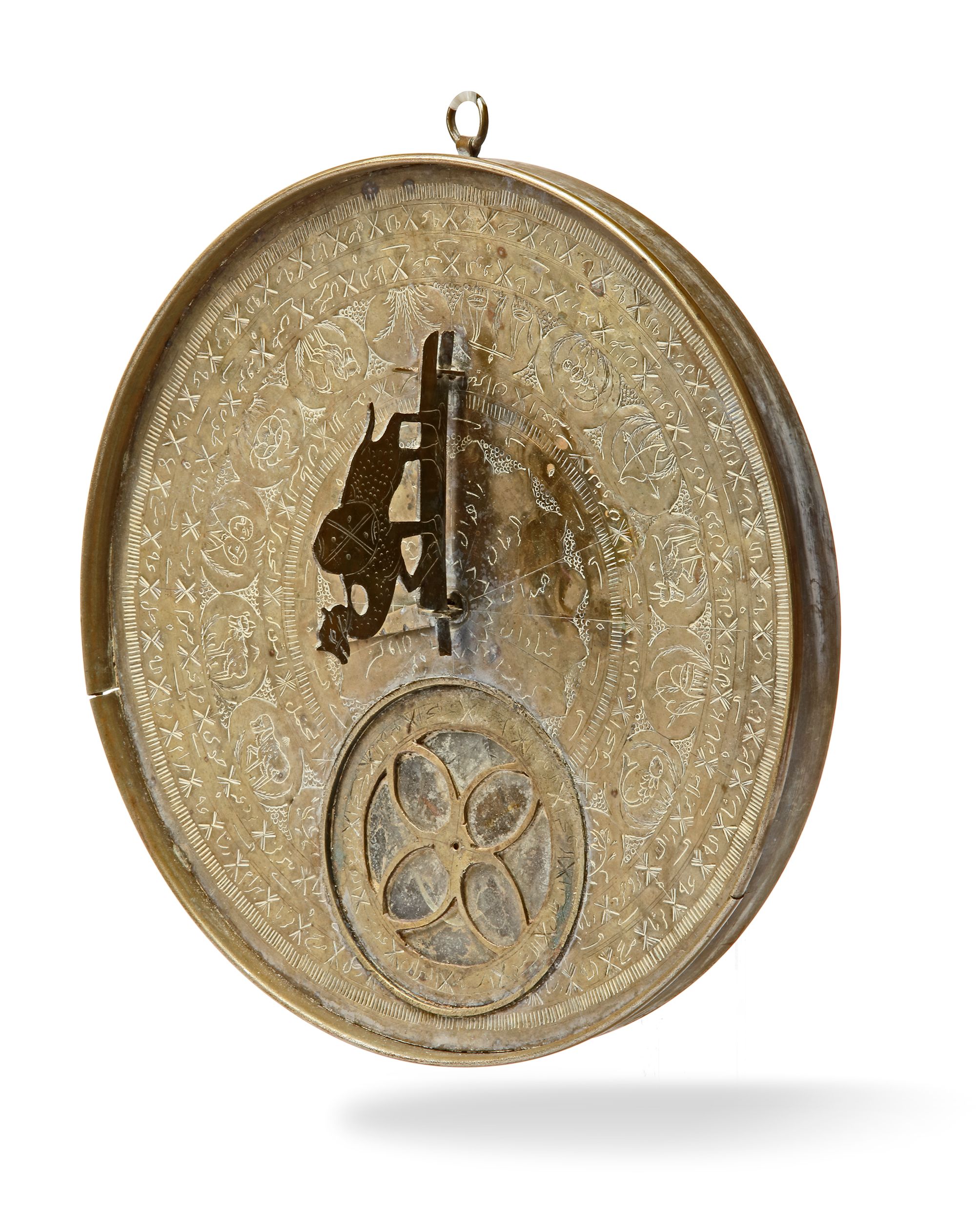 A Qajar engraved brass Qibla indicator, the lid opening, the face engraved with astrological signs. Indicator