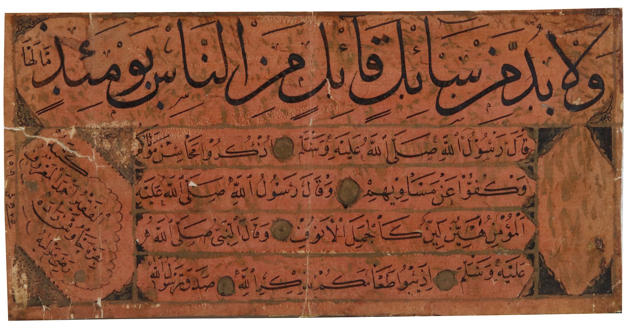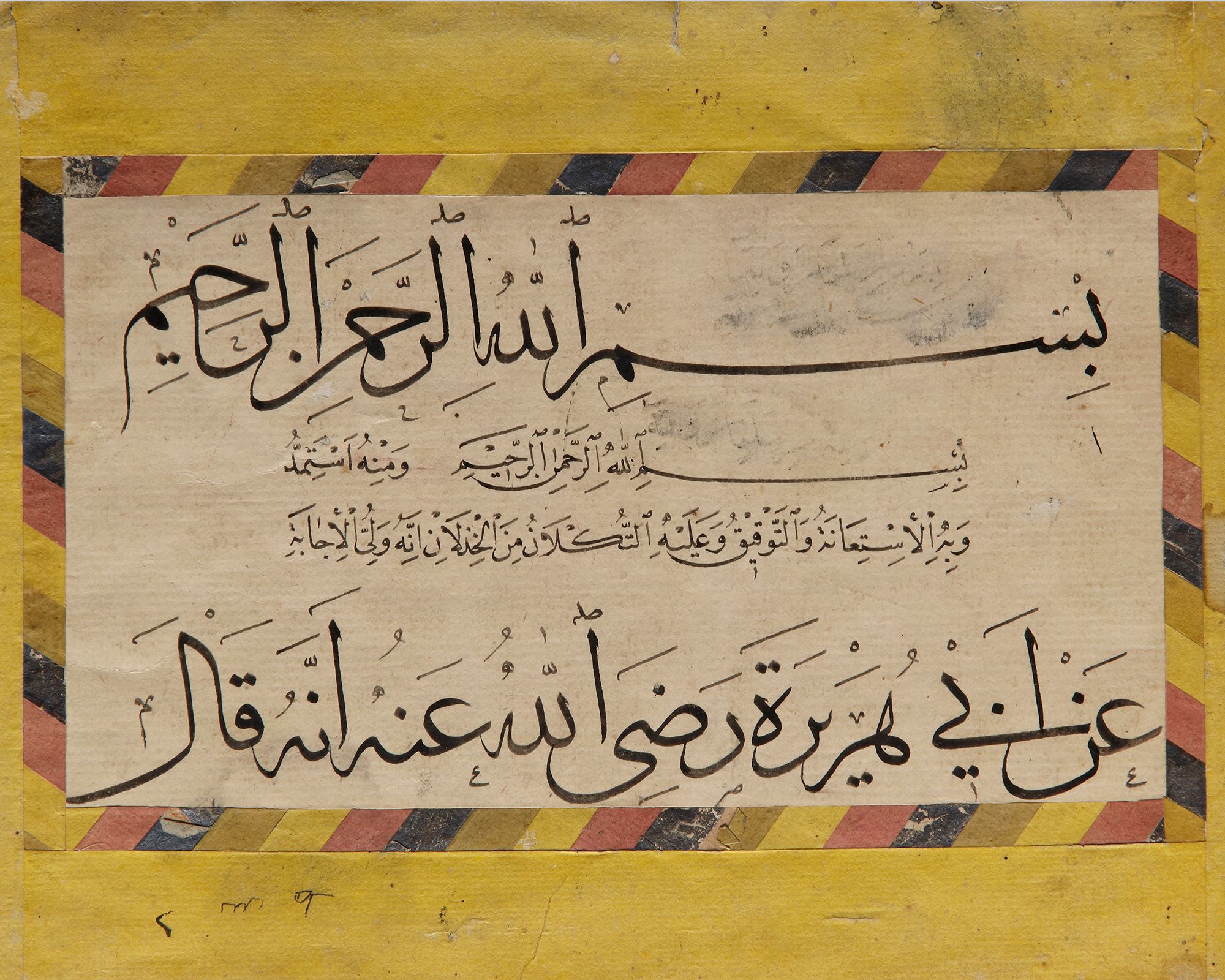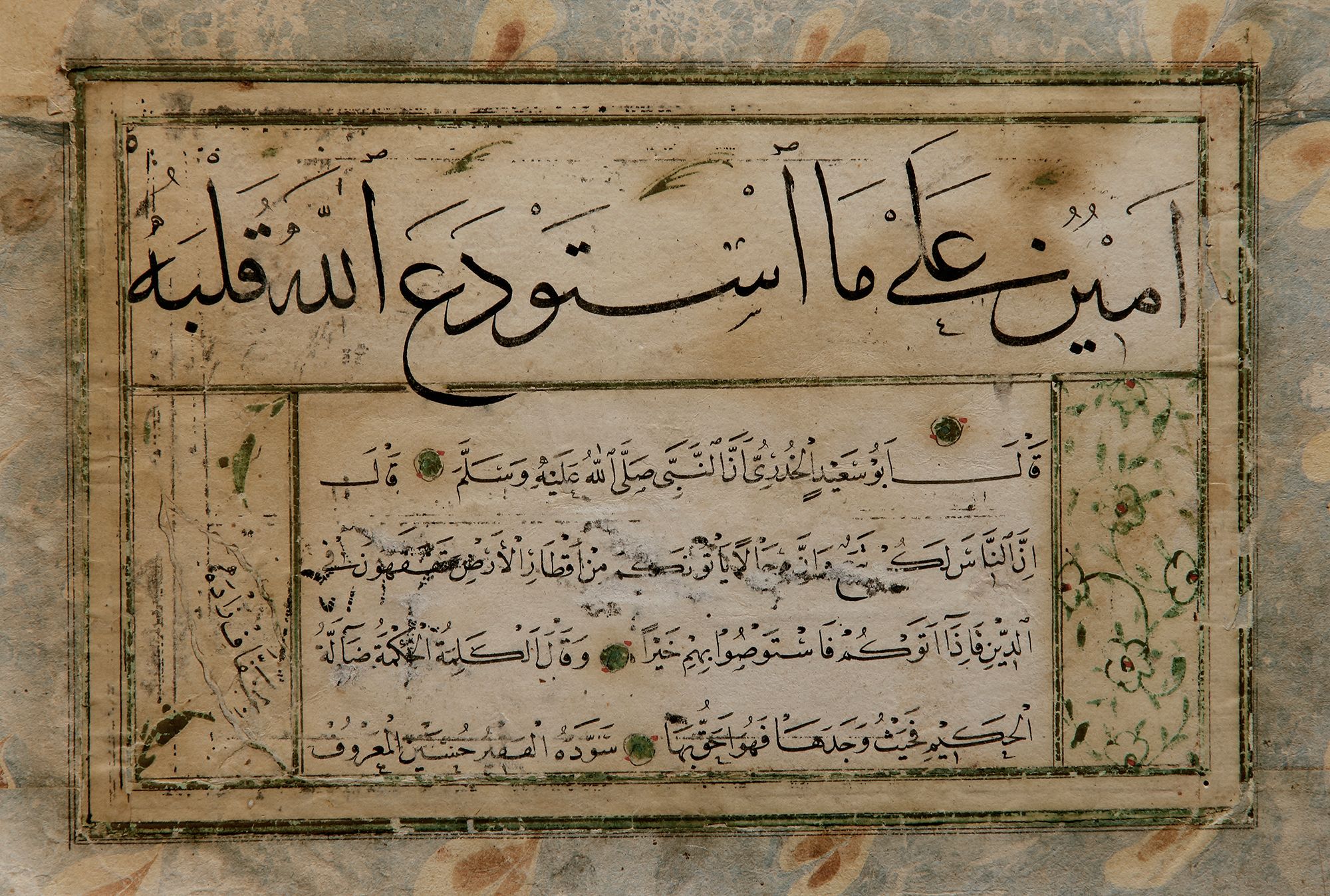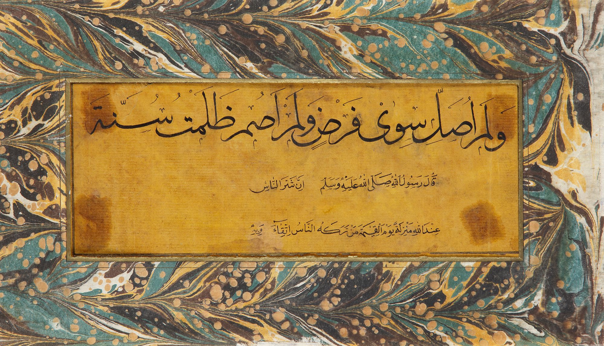 Including sayings of the Prophet, Arabic manuscript on paper, laid down between gold rules on colored or marbled paper. Each of the qitas with lines of large thuluth above and lines of smaller naskh script, some panels with floral flourishes. Signed by Ahmed jewish Zadeh in 1199 AH/1785 AD and Hussein Khafaf Zadeh 12th AH/18th AD. Calligraphy from 20 by 13 cm. to 18 by 9 cm.