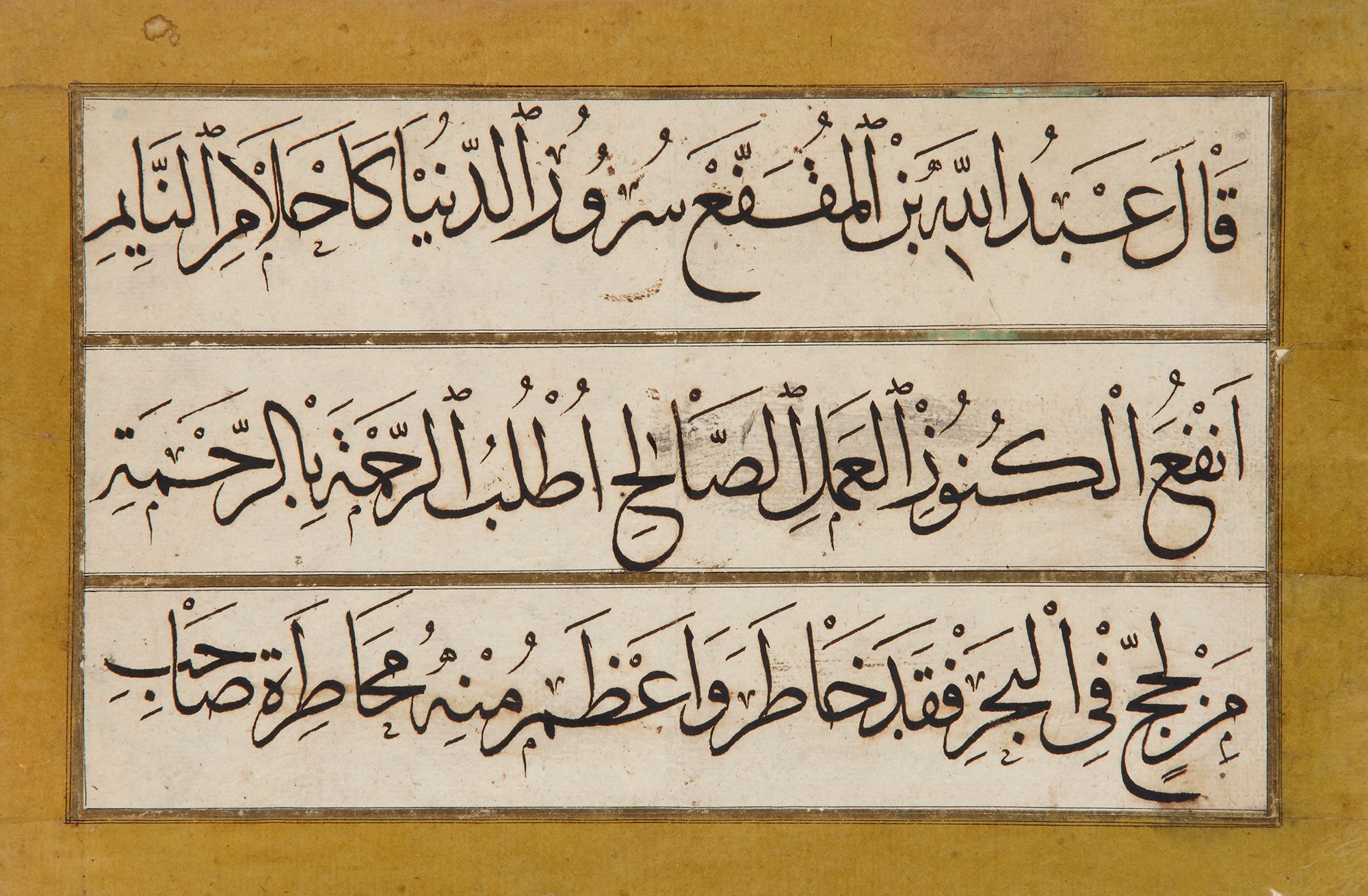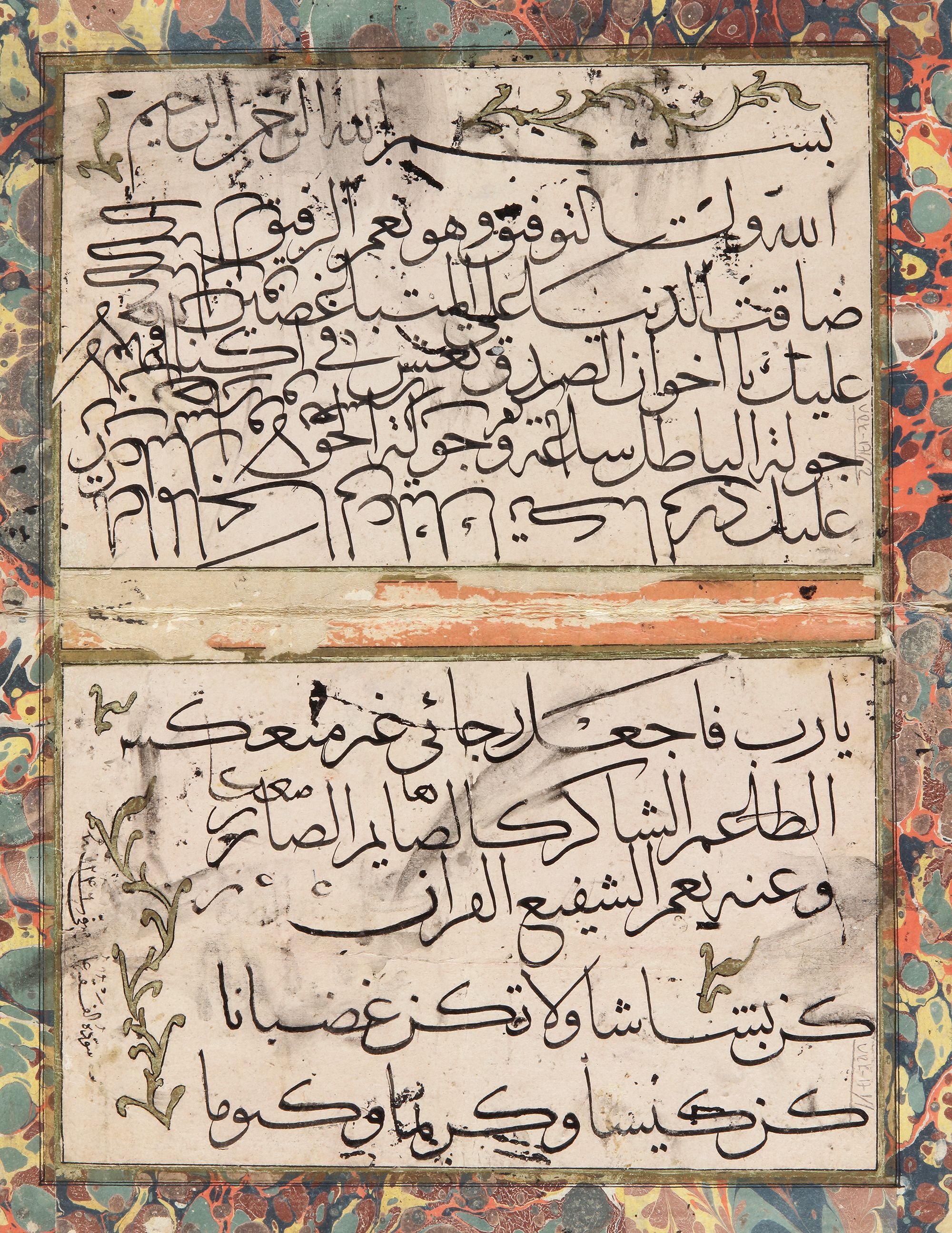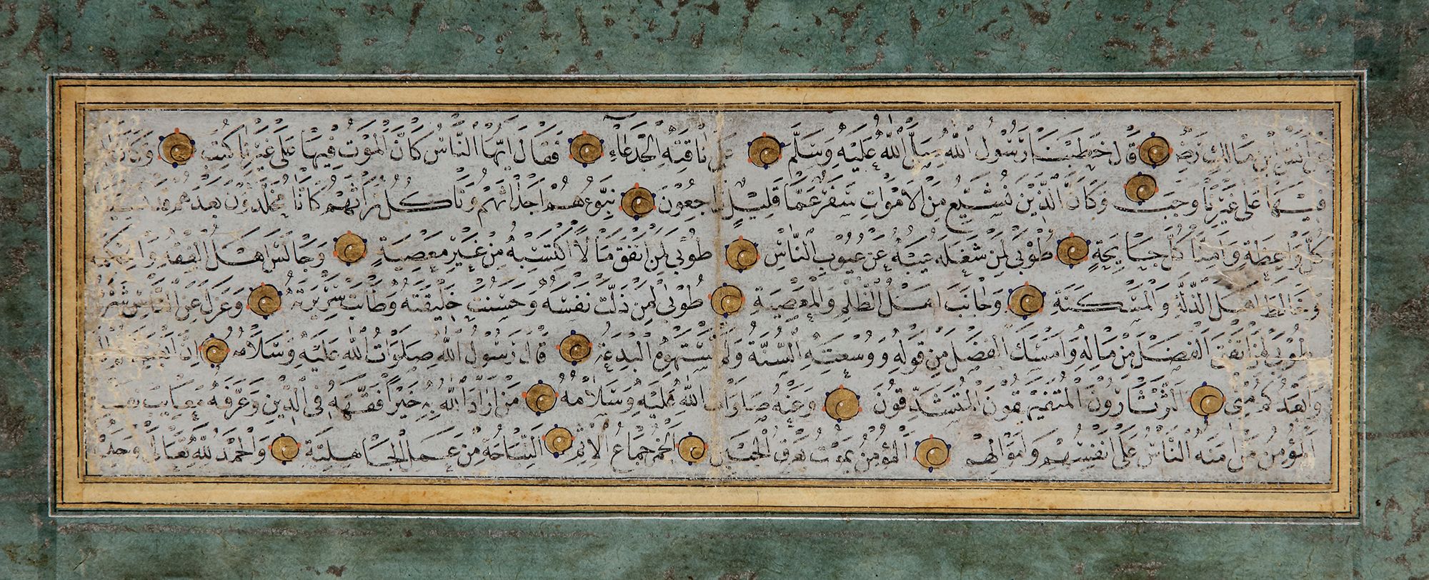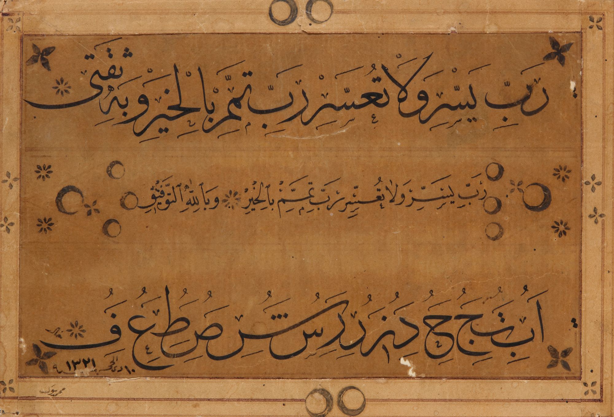 Arabic manuscript of calligraphy, paper mounted on card. Three calligraphic panels or ‘Muraqqa’ including sayings of the Prophet, written in black naskh script with gold markers within gold borders. Two calligraphic exercises or ‘Mashq’ with ink on paper, with lines of black naskh and thuluth scripts, heightened with green and gold borders, mounted on marbled paper. With the signature of Ali Alrusafi 1236 AH/1821 AD and Muhammed Rasul 1321 AH/1903 AD Calligraphy from 21 by 28 cm. to 16 by 10 cm.