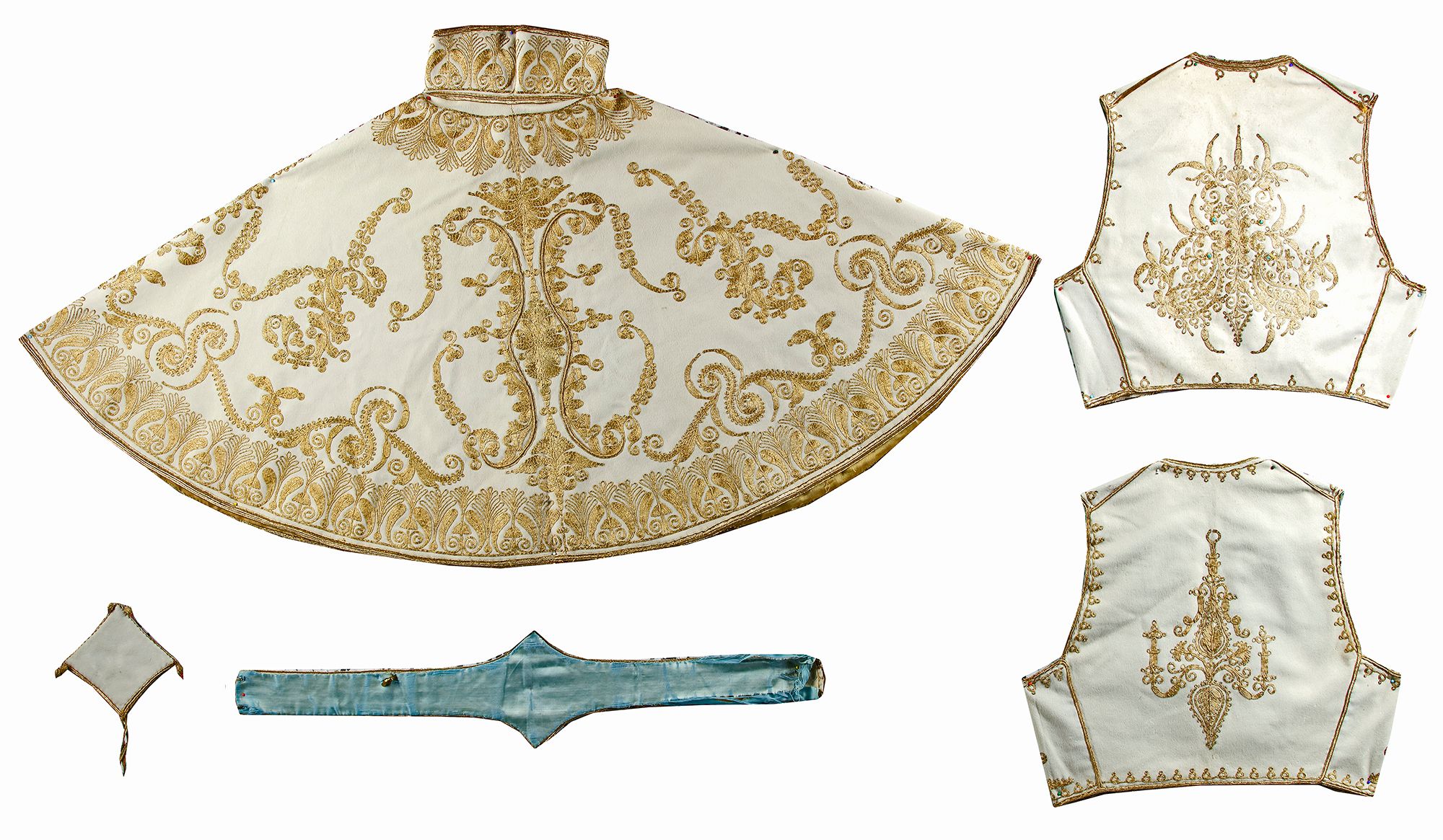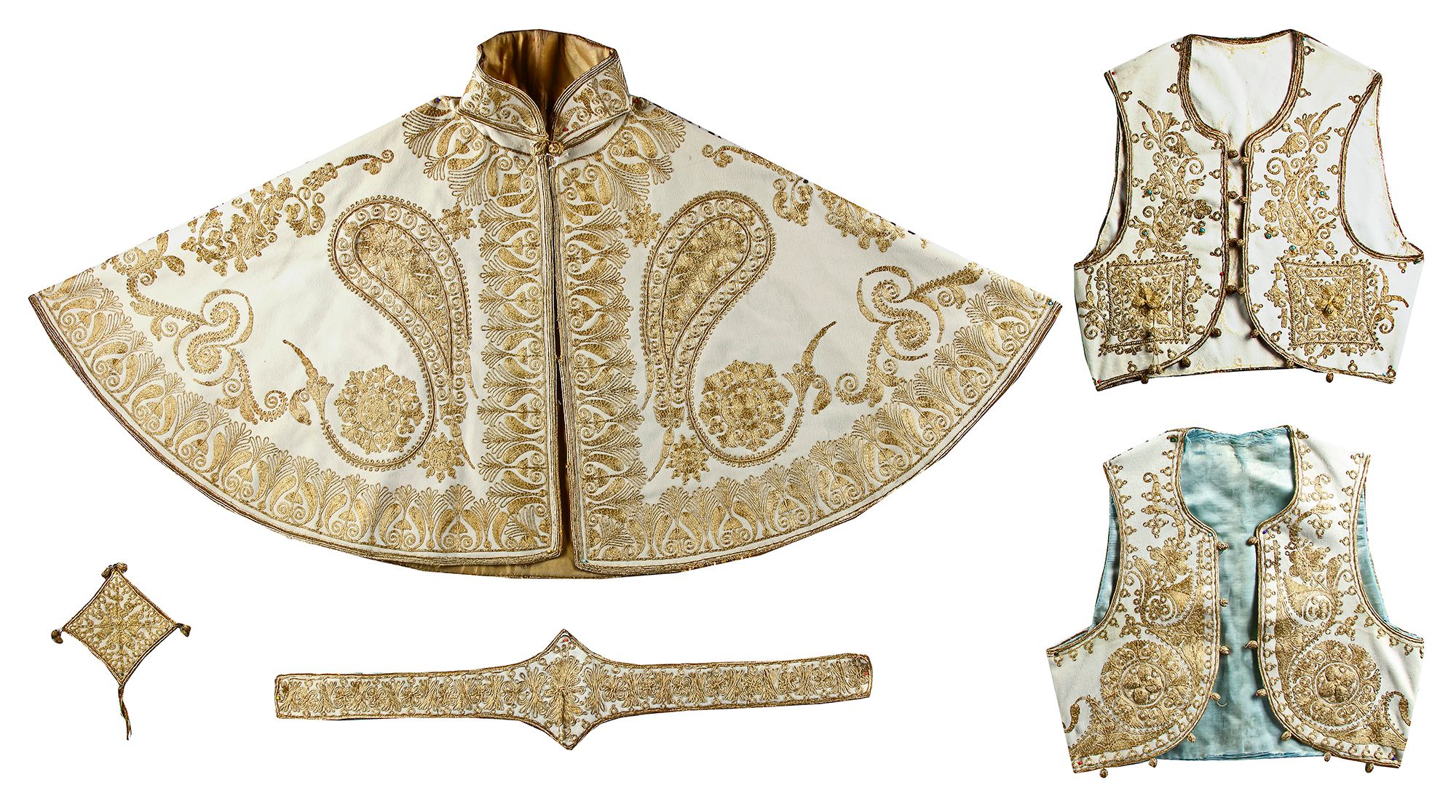 Four embroidered Ottoman pieces dating from the 1890s /1900s - Victorian / Edwardian eras. A matching set consisting of cape 108 cm, vest / yelek 35 by 37 cm and belt 62 cm.