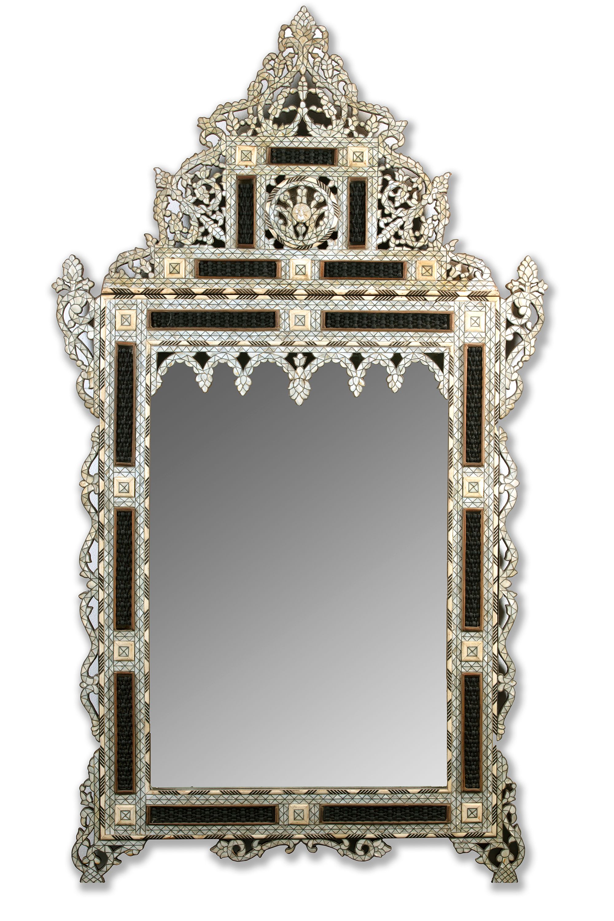 The wooden frame with pierced lattice panels, pierced arabesque corner pieces, borders and upper spandrels inset with mother-of-pearl and silver wire within ivory and ebony striped borders, the scrolling pediment with floral sprays around a military trophy panel. 175 by 99.5 cm.