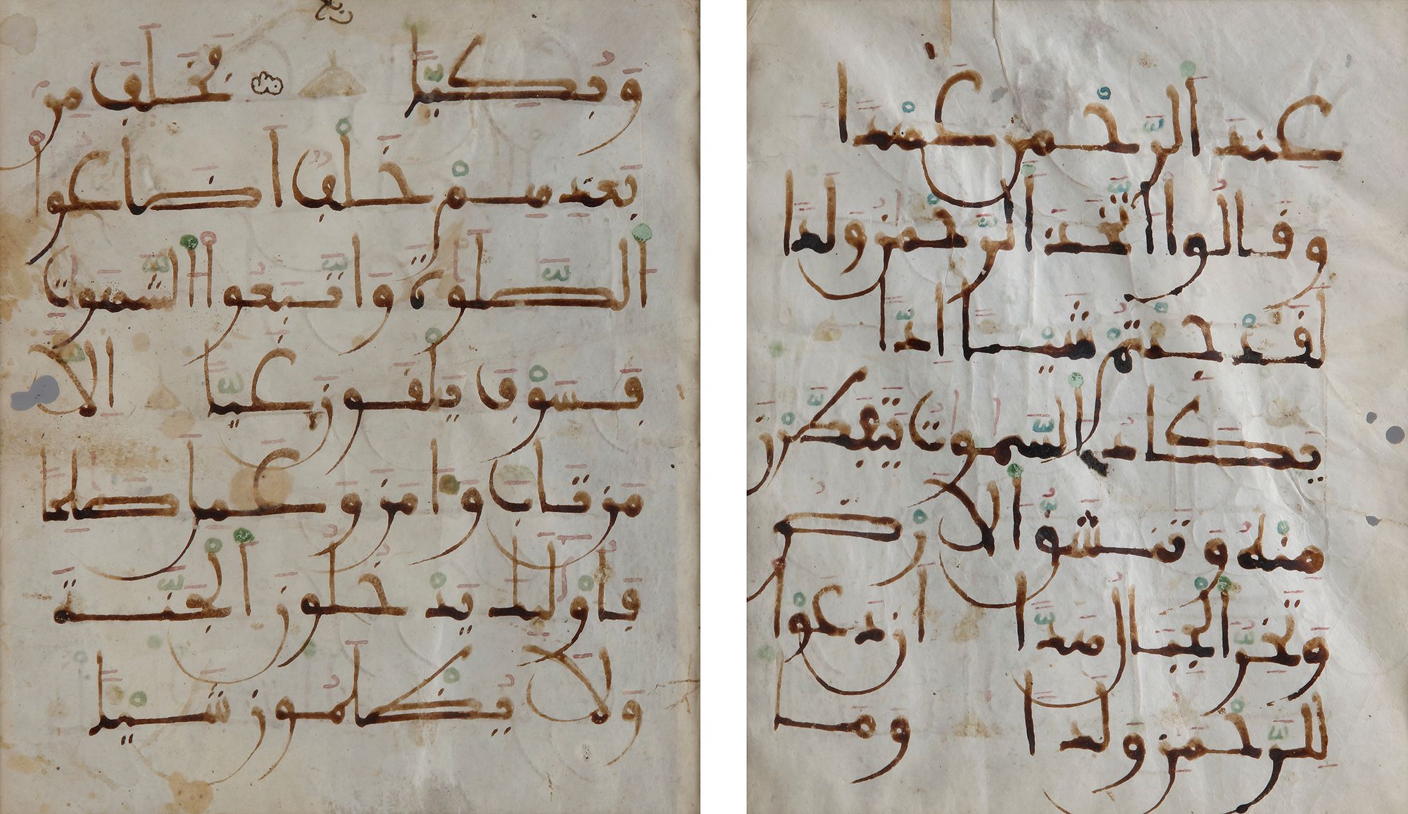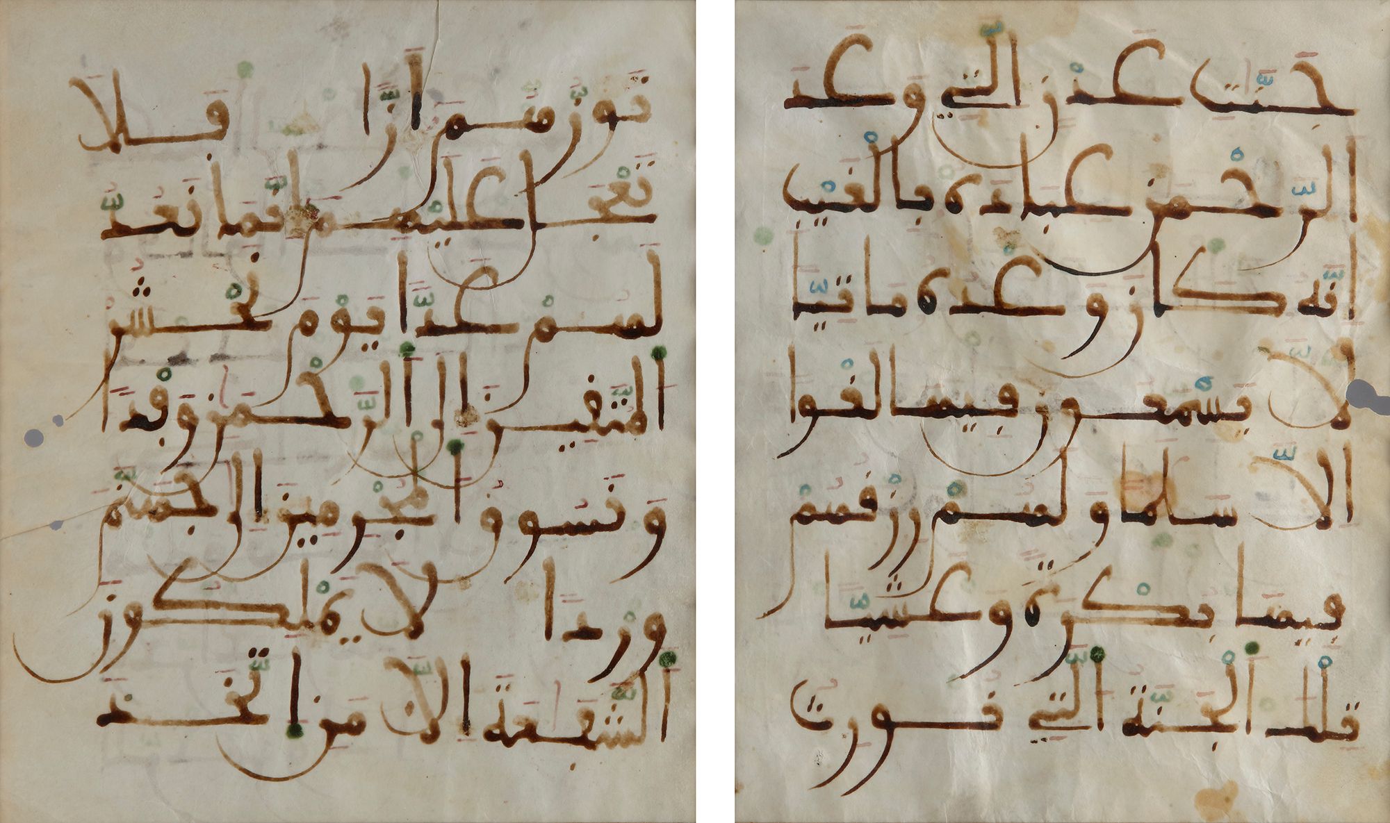 An Arabic manuscript on paper, 2 leaves with 7 lines of fine sepia Kufic script in brown ink with diacritics and vowel points in blue and red. Quran 19 surah Maryam, named after the Virgin Mary of Christian belief. From v.59-v.63 and from v.83-v.91. Framed and glazed. Each folio: 25 by 21.5 cm.
