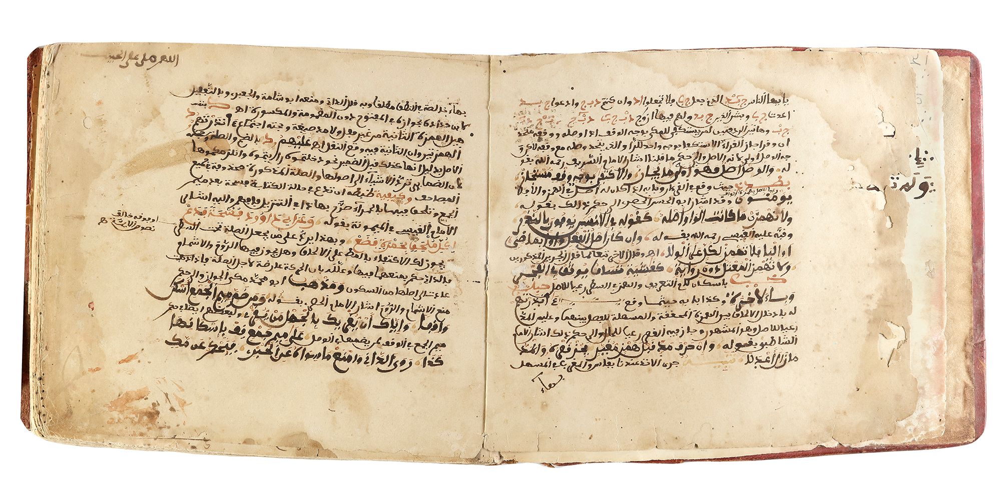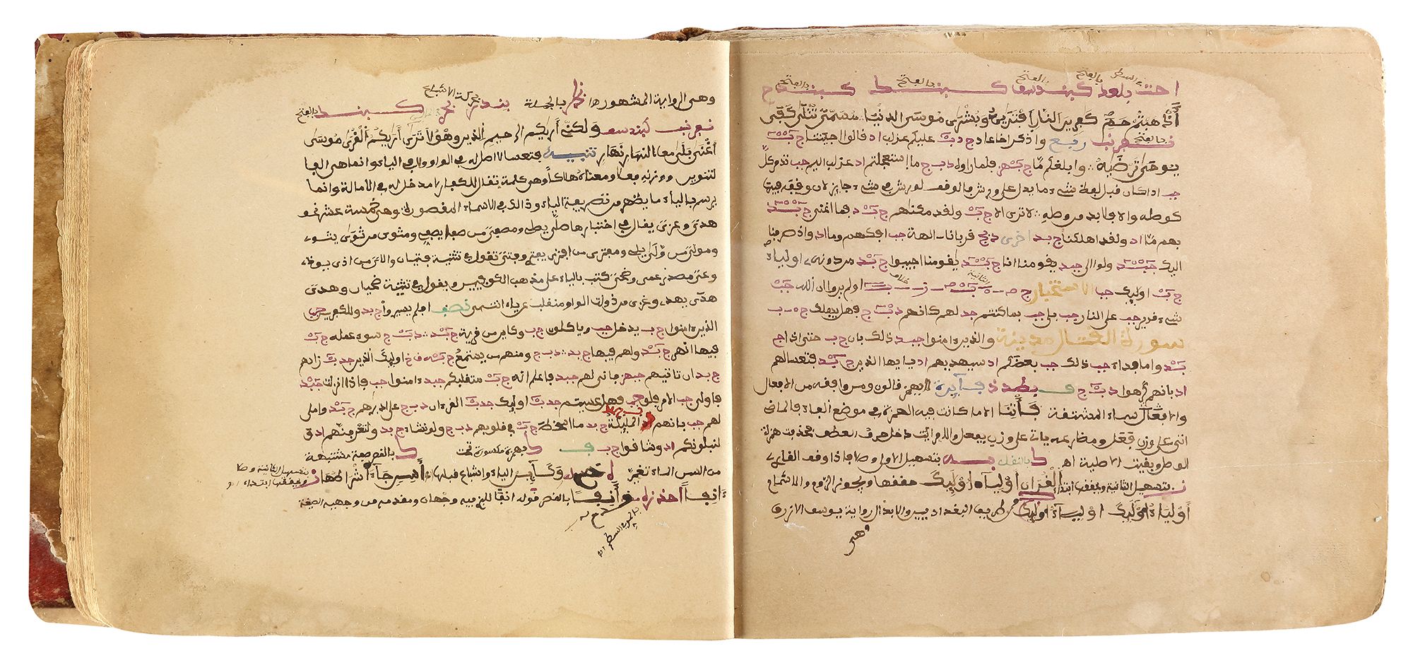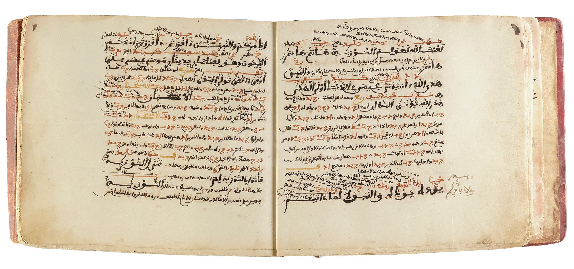 Arabic manuscript on pair, 17 lines to each page, written in black and red Magribi script, catchwords in blue and yellow.