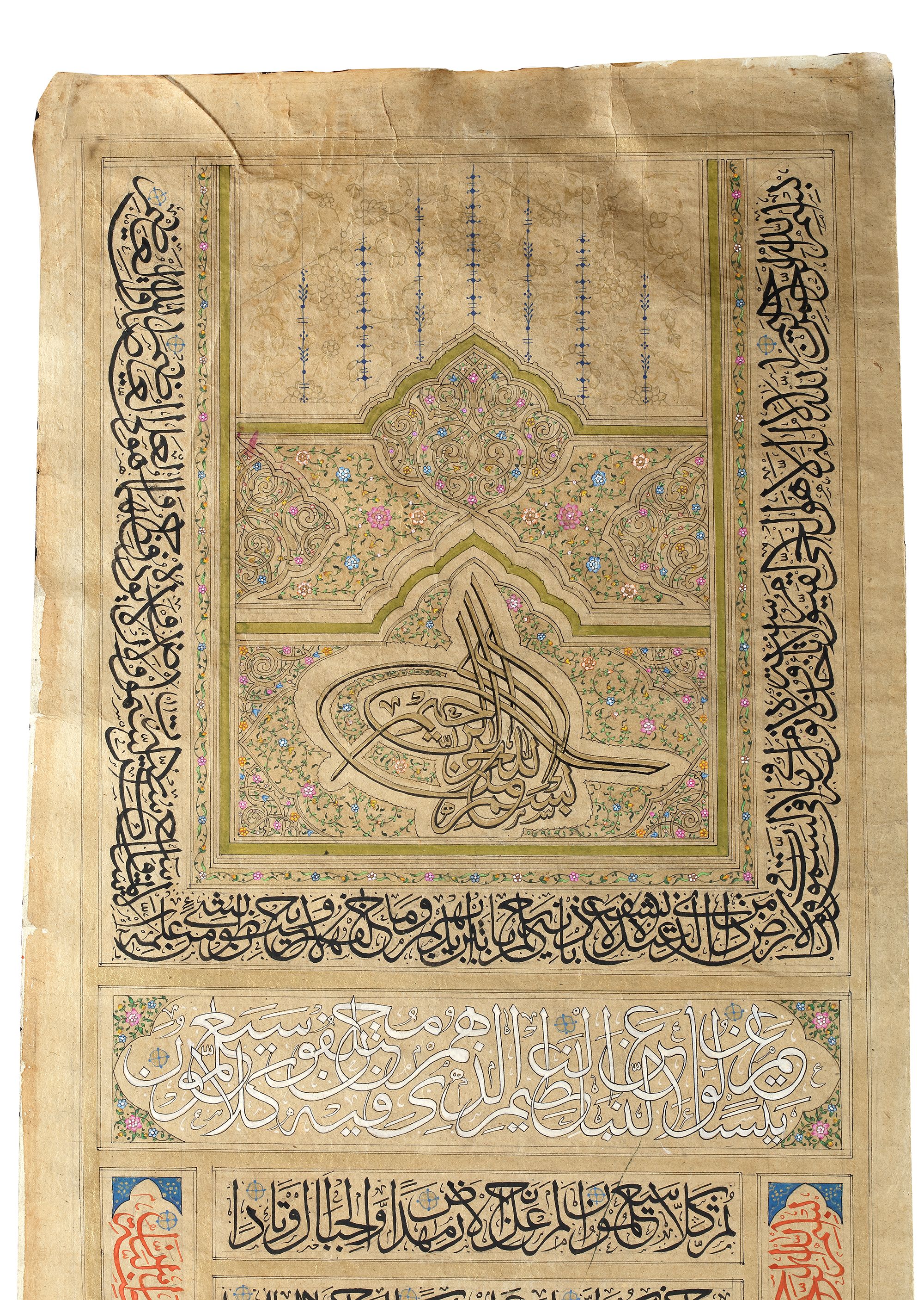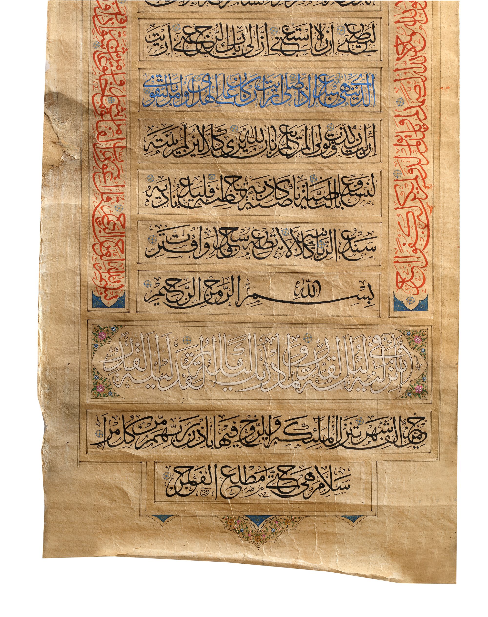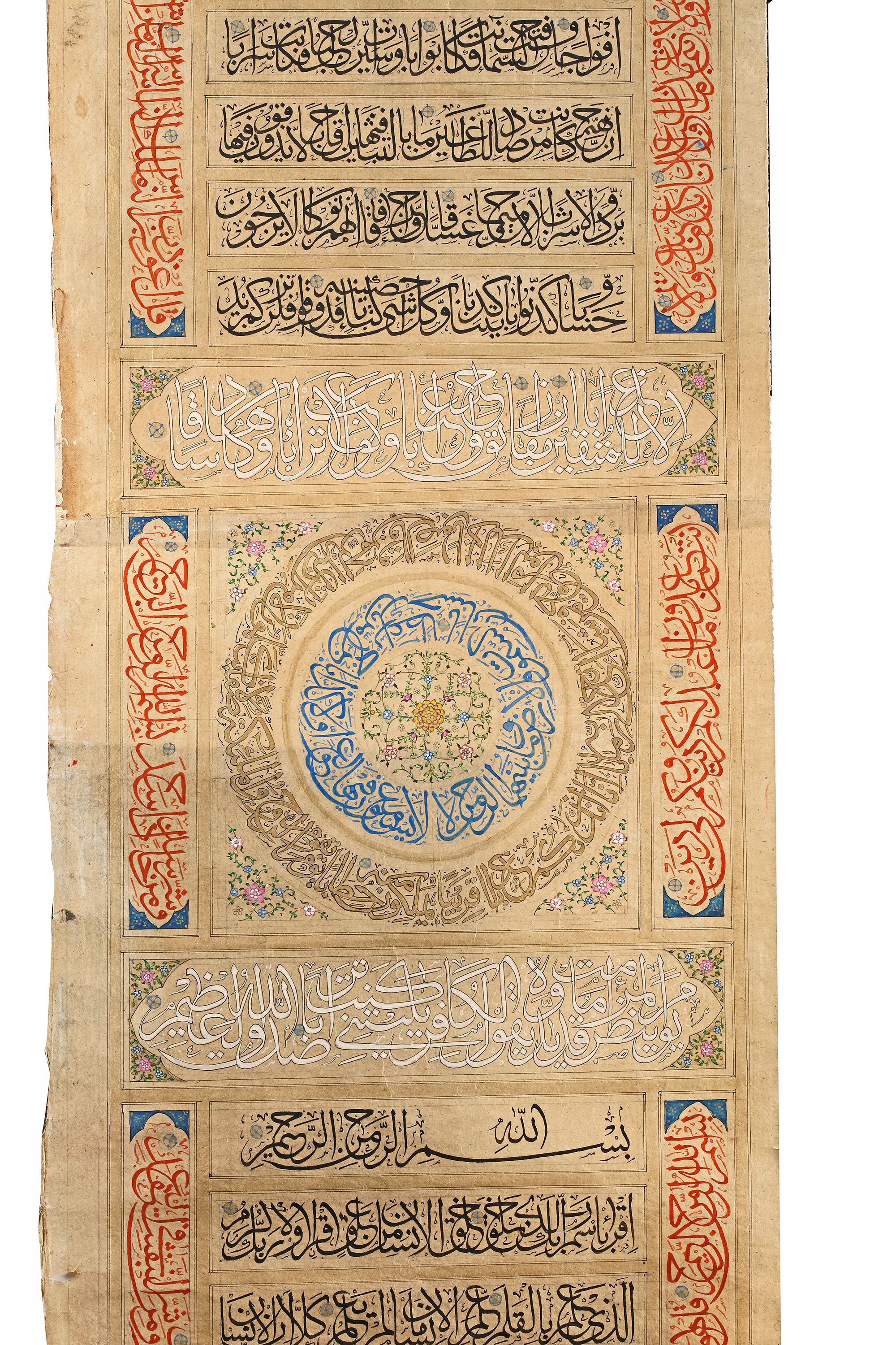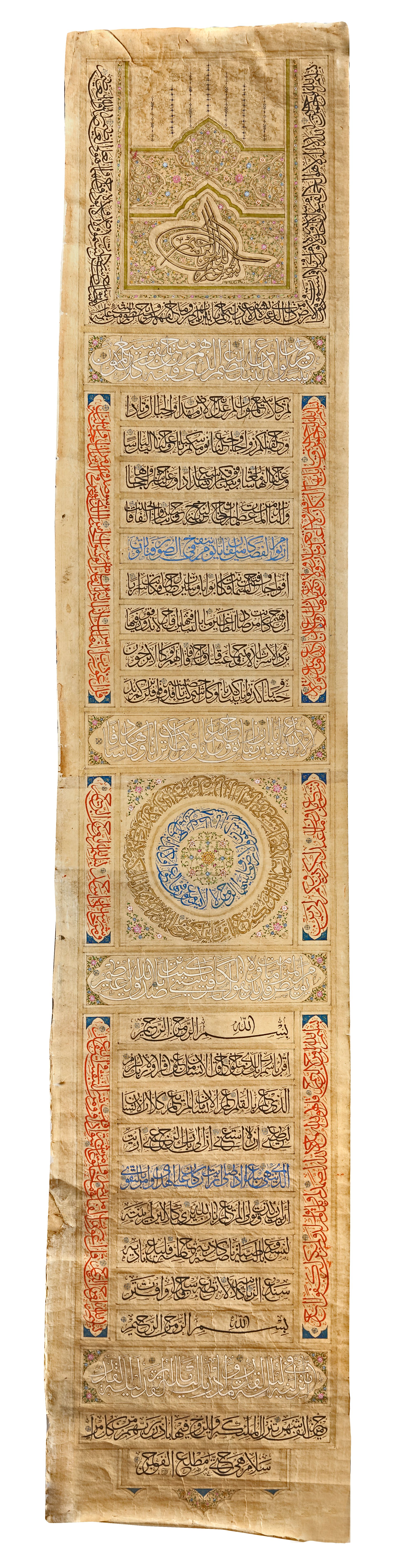 An Arabic calligraphy board divided into five sections, in which: the first section: Basmala written in Altughara script, in black and gold, surrounded by a decoration of roses and leaves, and framed by the vv. Al-Kursi Quran 2 surah Al-Baqarah. The second section: surah Al-Naba’a is written in ten lines, and on the two sides in a vertical column, surah Al-Kafirun and surah Al-Nas are written. The third section: it contains the surah Al-Naba’a in the form of a circle in blue, surrounded by a larger circle in golden color, and the voids were filled with a decoration of roses and leaves, and the surahs of the Al-Kafirun and Al-Nas on the two sides are completed. The fourth section: it contains surah Al-Alaq in eight lines, and on both sides are surah Al-Ikhlas and surah Al-Falaq in a vertical column. The fifth section: it contains surah Al-Qadr in four lines. The painting is written in thuluth script in black, gold, blue, red and white color on a roll. 158 by 30 cm.