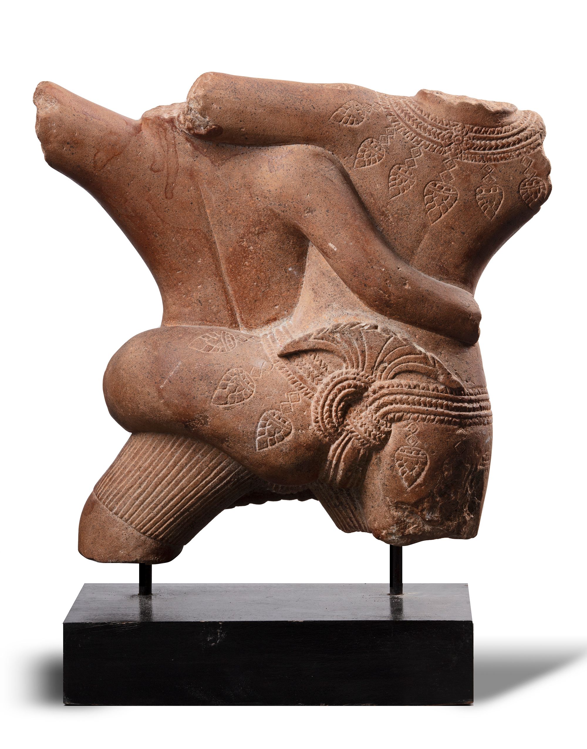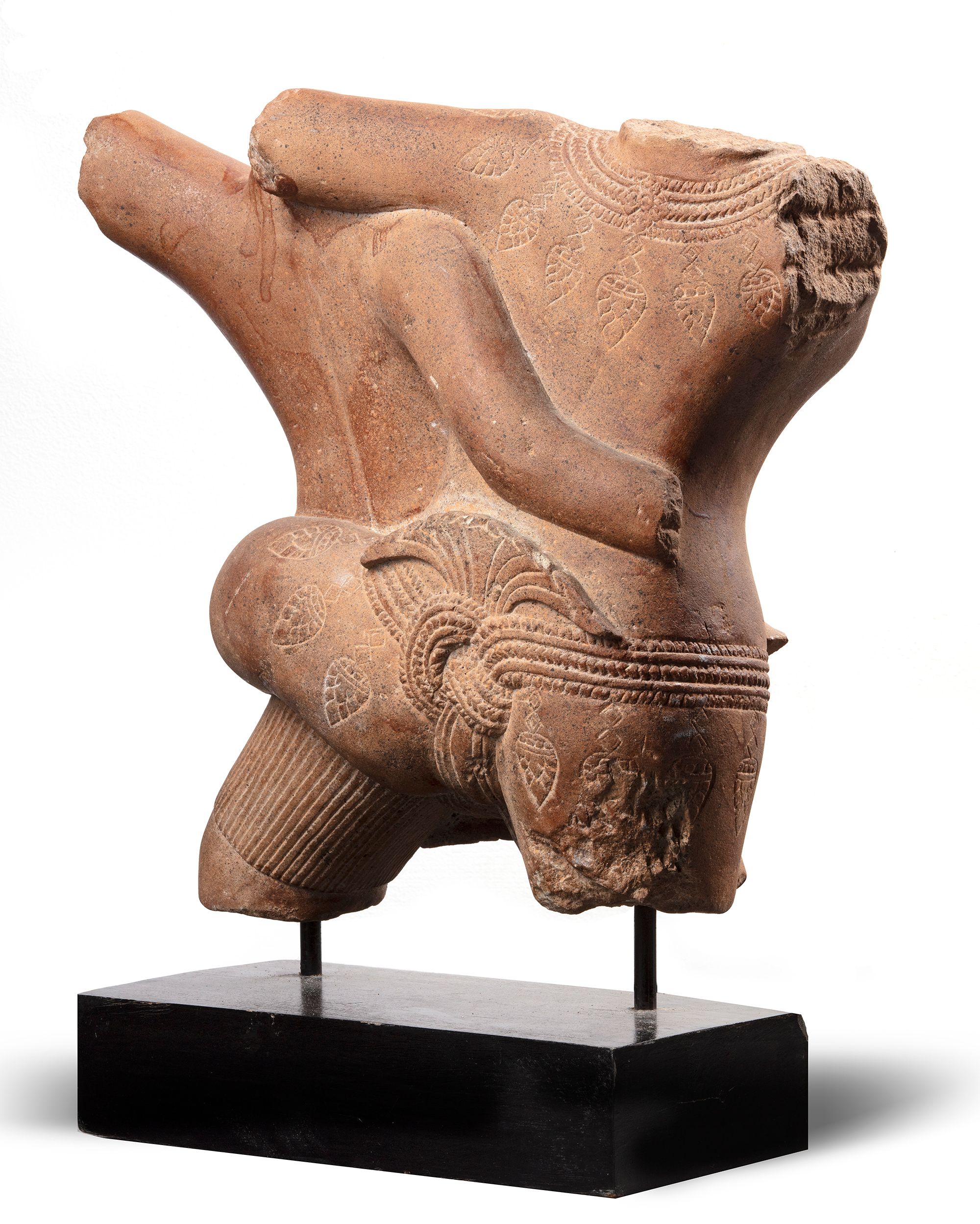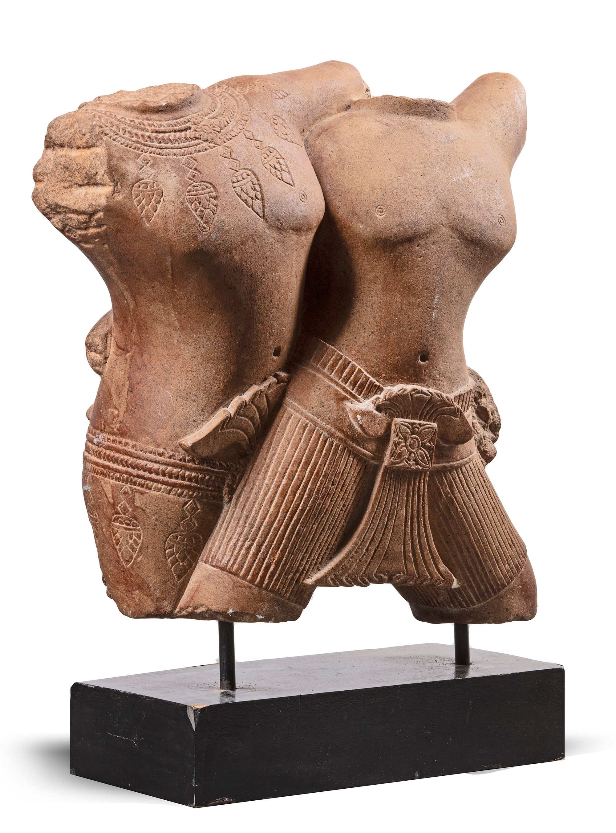 A conjoined pink sandstone torso carving of a couple, wearing a sampot secured with a belt and with a fish-tail shaped sash falling to the front, the bare torso naturalistic and the surface smoothly polished.