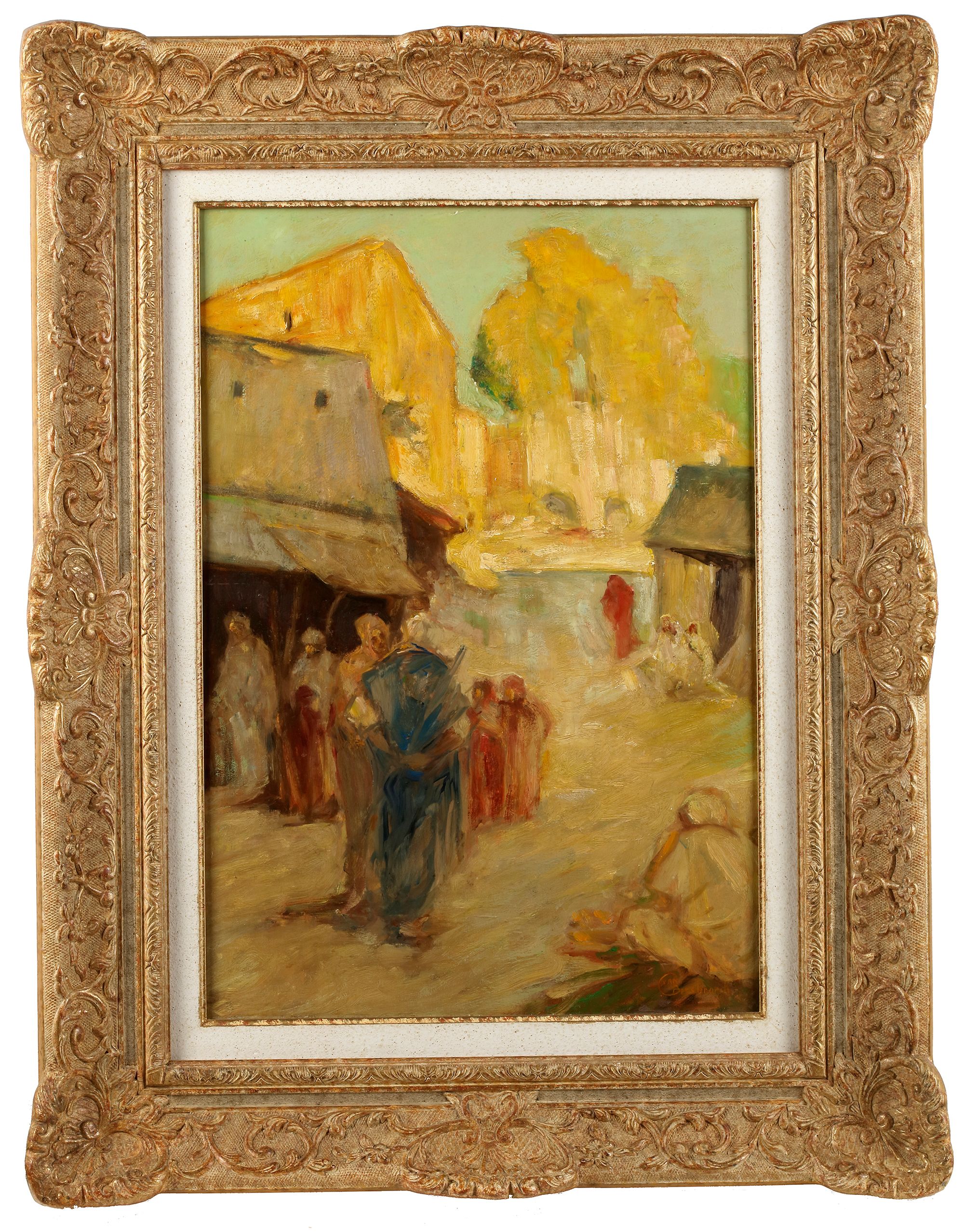 JULES van BIESBROECK (Belgian 1873-1965.) A street conversation in a town-centre. Signed. Oil on panel.