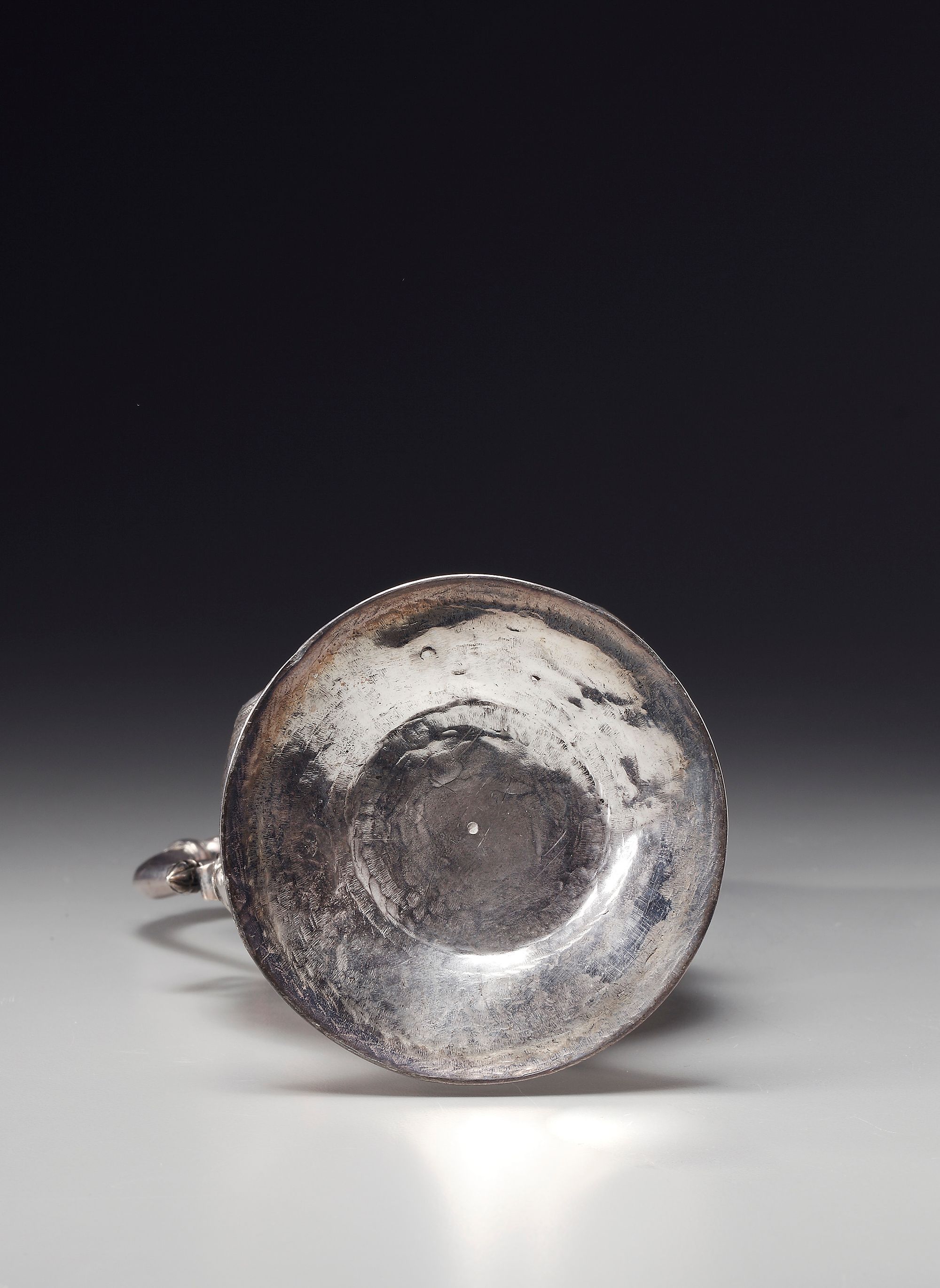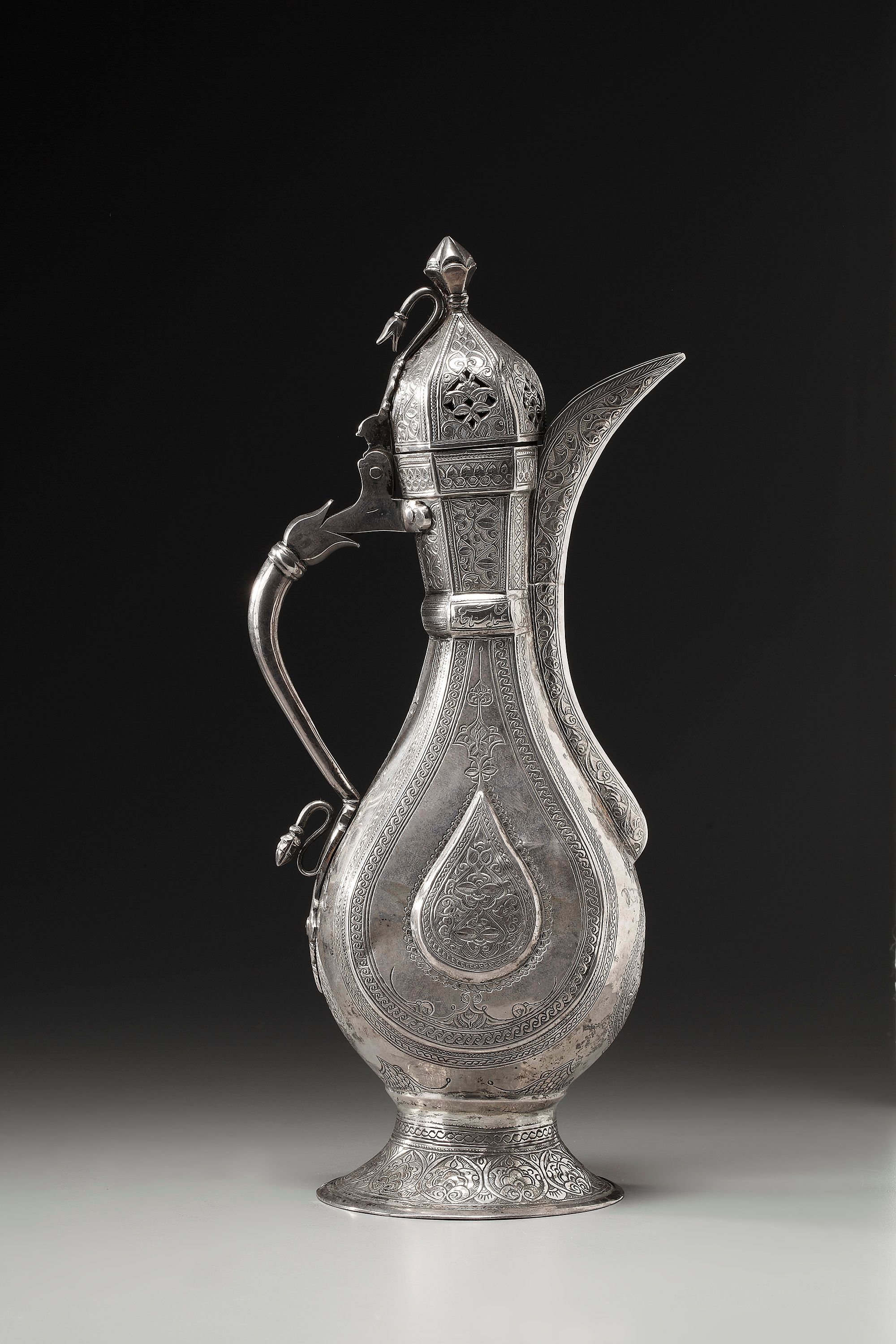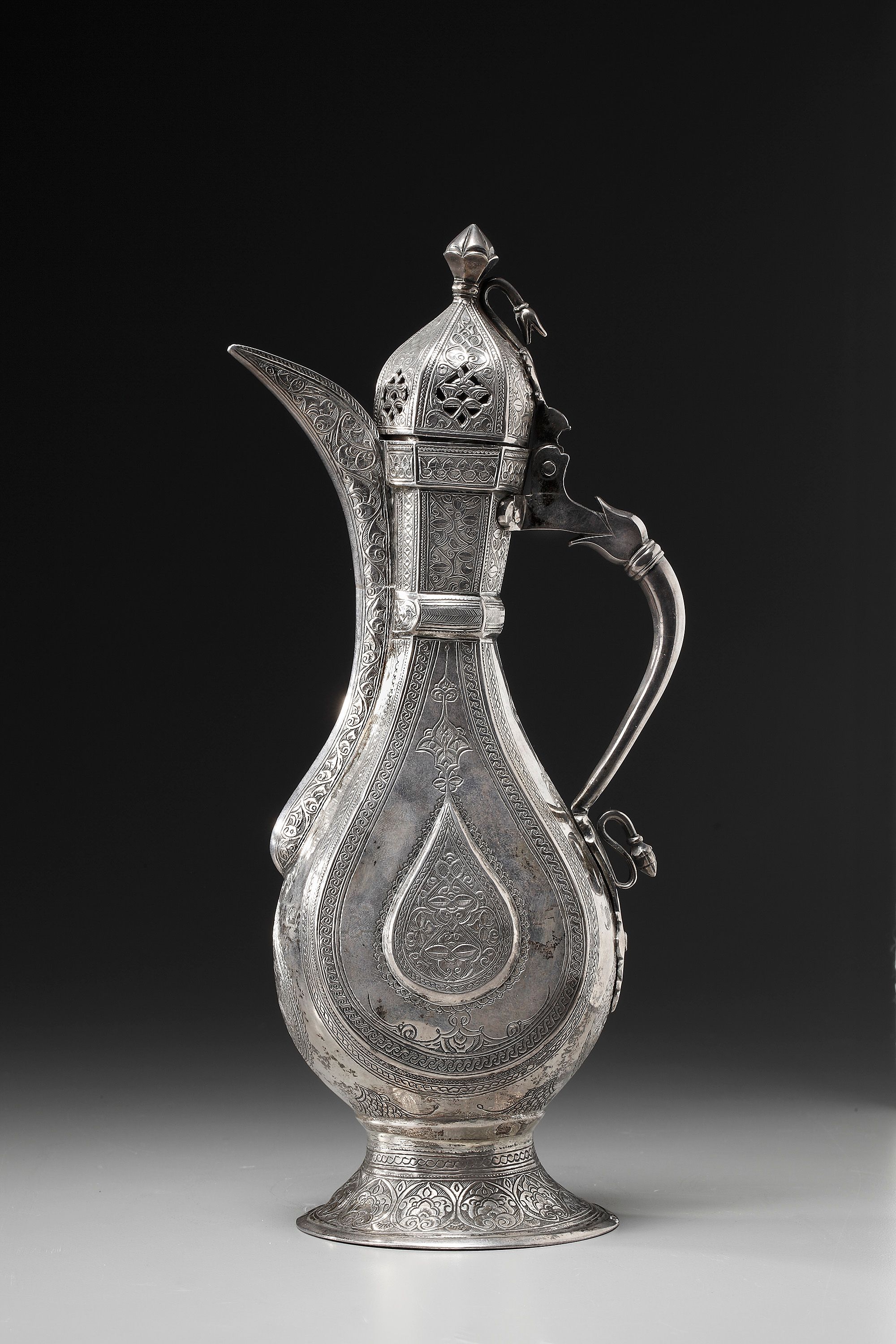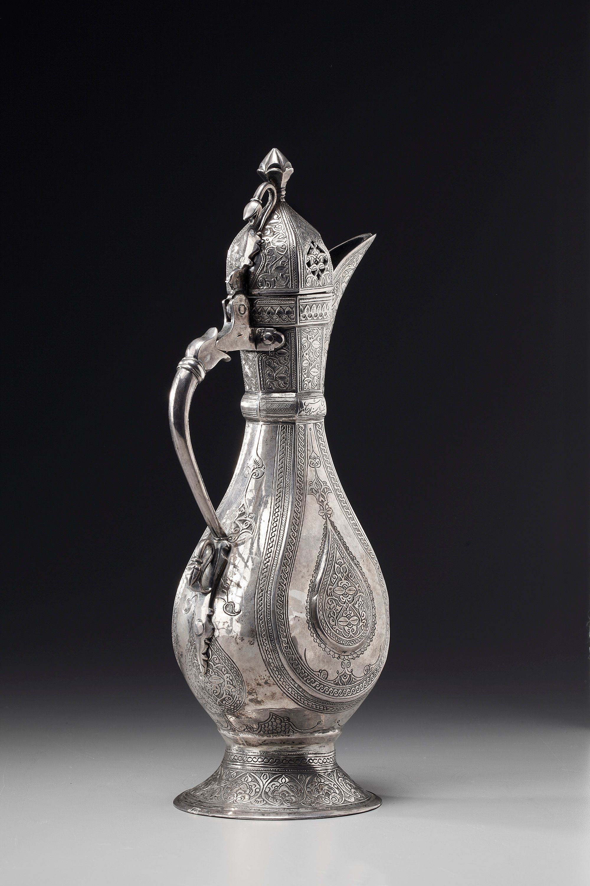 An Ottoman silver ewer of piriform on a splayed fit with hinged domed lid surmounted by a bud finial, curved spout and s-shaped handle and engraved to the body with floral sprays, the lid with scrolling foliate stamped to the foot and with signature to the neck