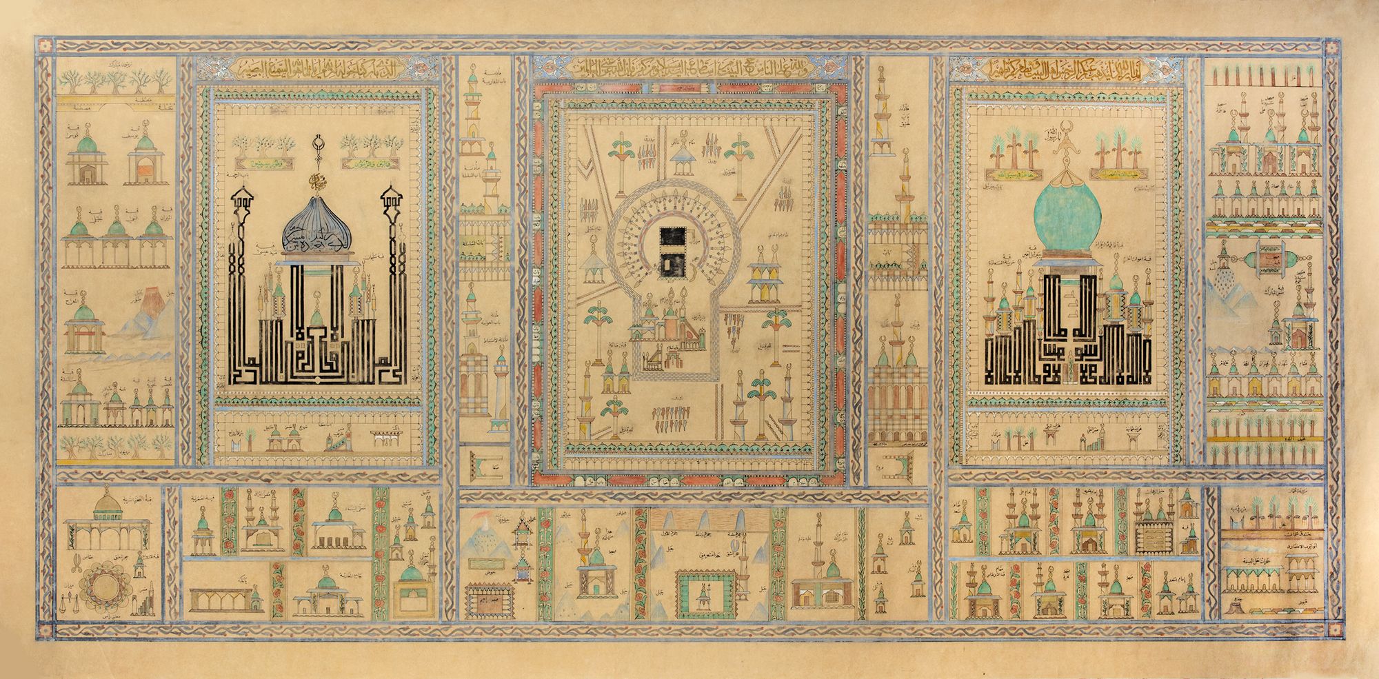AN ISLAMIC PAINTING ON PAPER DEPICTING DIFFERENT MOSQUES, 19TH-20TH CENTURY