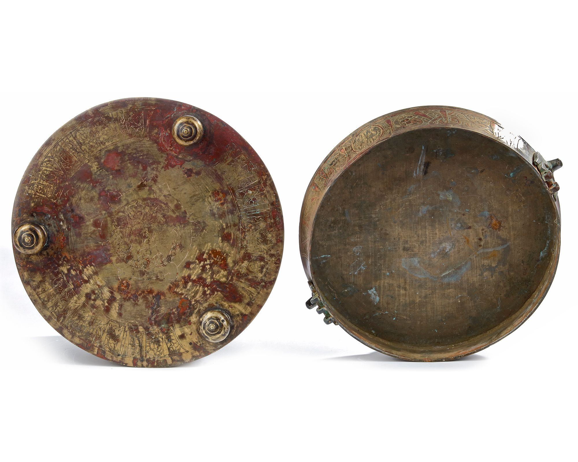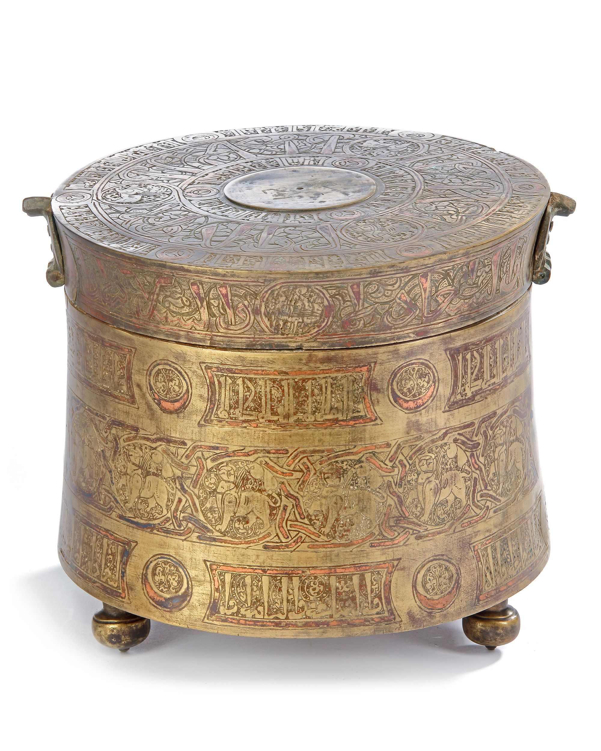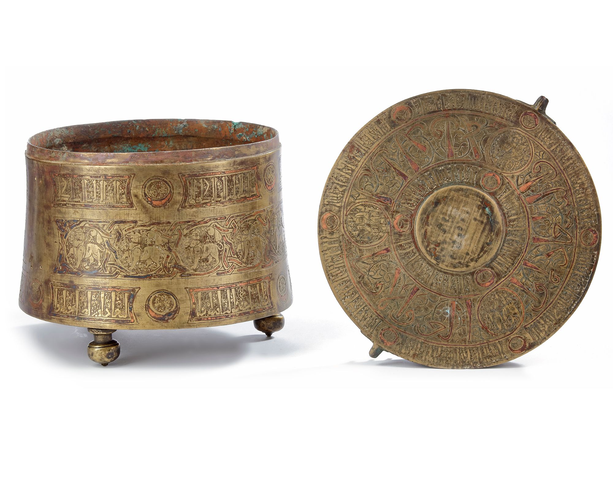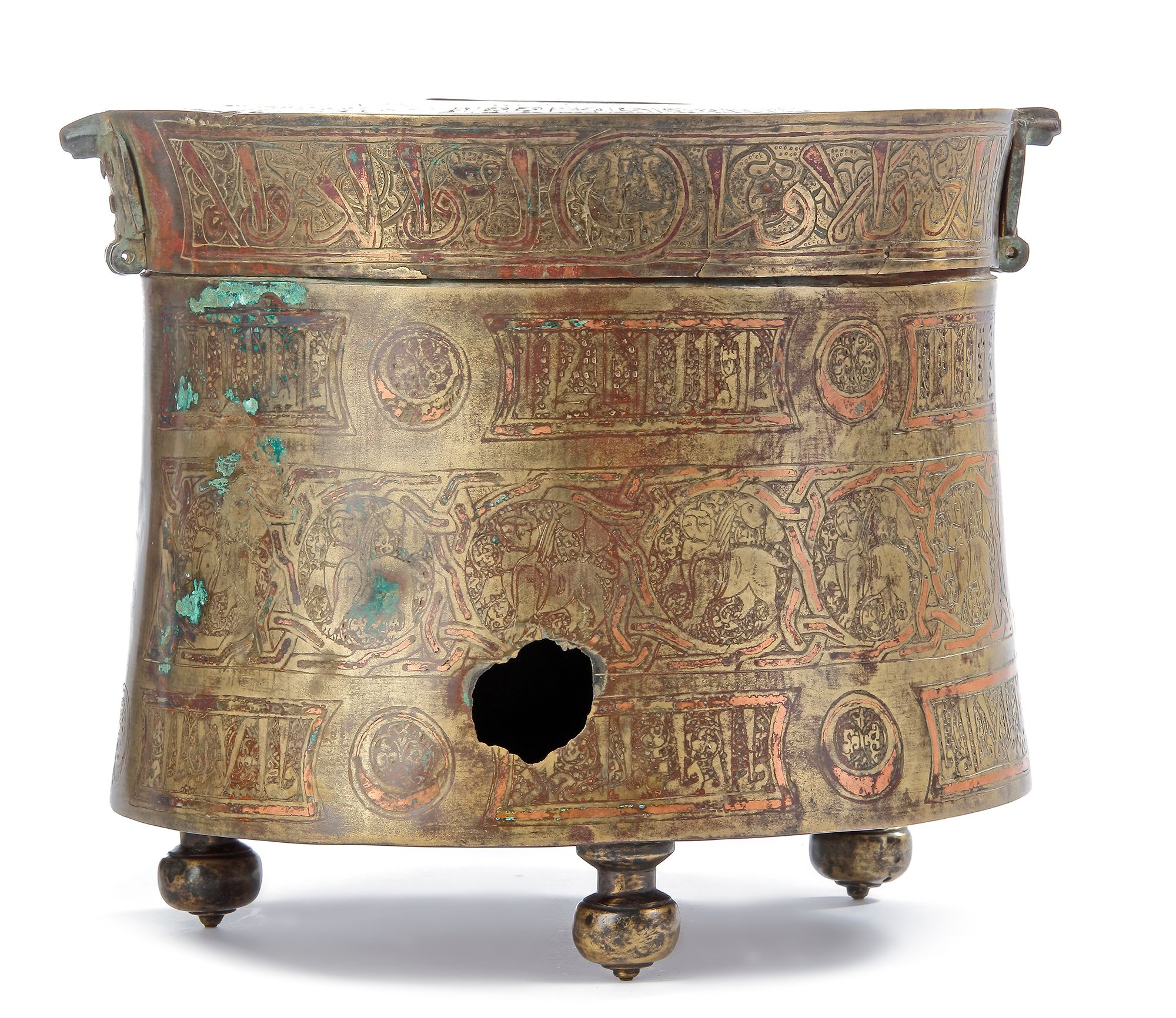 Metalworkers frequently used bronze as the main body for practical objects, however the technique of inlaying with gold, silver, black niello and copper wire was widely popular as a form of decoration. Incisions were made, into which copper wire was hammered, creating a beautiful contrast of the green gold bronze and the red of the copper wire that obtains a beautiful rich patina over time. Such objects convey the wealth of the owner as a conspicuous display, but also tell of their taste and refinement, and Islamic metalwork such as this is one of the greatest surviving remnants of the period, which remains highly prized today.