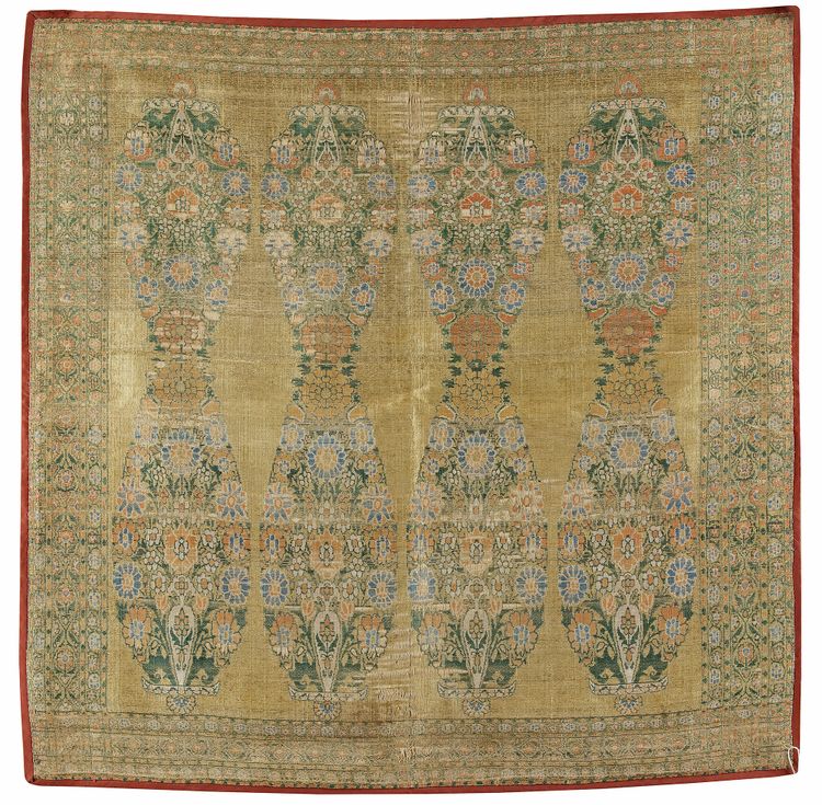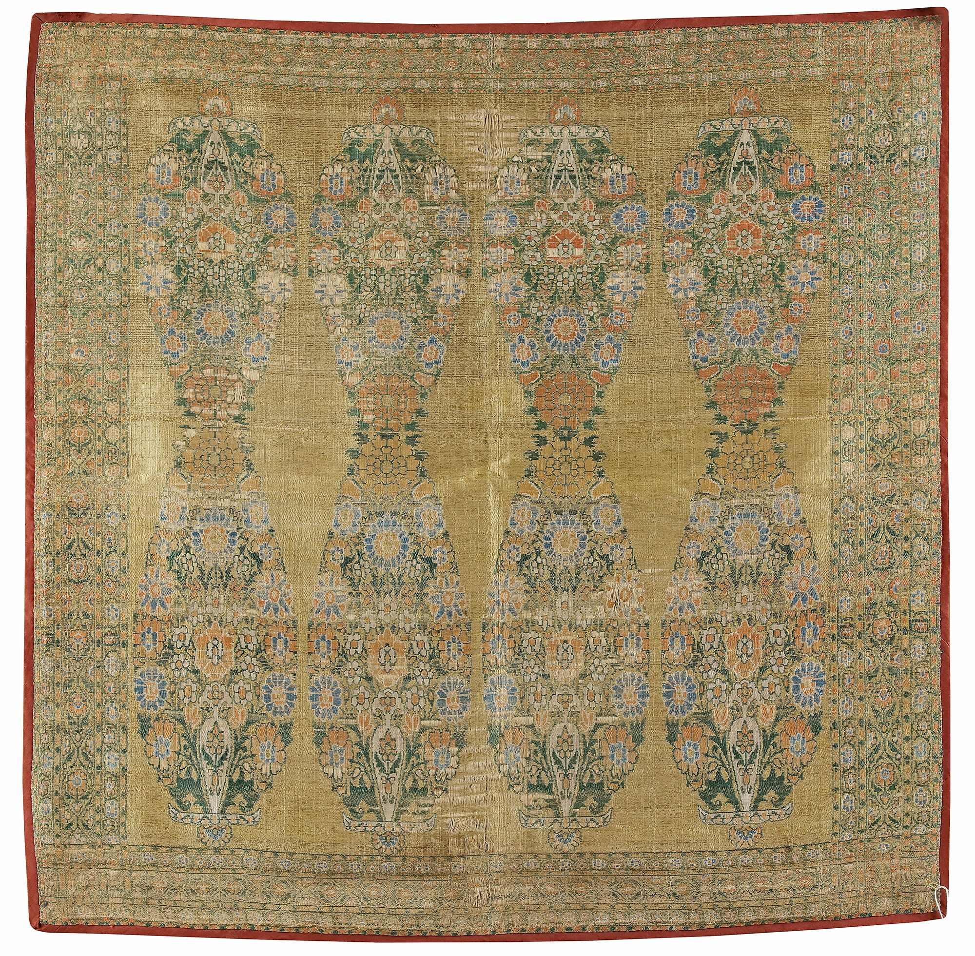 The bright gilt green ground woven with dense design of flower heads in different colours surrounded by foliage with floral border. 62 by 62 cm.