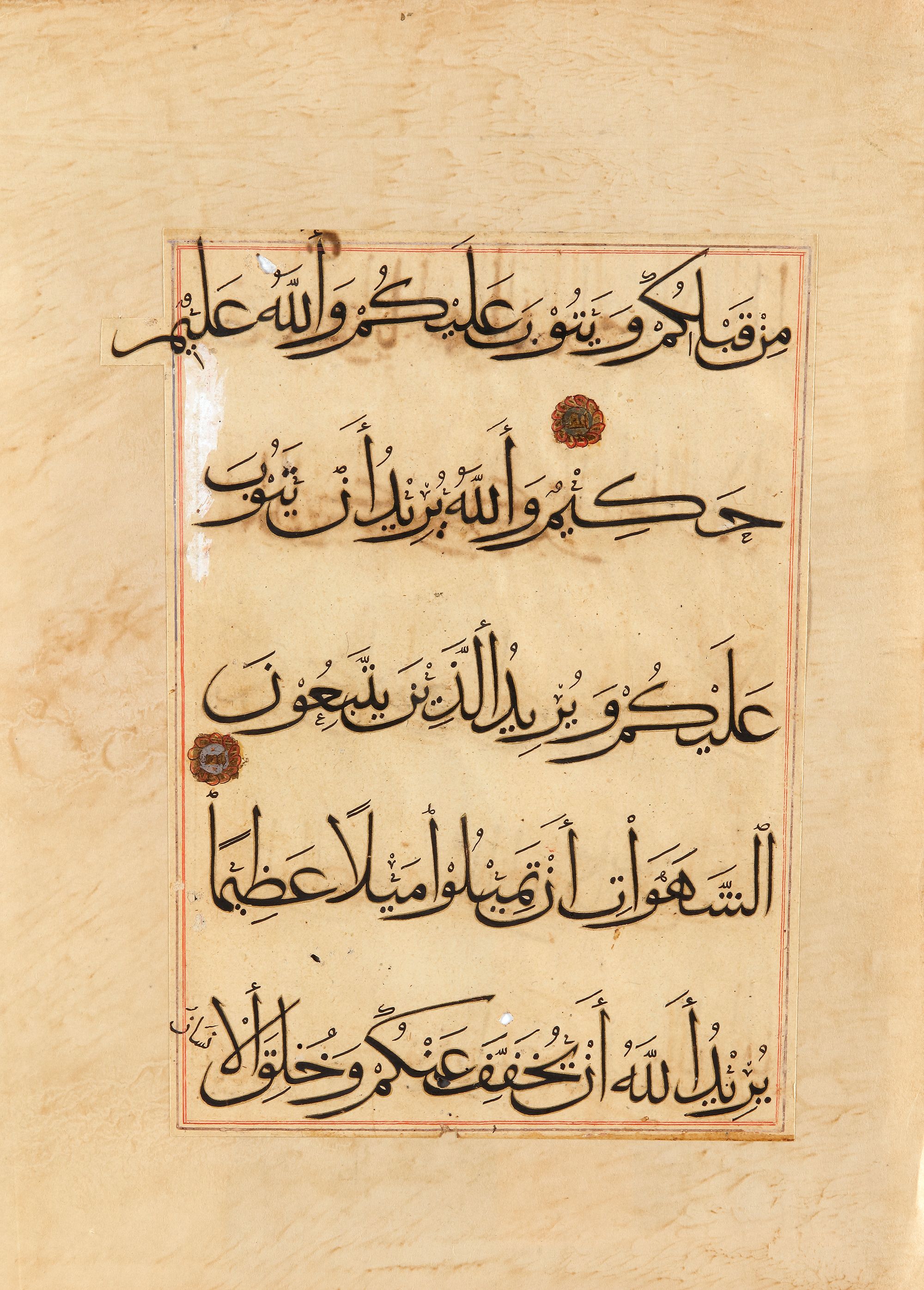 Arabic manuscript on paper. A single double leaf with 5 lines to each side, written in large elegant black thuluth muhaqqaq script outlined in gold. Gold and blue verse markers outlined in red, with diacritics and vowel points in black, all ruled in red and purple borders. Quran 4 surah An-Nisa’ v.26-v.29 Text panel: 19 by 27 cm. Folio: 29 by 40 cm.