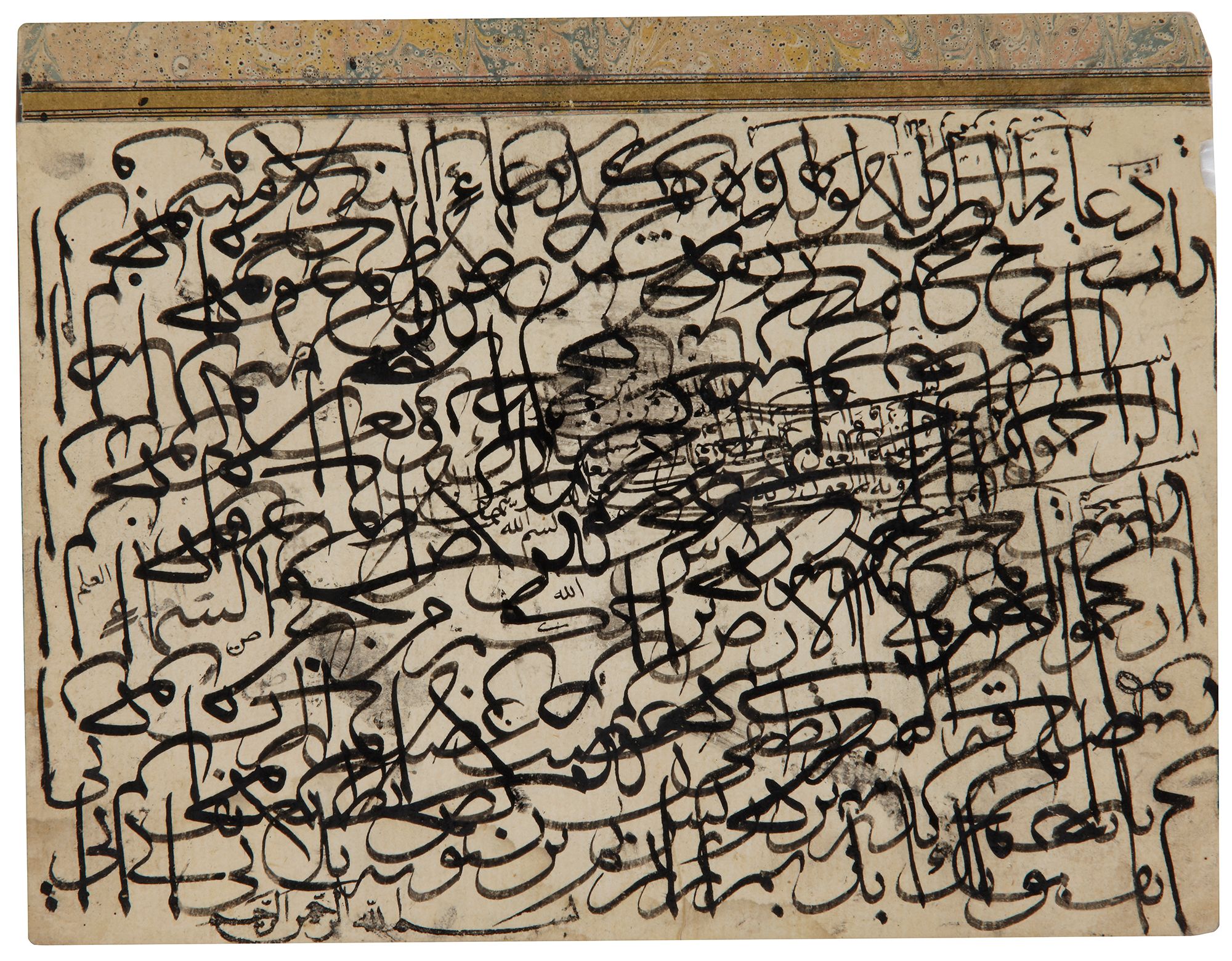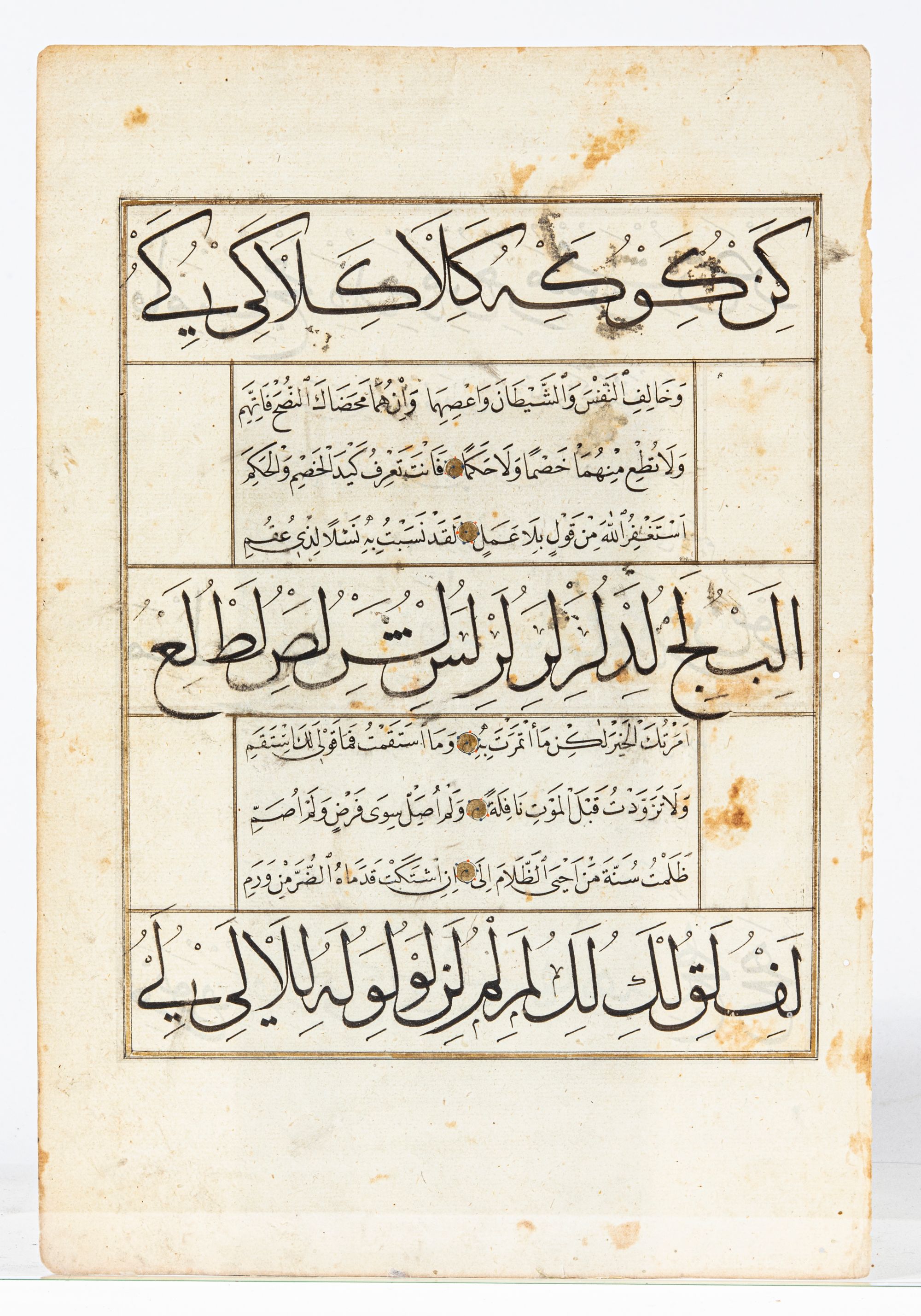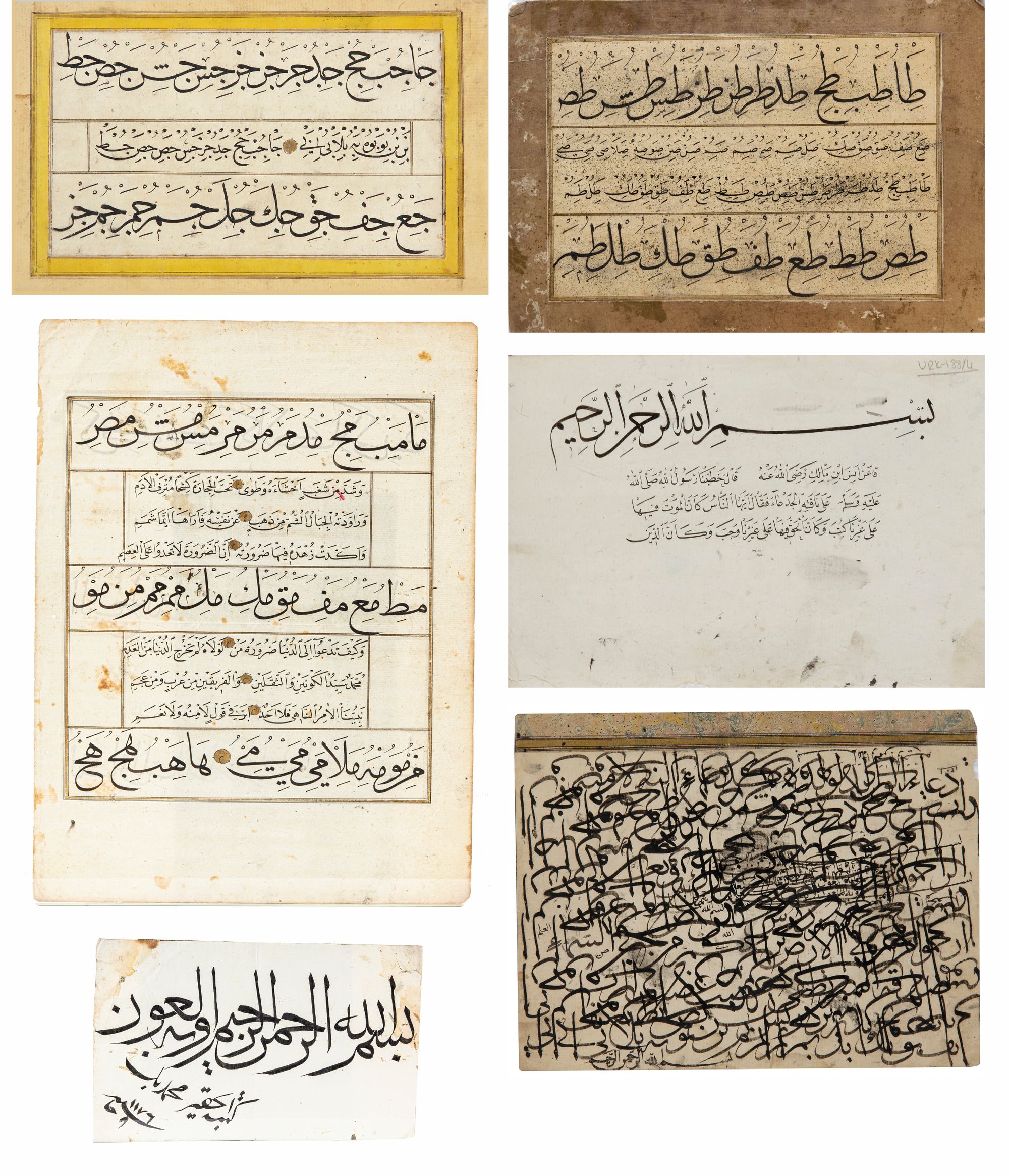 Including a saying of the Prophet, Arabic manuscript on paper, laid down between gold rules on colored or marbled paper. Each of the qitas with lines of large thuluth above and lines of smaller naskh script. Signatures of 1176 AH/1762 AD. largest: 31 by 21 cm., smallest: 13 by 20 cm.