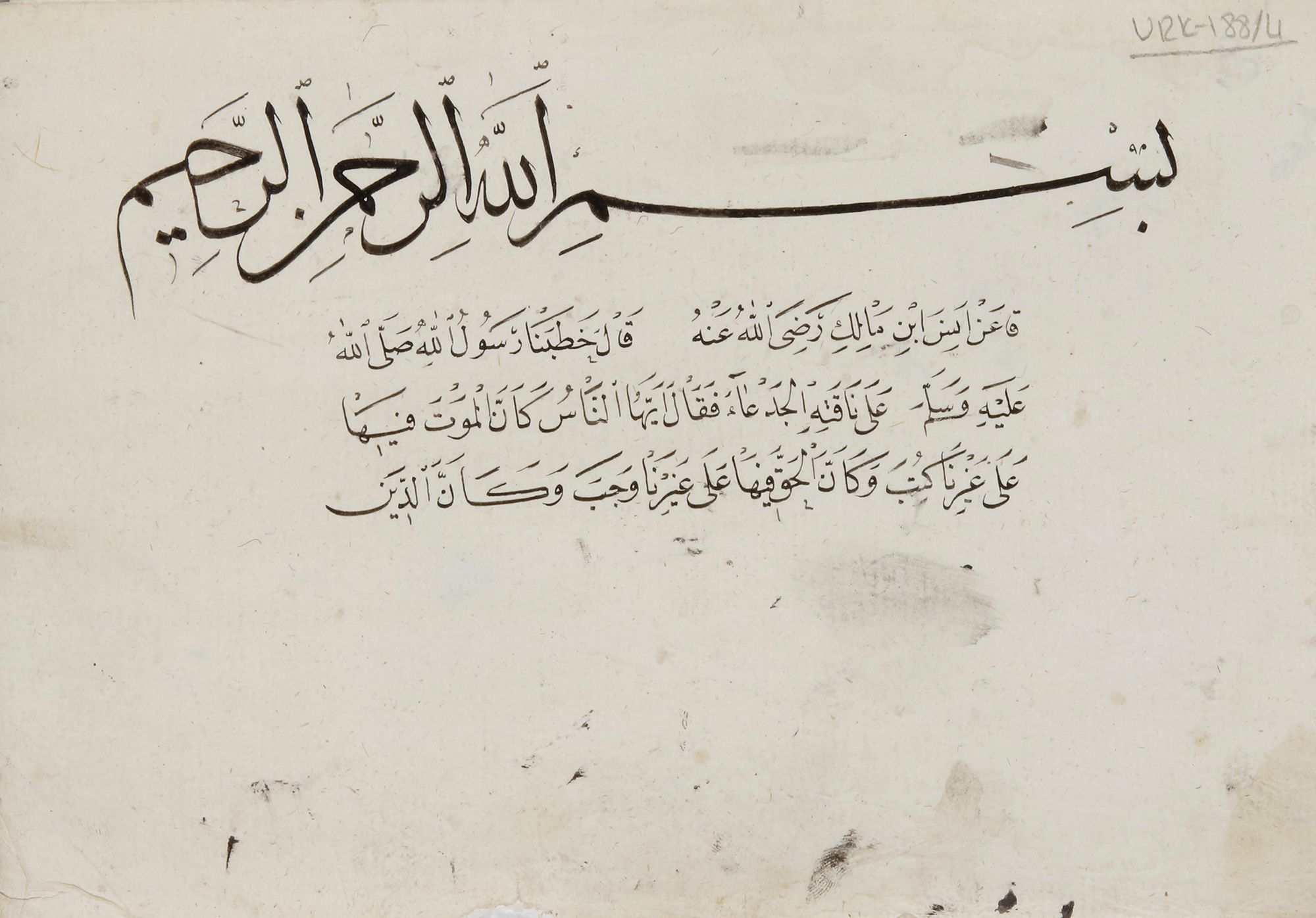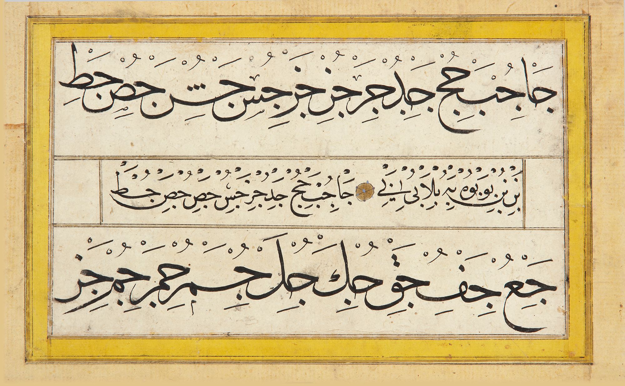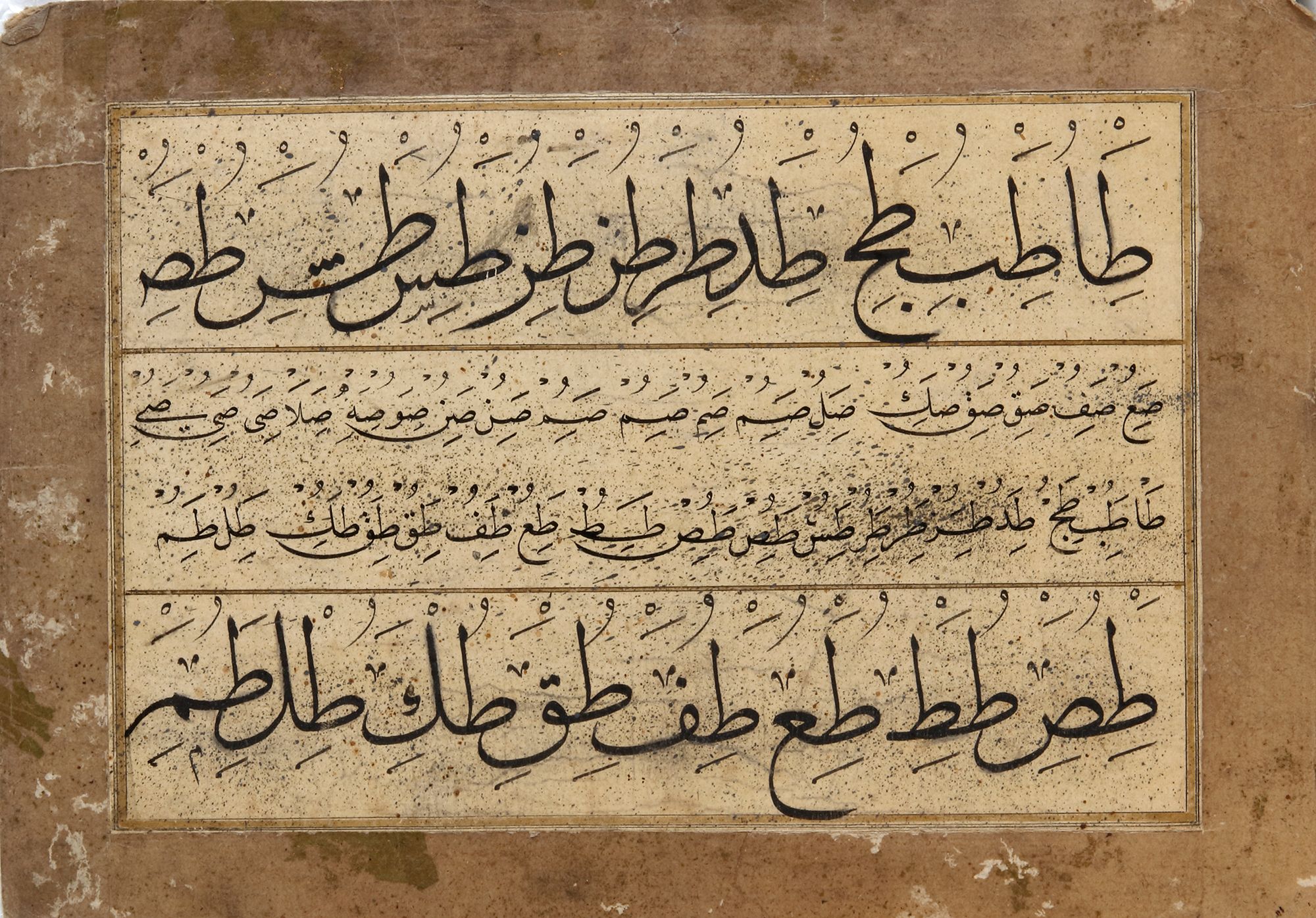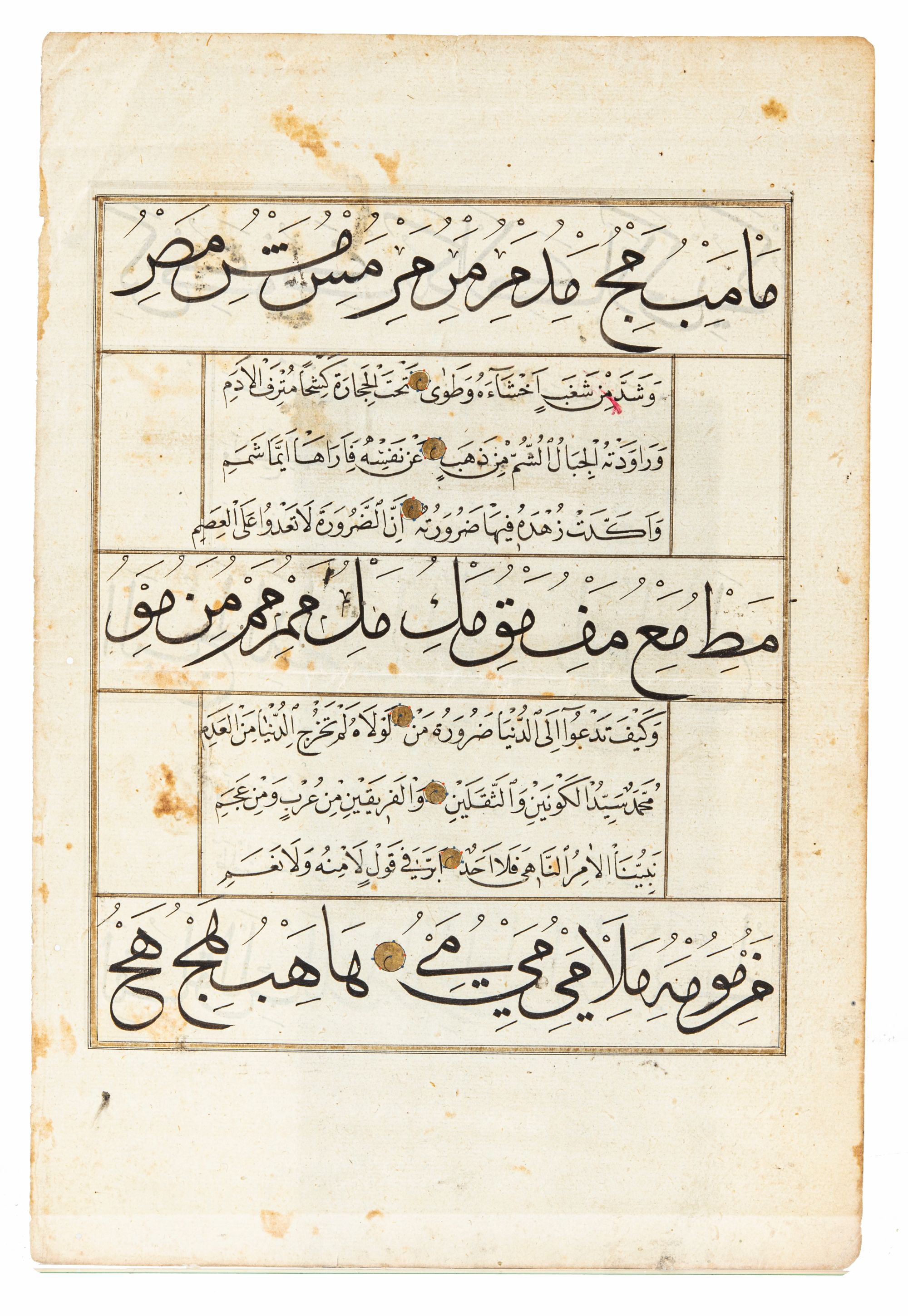 Including a saying of the Prophet, Arabic manuscript on paper, laid down between gold rules on colored or marbled paper. Each of the qitas with lines of large thuluth above and lines of smaller naskh script. Signatures of 1176 AH/1762 AD. largest: 31 by 21 cm., smallest: 13 by 20 cm.