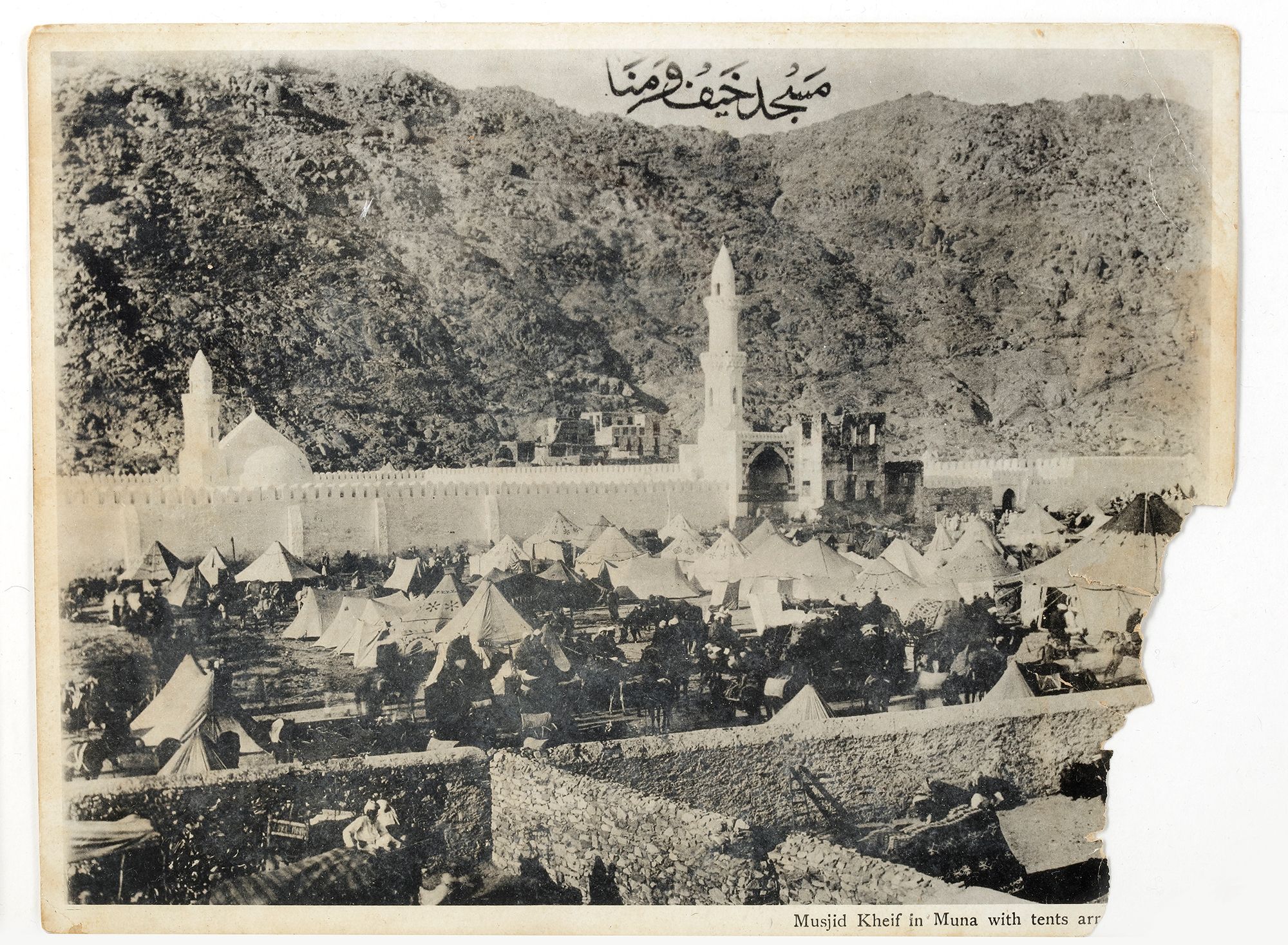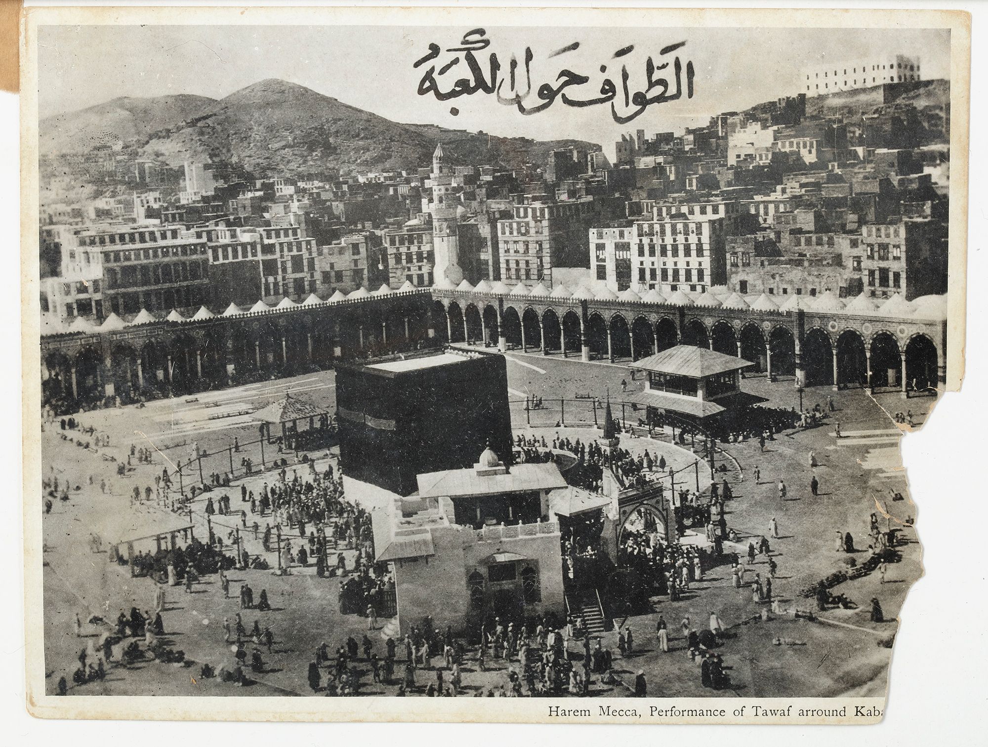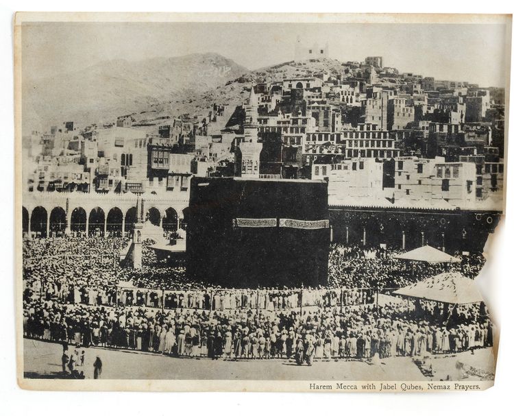 Seven old pictures of Mecca and Medina, during the performance of Tawaf, Al-Kabaa with Jabal Qubes in the background, Kheif Mosque in Muna, Jabal Arafat, and Harem Sharif in Medina.