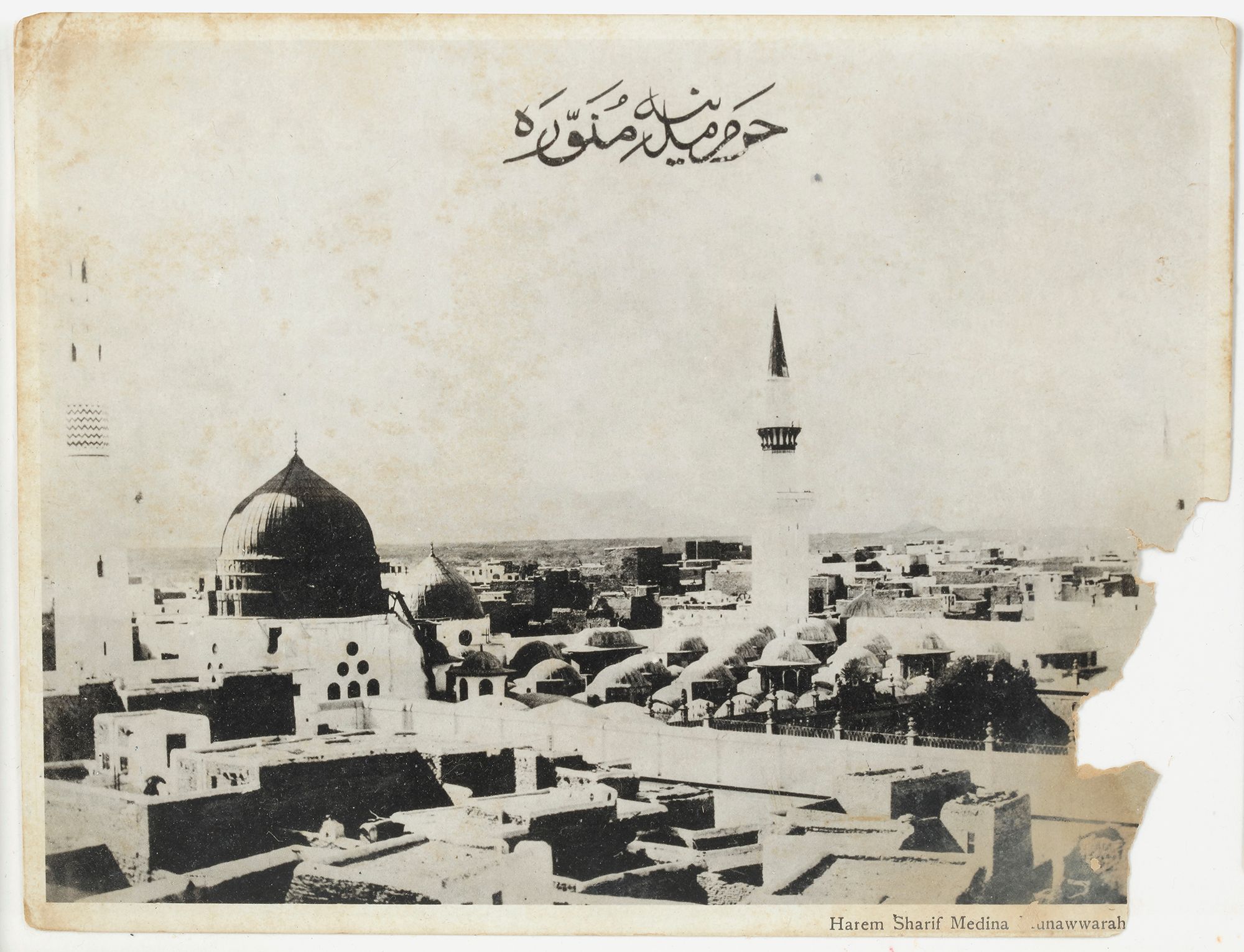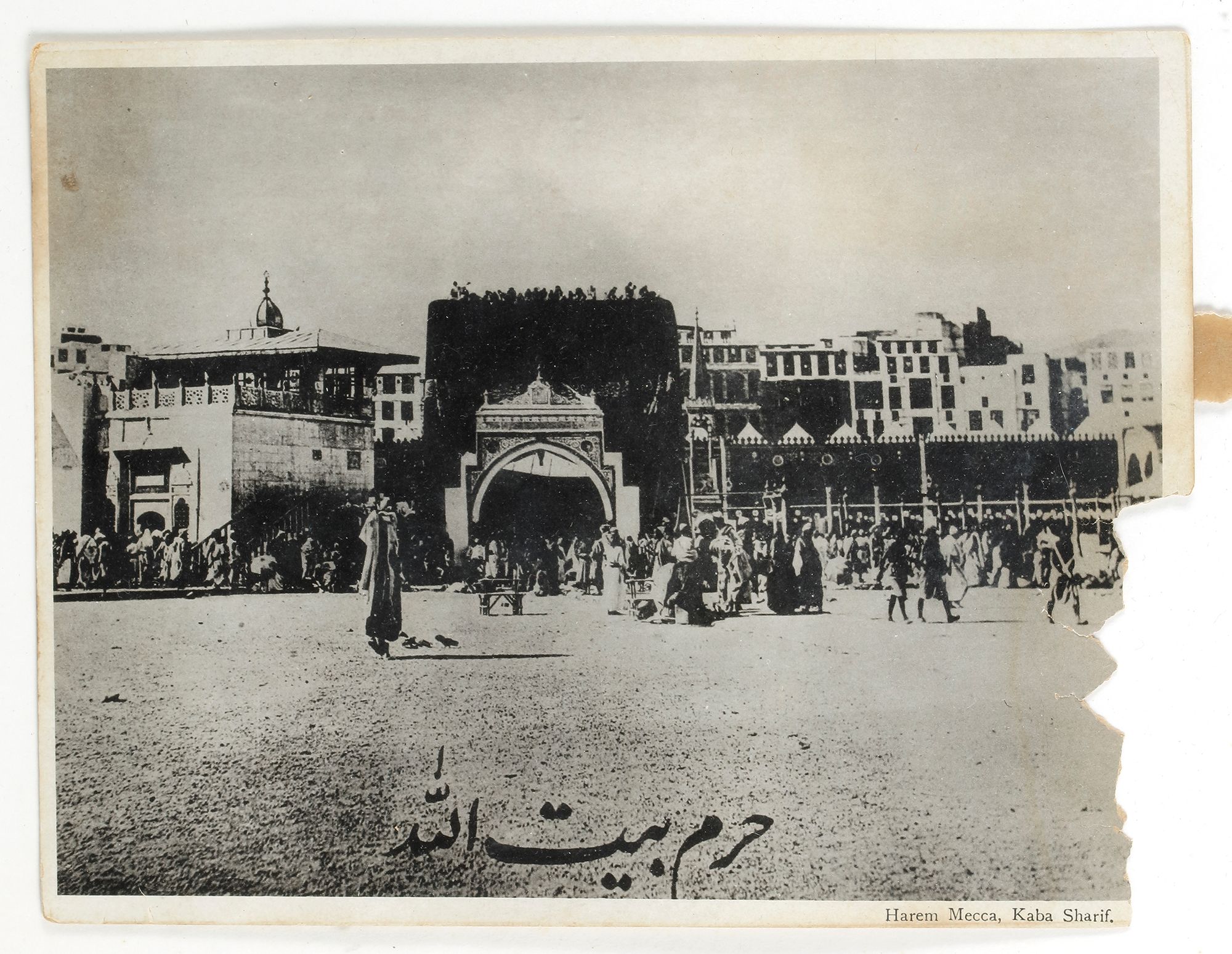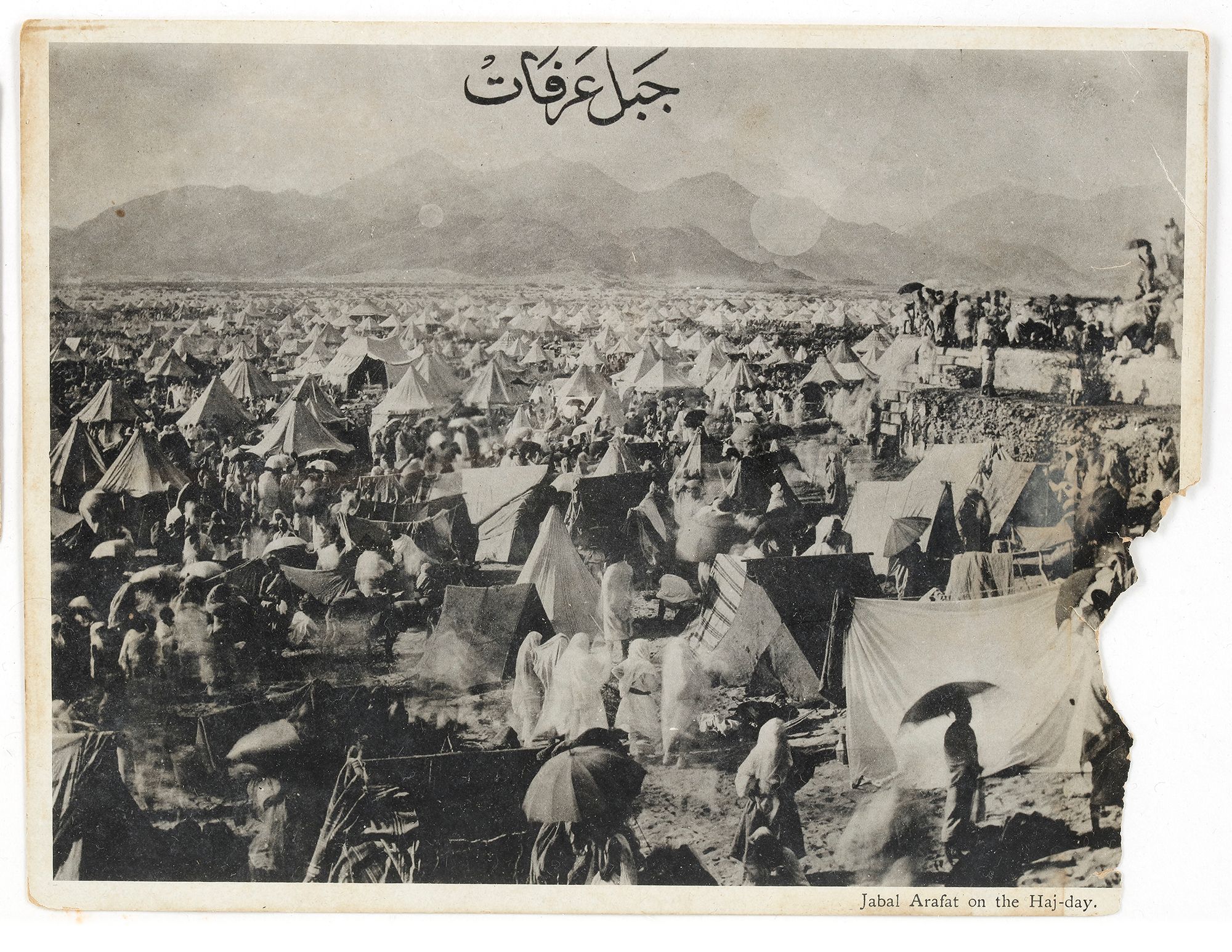 Seven old pictures of Mecca and Medina, during the performance of Tawaf, Al-Kabaa with Jabal Qubes in the background, Kheif Mosque in Muna, Jabal Arafat, and Harem Sharif in Medina.