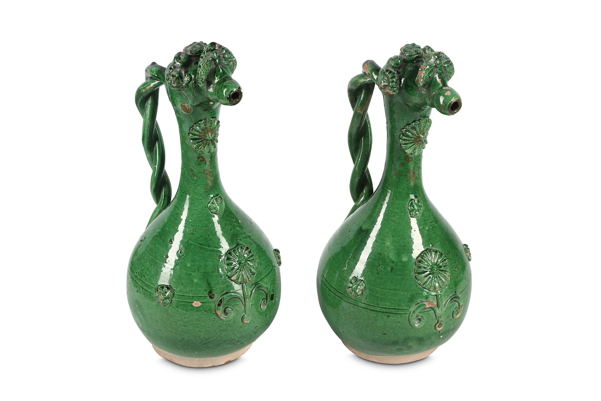 Each with bulbous body, long tapering neck and braided handle, the spout designed as a mythical beast's face, the body and spout decorated with applied rosettes.