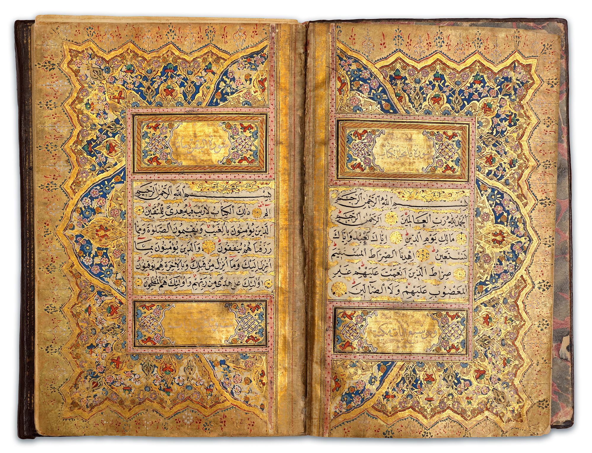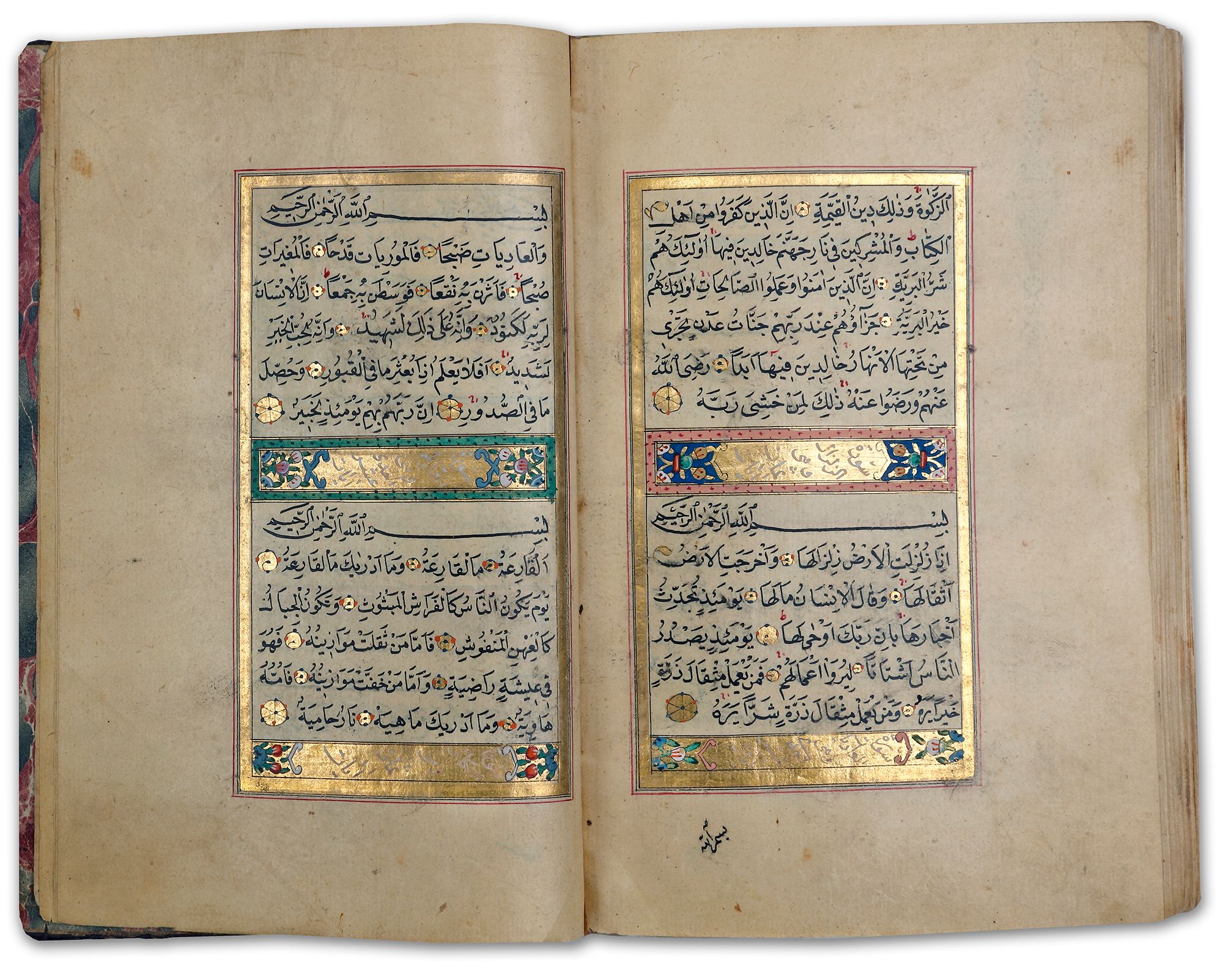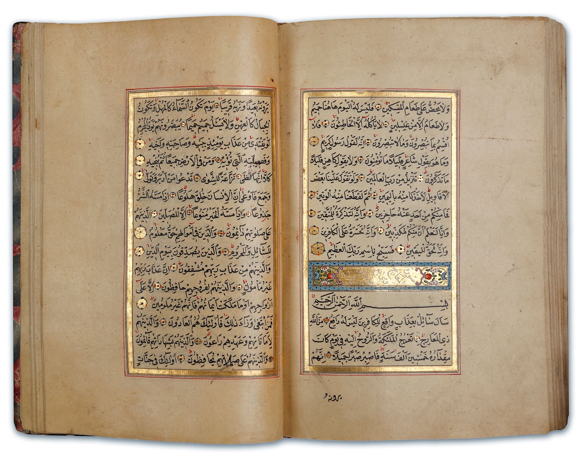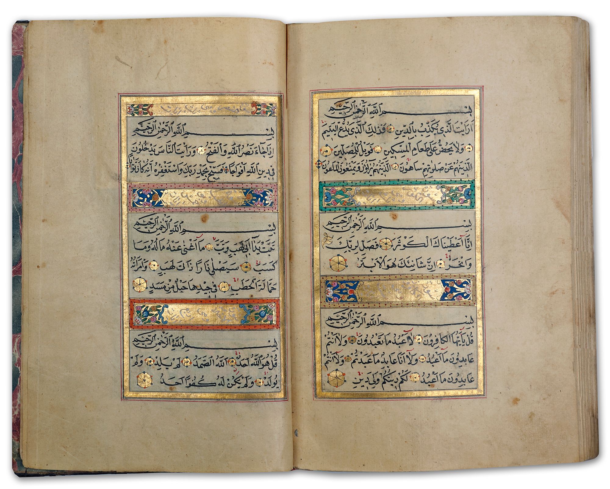 Arabic manuscript on paper, 322 leaves, 15 lines to the page written in neat naskh script in black ink with diacritics and vowel points in red and black ink, gold roundels between verses, inner margins ruled in two shades of gold and red, catchwords, surah headings written in thuluth in white within illuminated rectangular panels, one illuminated double-page frontispiece in colors and gold, occasional illuminated devices in wide outer margins, contemporary brown morocco, covers decorated with panels incorporating a diaper pattern in gold, with flap.
