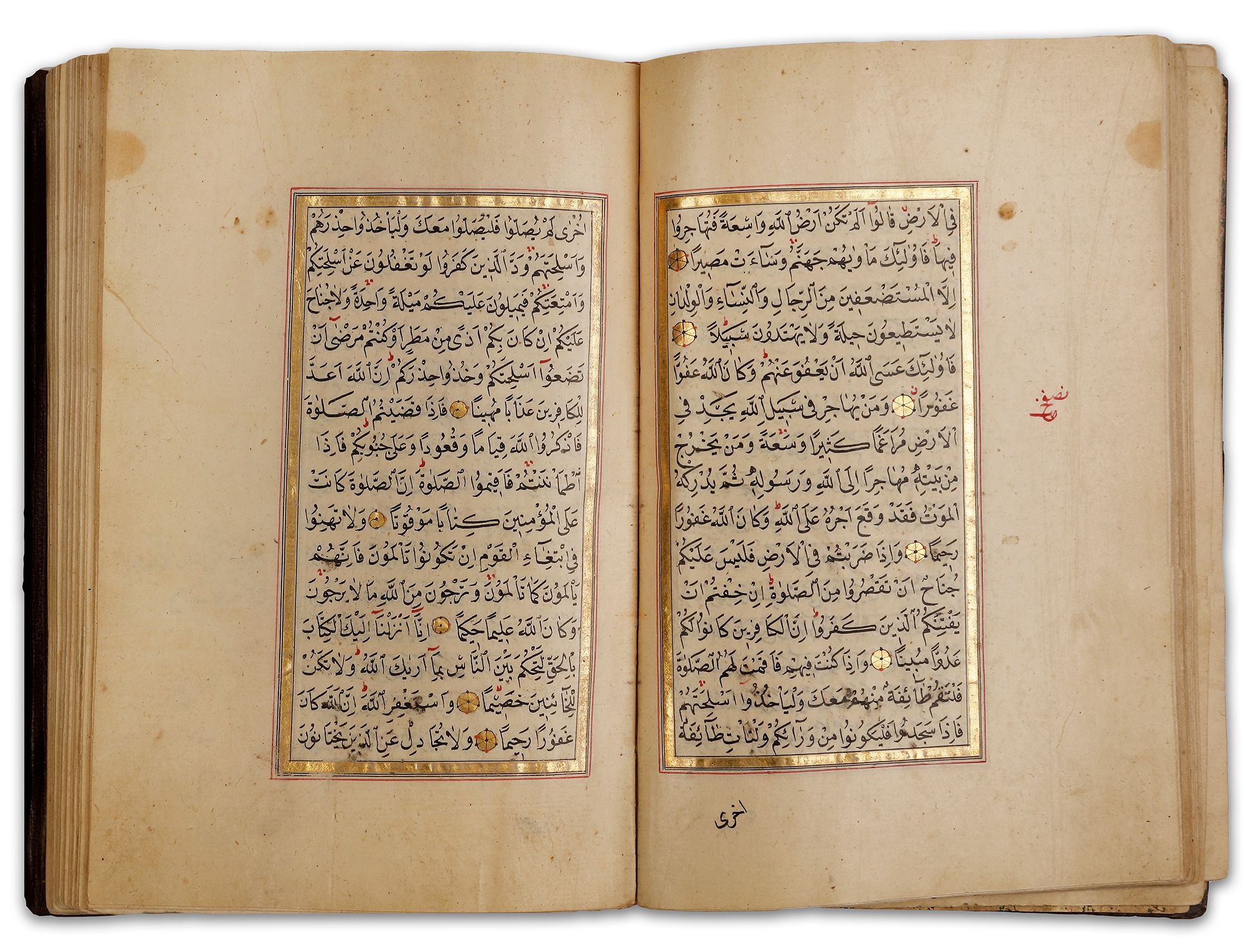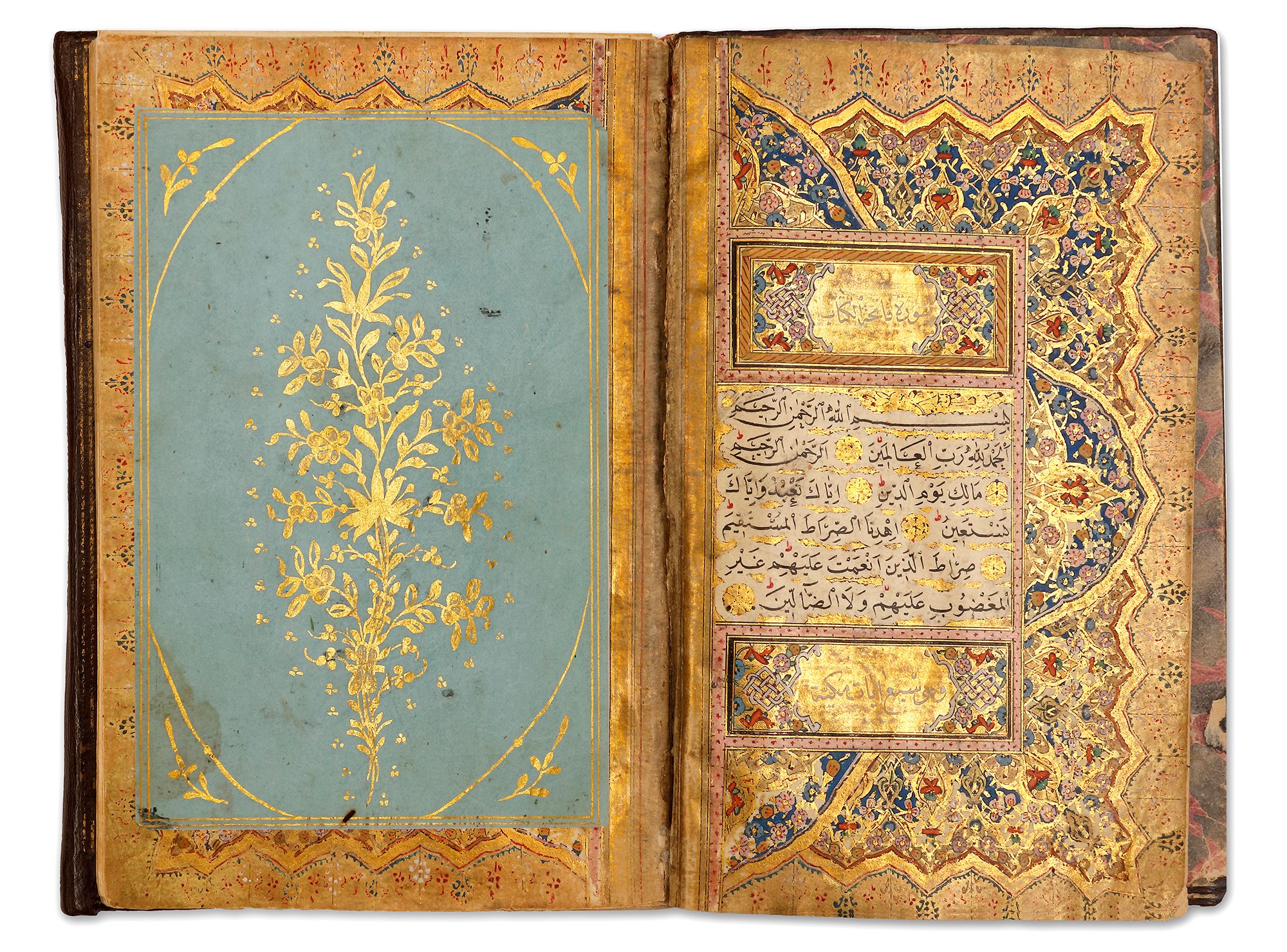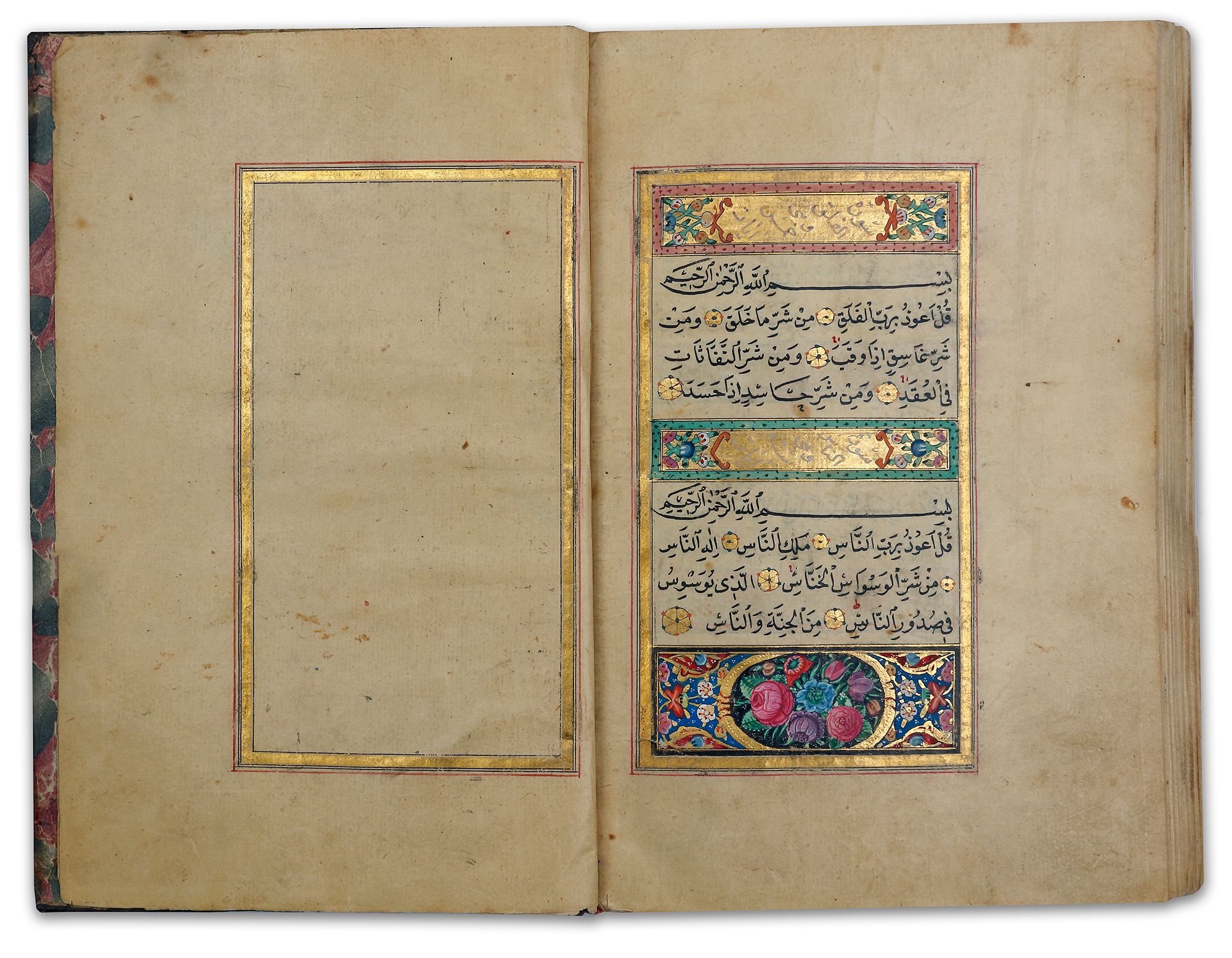 Arabic manuscript on paper, 322 leaves, 15 lines to the page written in neat naskh script in black ink with diacritics and vowel points in red and black ink, gold roundels between verses, inner margins ruled in two shades of gold and red, catchwords, surah headings written in thuluth in white within illuminated rectangular panels, one illuminated double-page frontispiece in colors and gold, occasional illuminated devices in wide outer margins, contemporary brown morocco, covers decorated with panels incorporating a diaper pattern in gold, with flap.