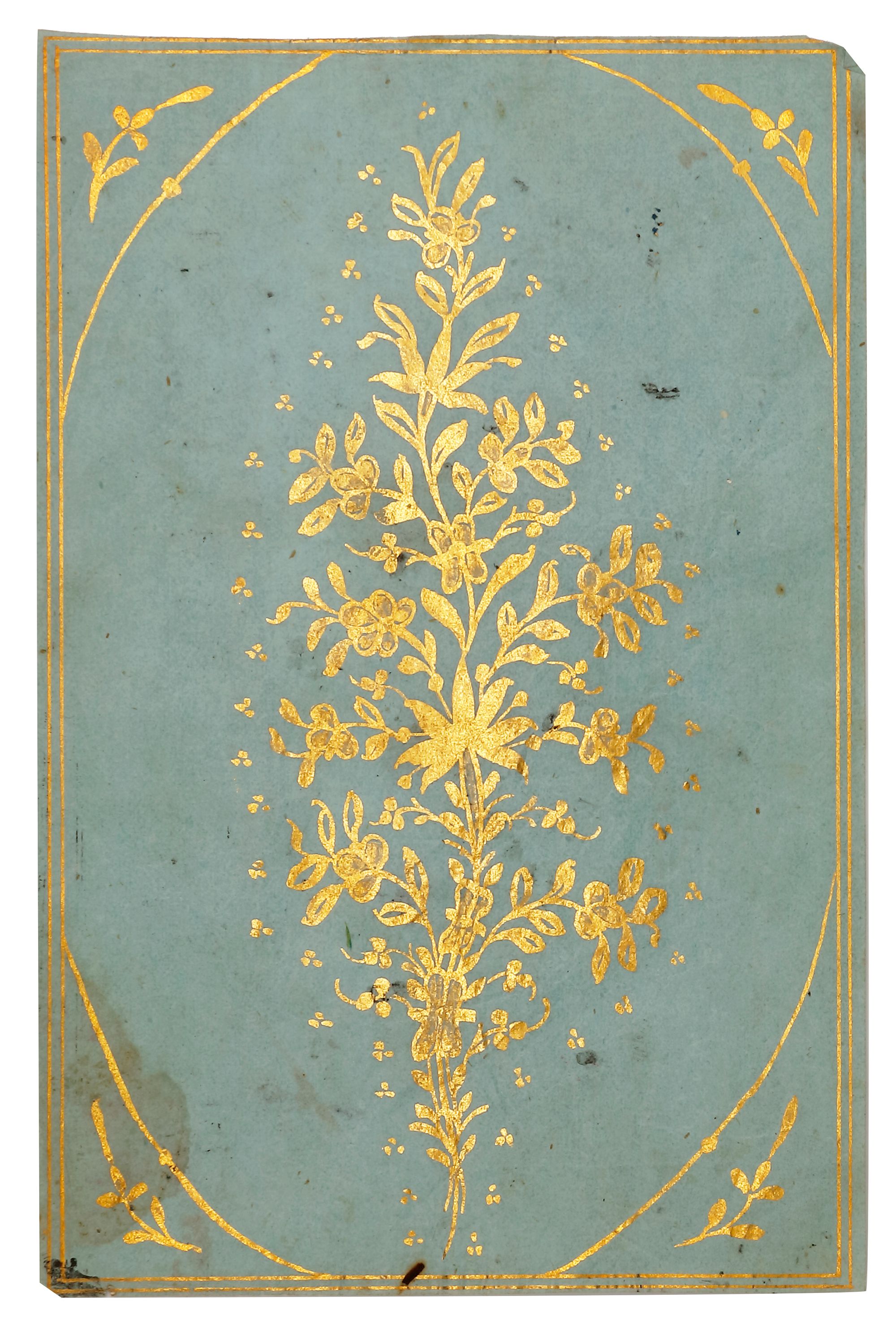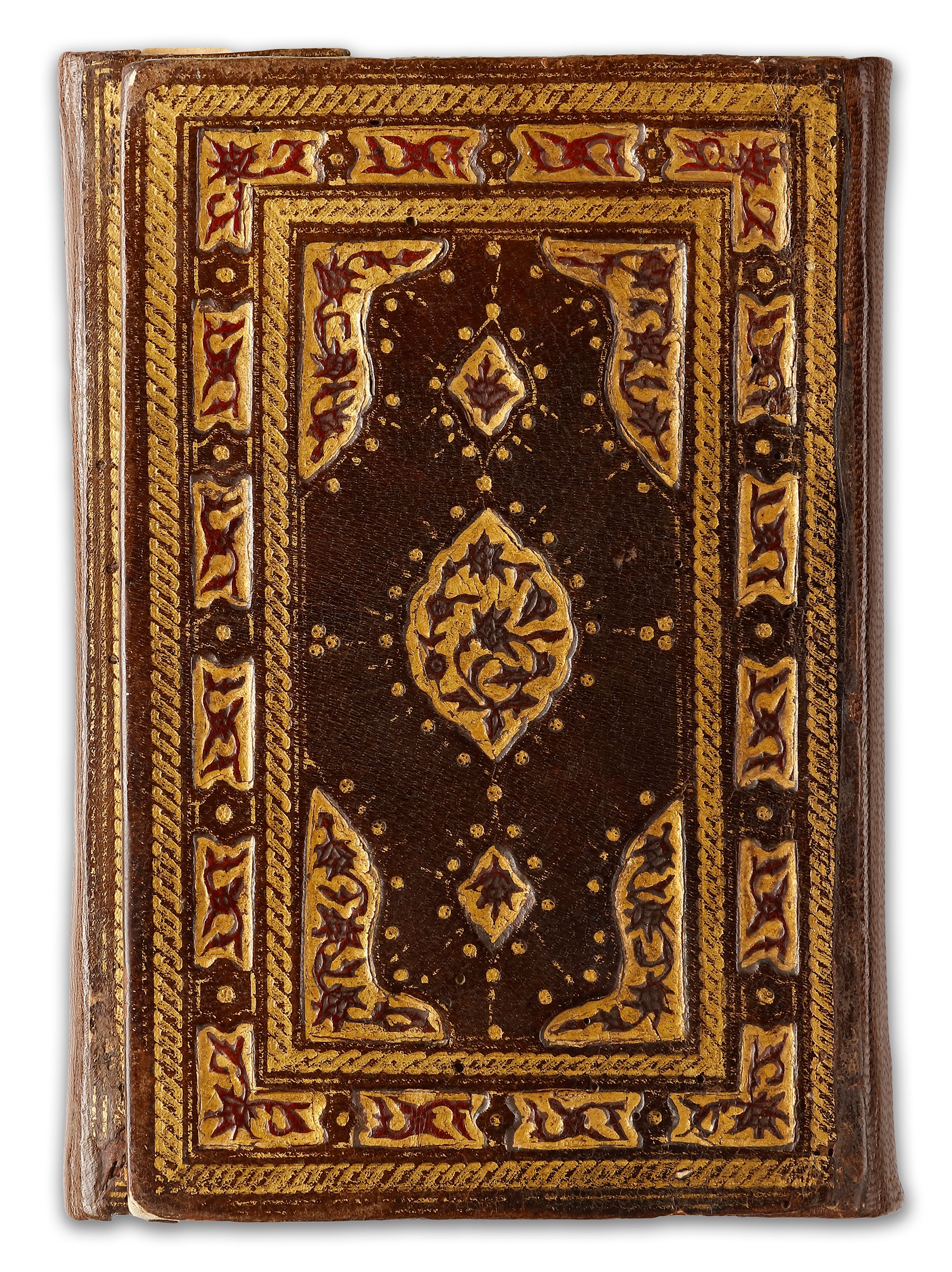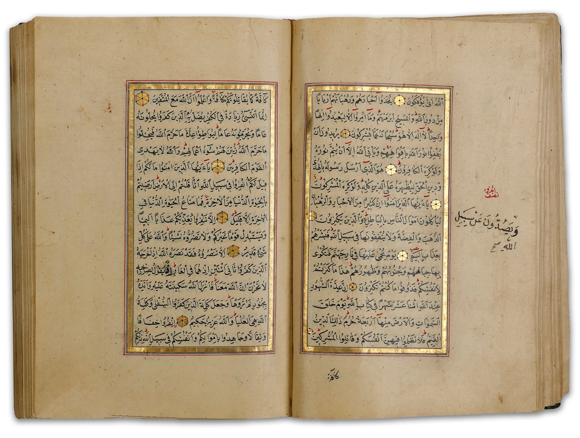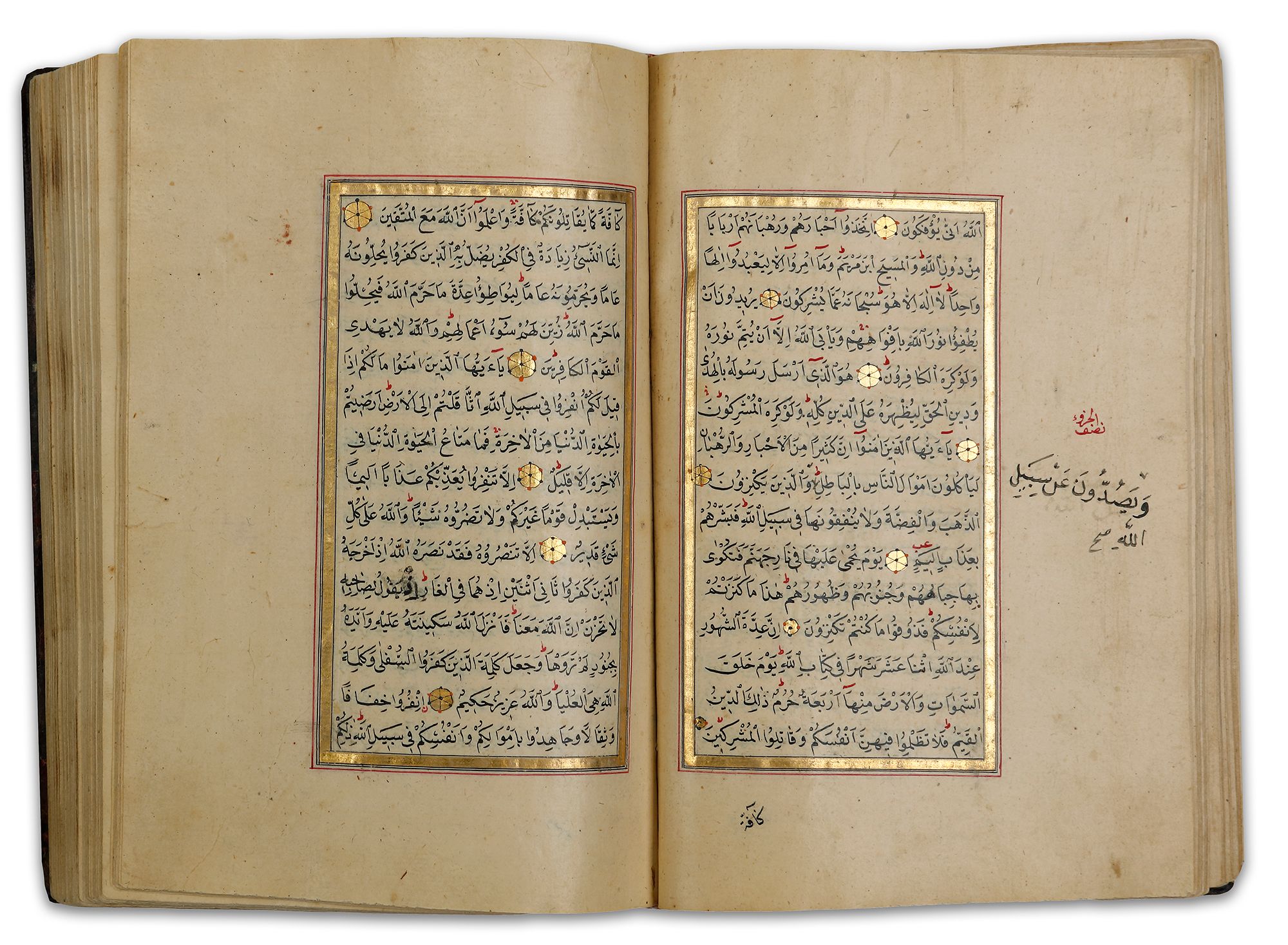 Arabic manuscript on paper, 322 leaves, 15 lines to the page written in neat naskh script in black ink with diacritics and vowel points in red and black ink, gold roundels between verses, inner margins ruled in two shades of gold and red, catchwords, surah headings written in thuluth in white within illuminated rectangular panels, one illuminated double-page frontispiece in colors and gold, occasional illuminated devices in wide outer margins, contemporary brown morocco, covers decorated with panels incorporating a diaper pattern in gold, with flap.