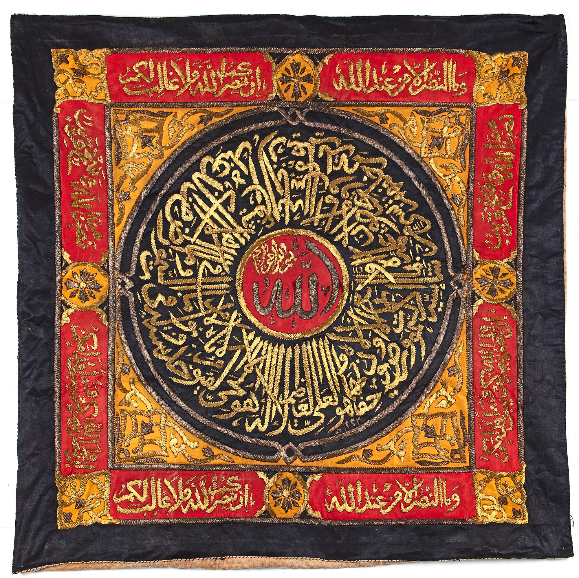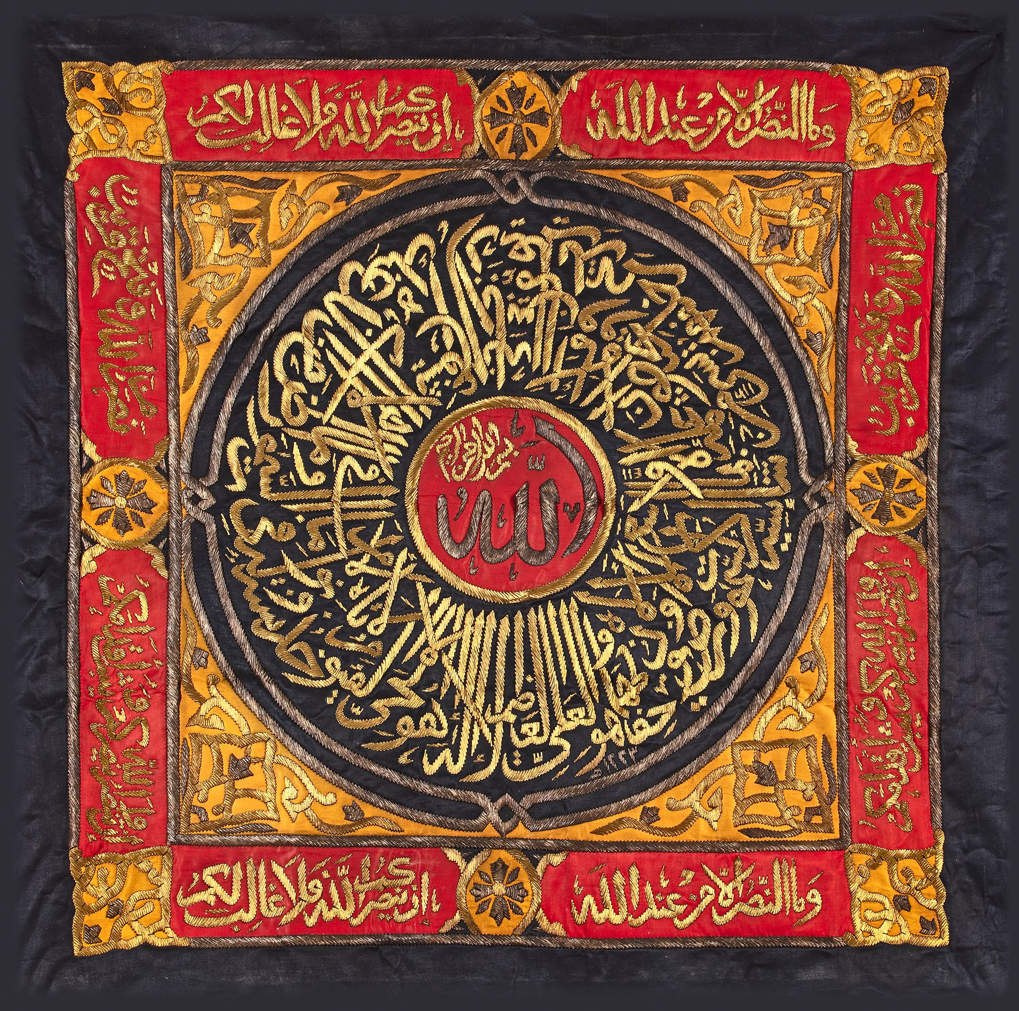 An Ottoman black panel embroidered with gilt and silver metal threads to the centre with the word 'ALLAH' surrounded by Quran 2 surah Al-Baqraa The Throne Verse (آيَة الْكُرْسِي, ʾāyat al-kursī) the 255th verse.